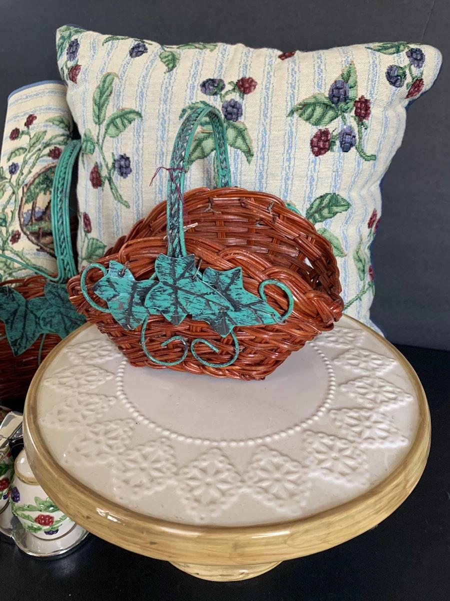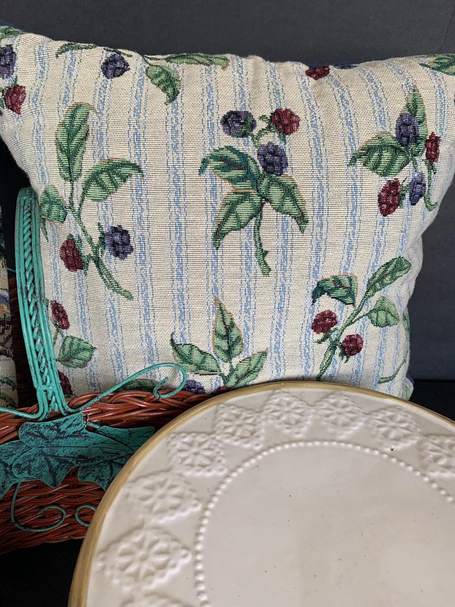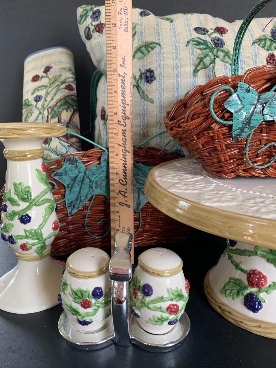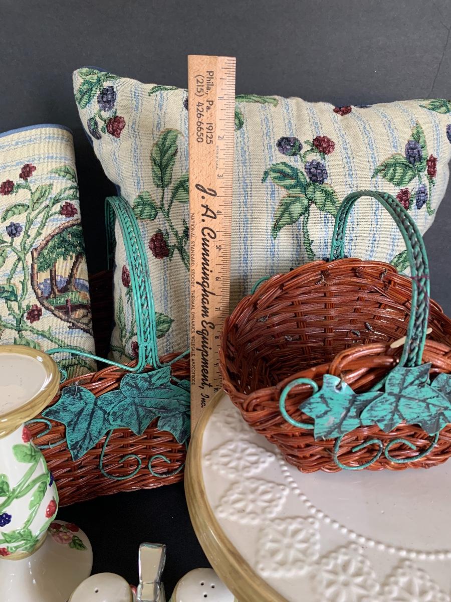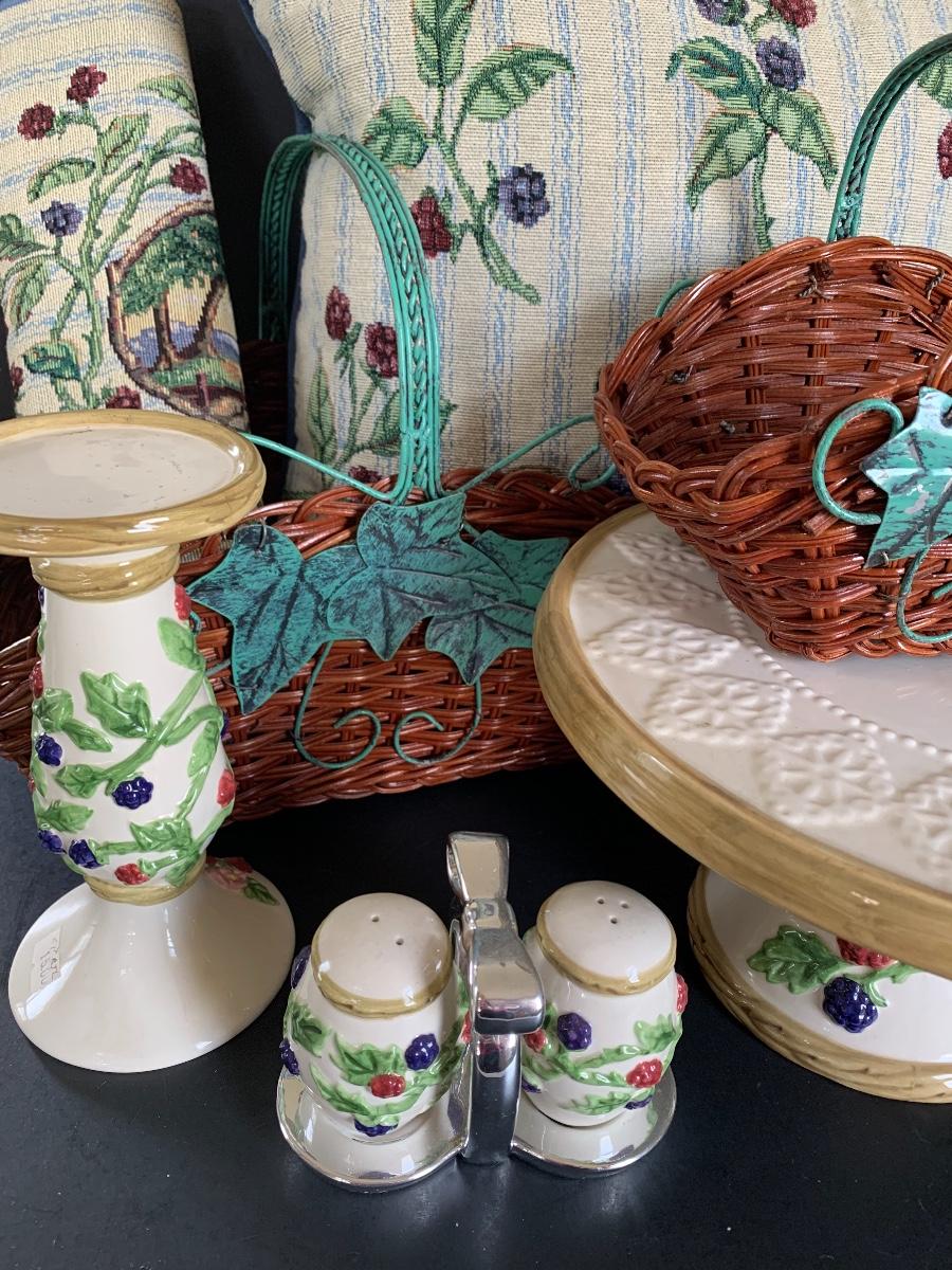 Raspberry Themed Cake Plate, Jam Salt & Pepper, Candle Holder, Pillow and Table Runner. Ivy and Wicker Baskets to complete the table make over.