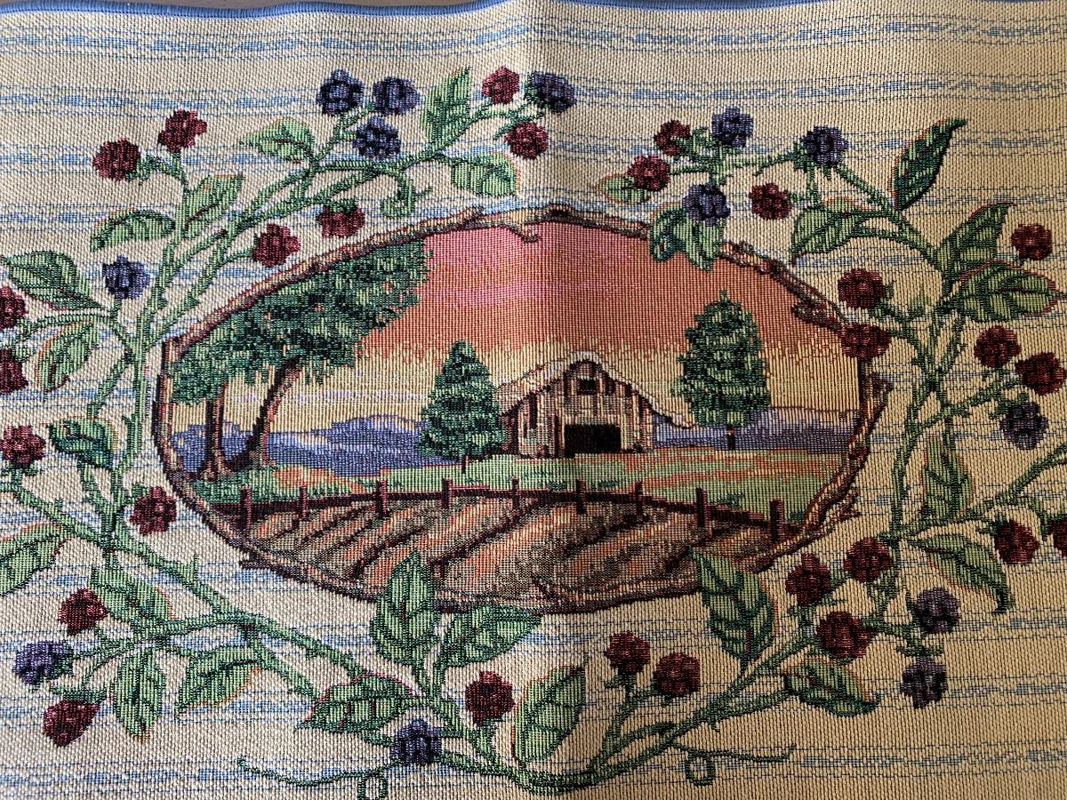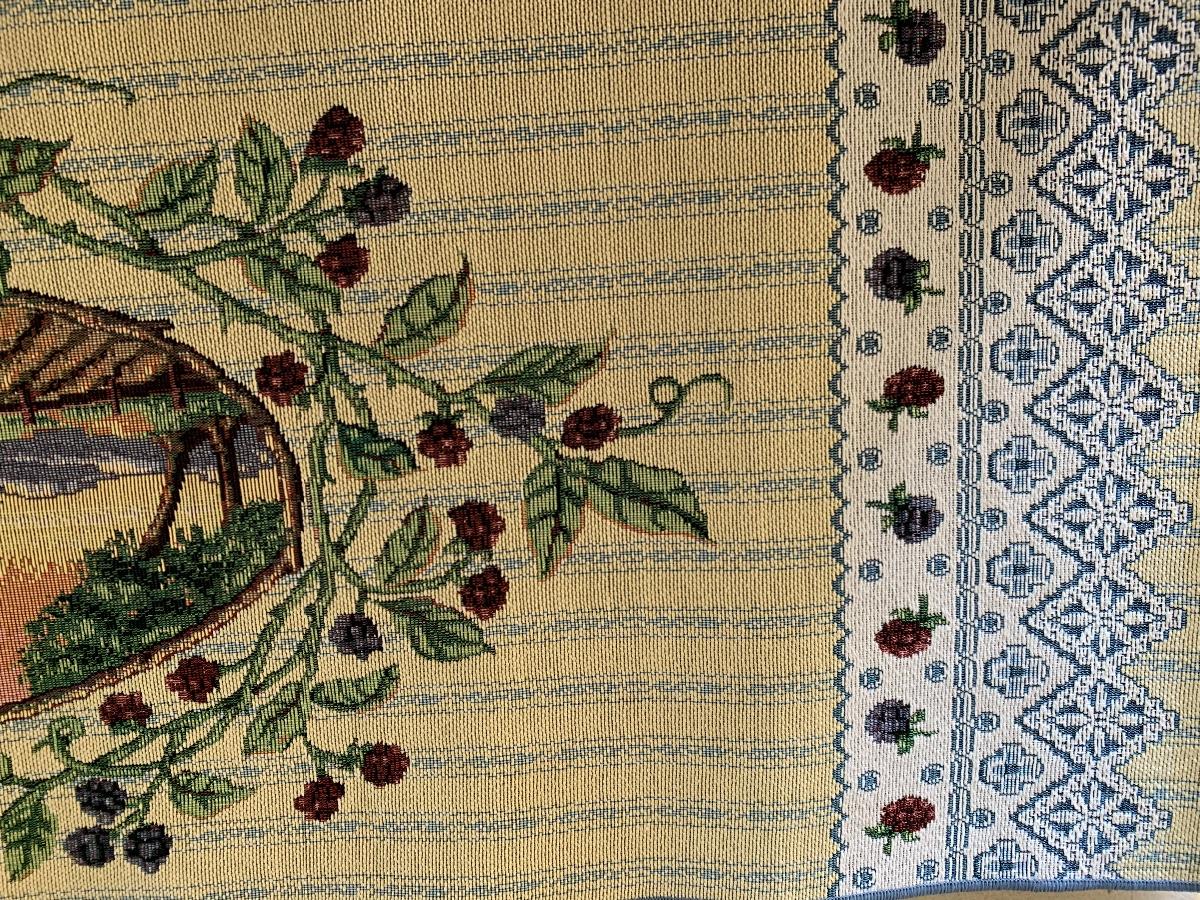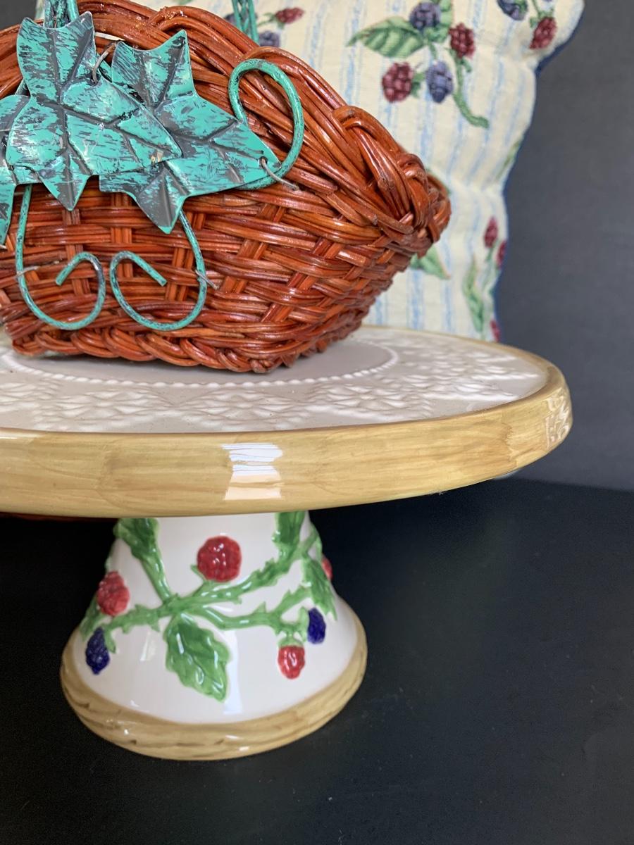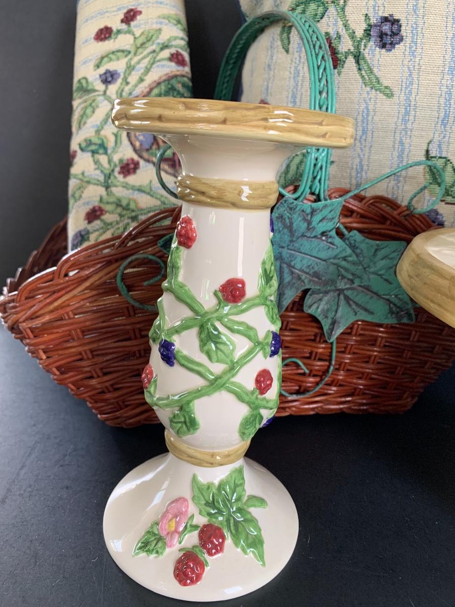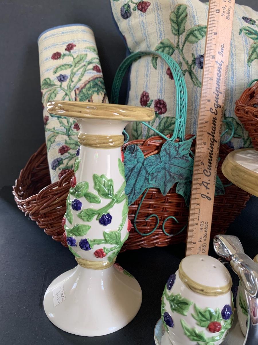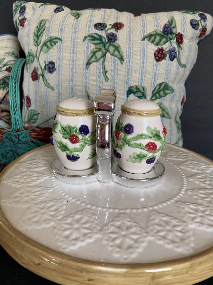 Raspberry Themed Cake Plate, Jam Salt & Pepper, Candle Holder, Pillow and Table Runner. Ivy and Wicker Baskets to complete the table make over.