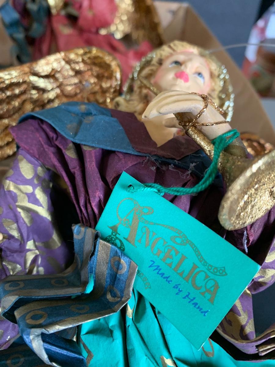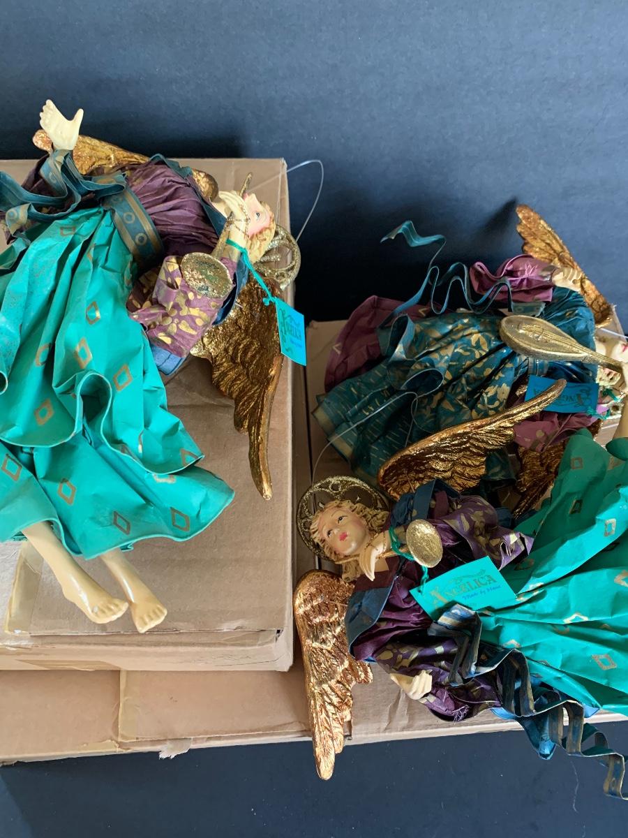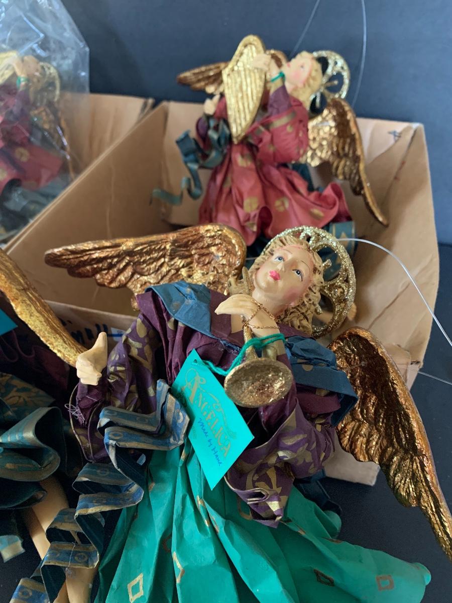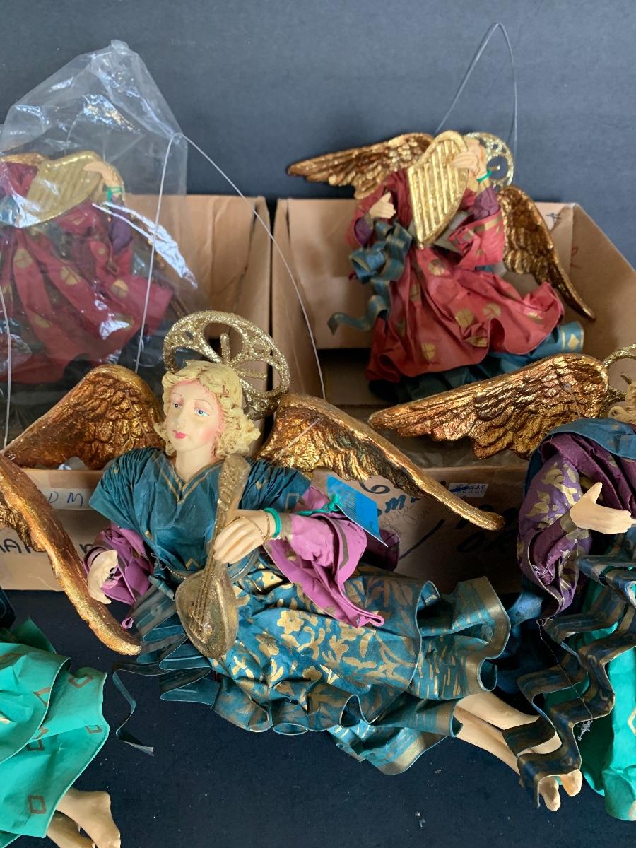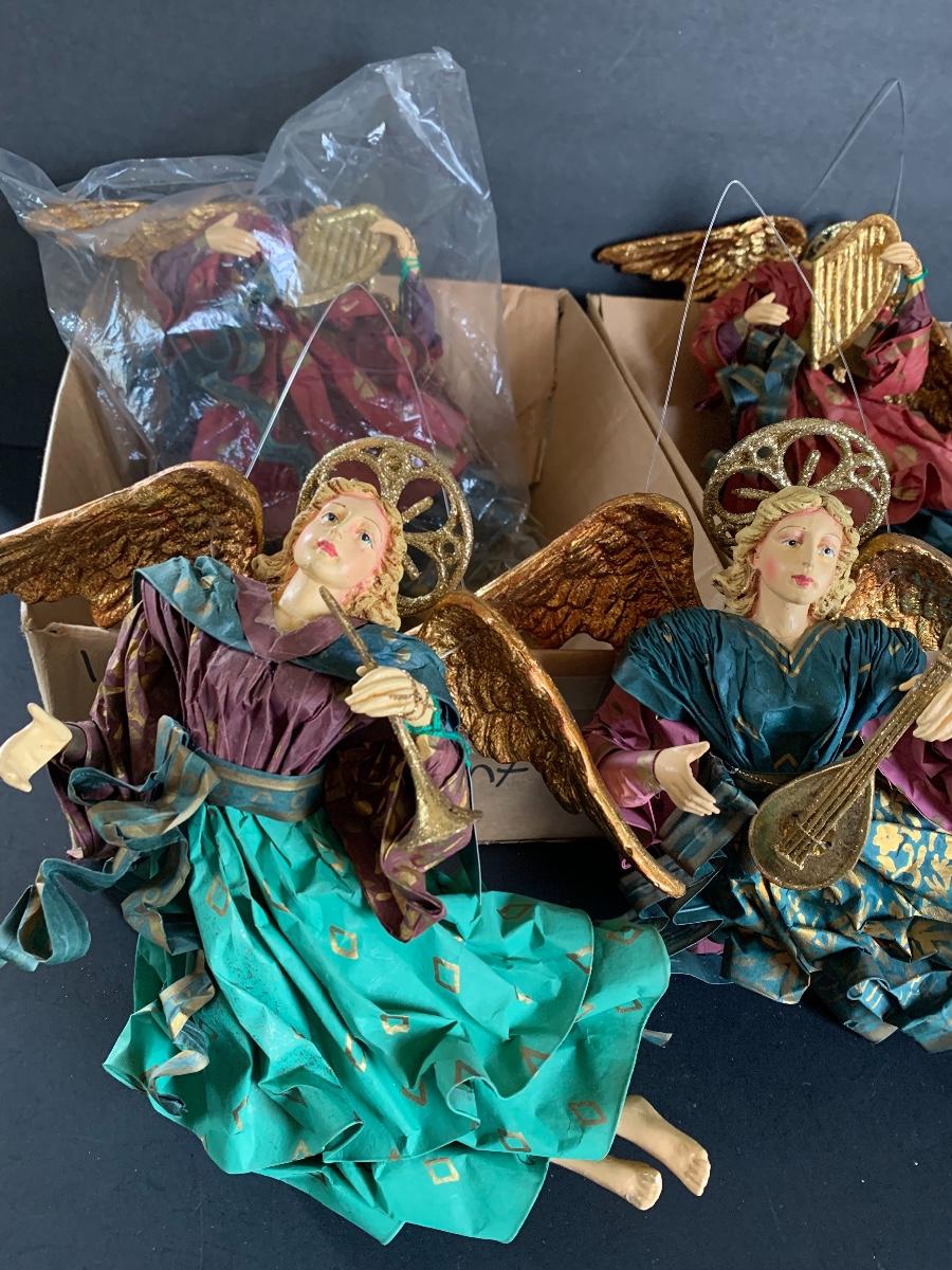 Dept 56 beautiful hanging angels comes with boxes. Please note some boxes make have condition issues that are not pictured. A couple of the halos will need to be re glued.