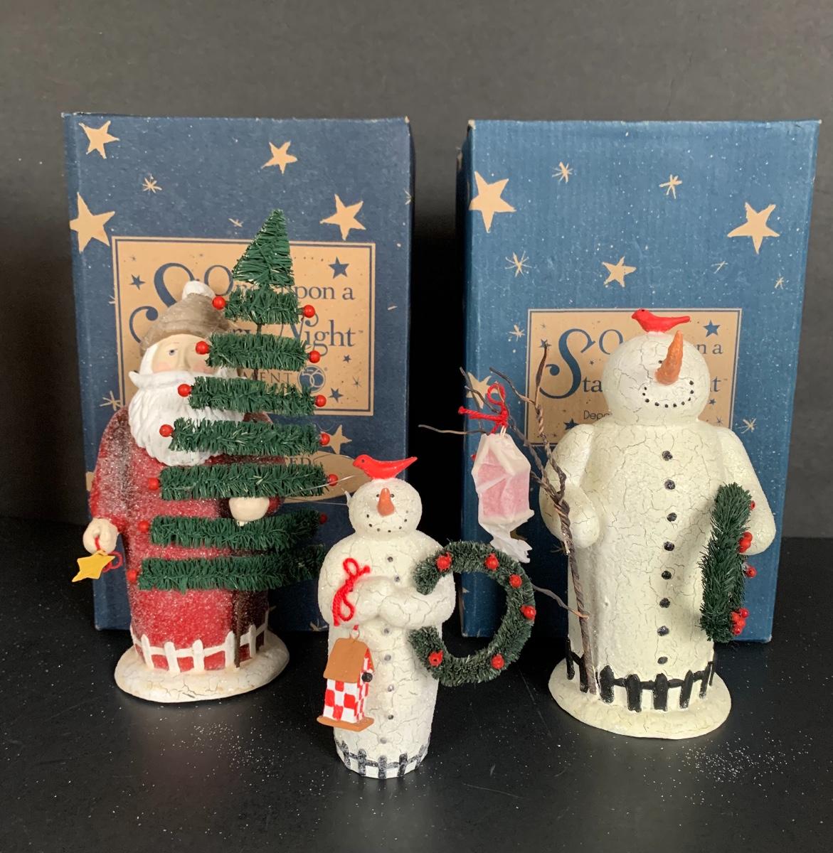Dept 56 One Upon a Starry Night Ornaments. Santa & Snowman have boxes however boxes may have condition issues.