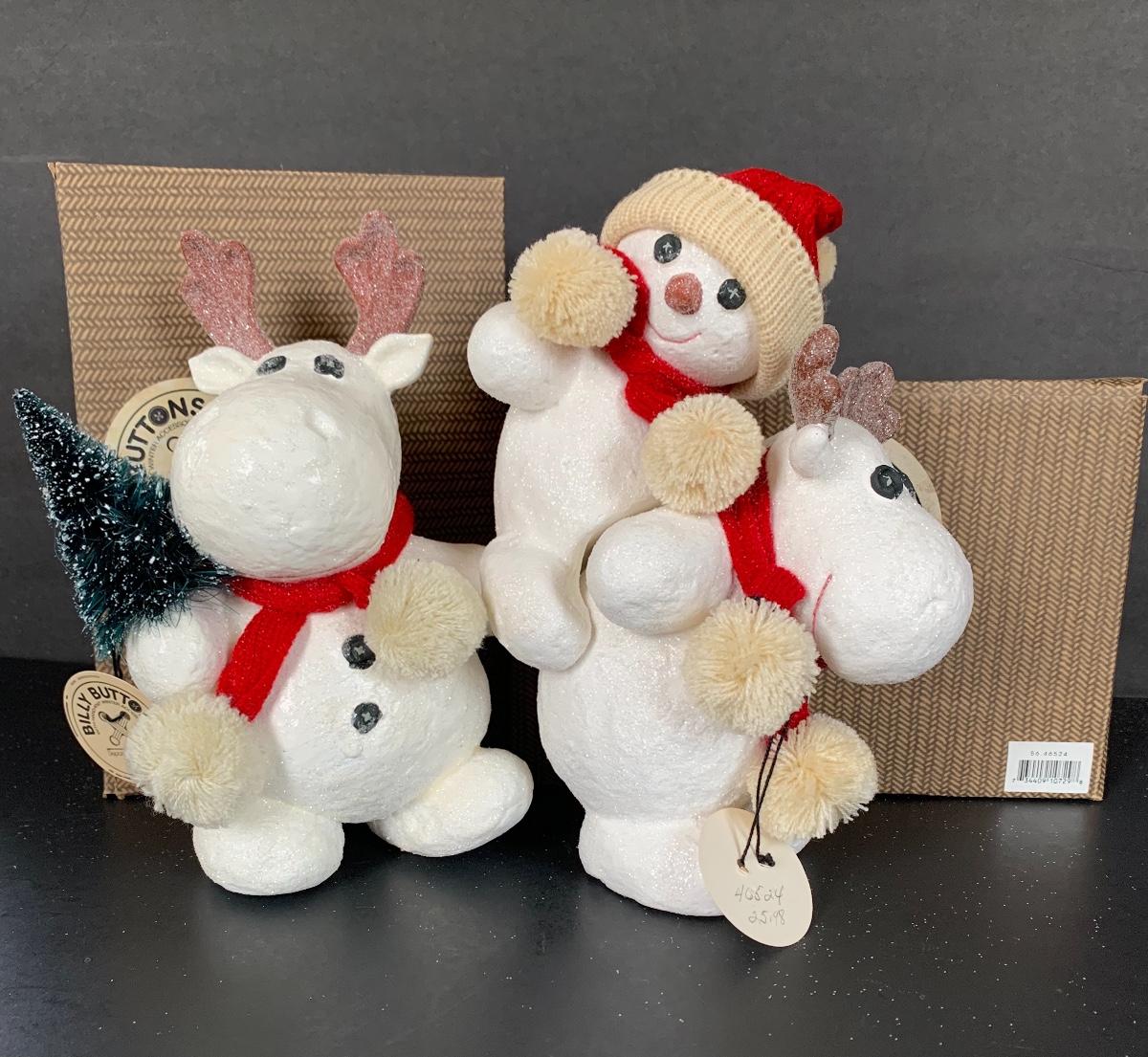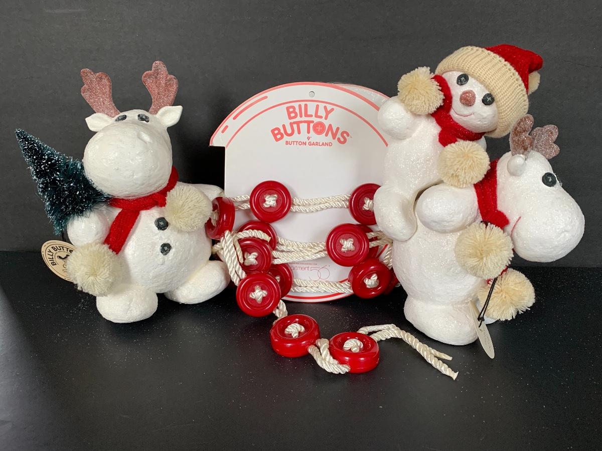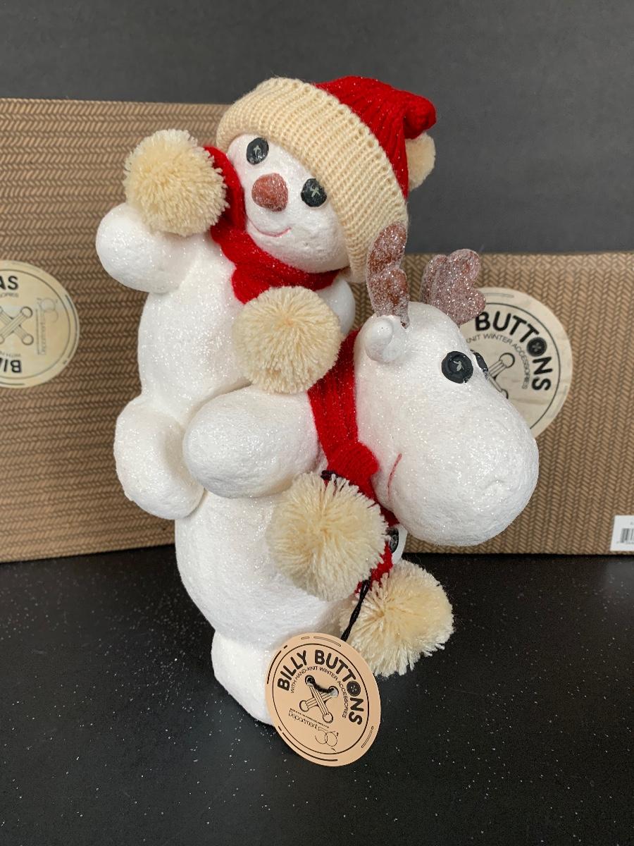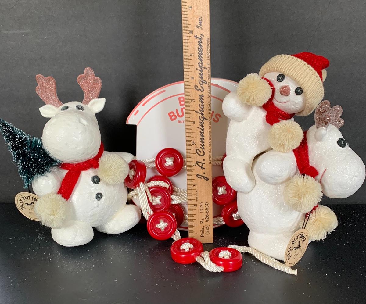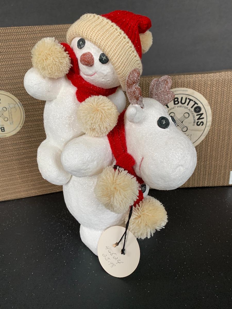 Billy Buttons DEPT DEPARTMENT 56 Piggyback Snowman, Reindeer with Tree along with two strands of 9' Billy Buttons Garland.