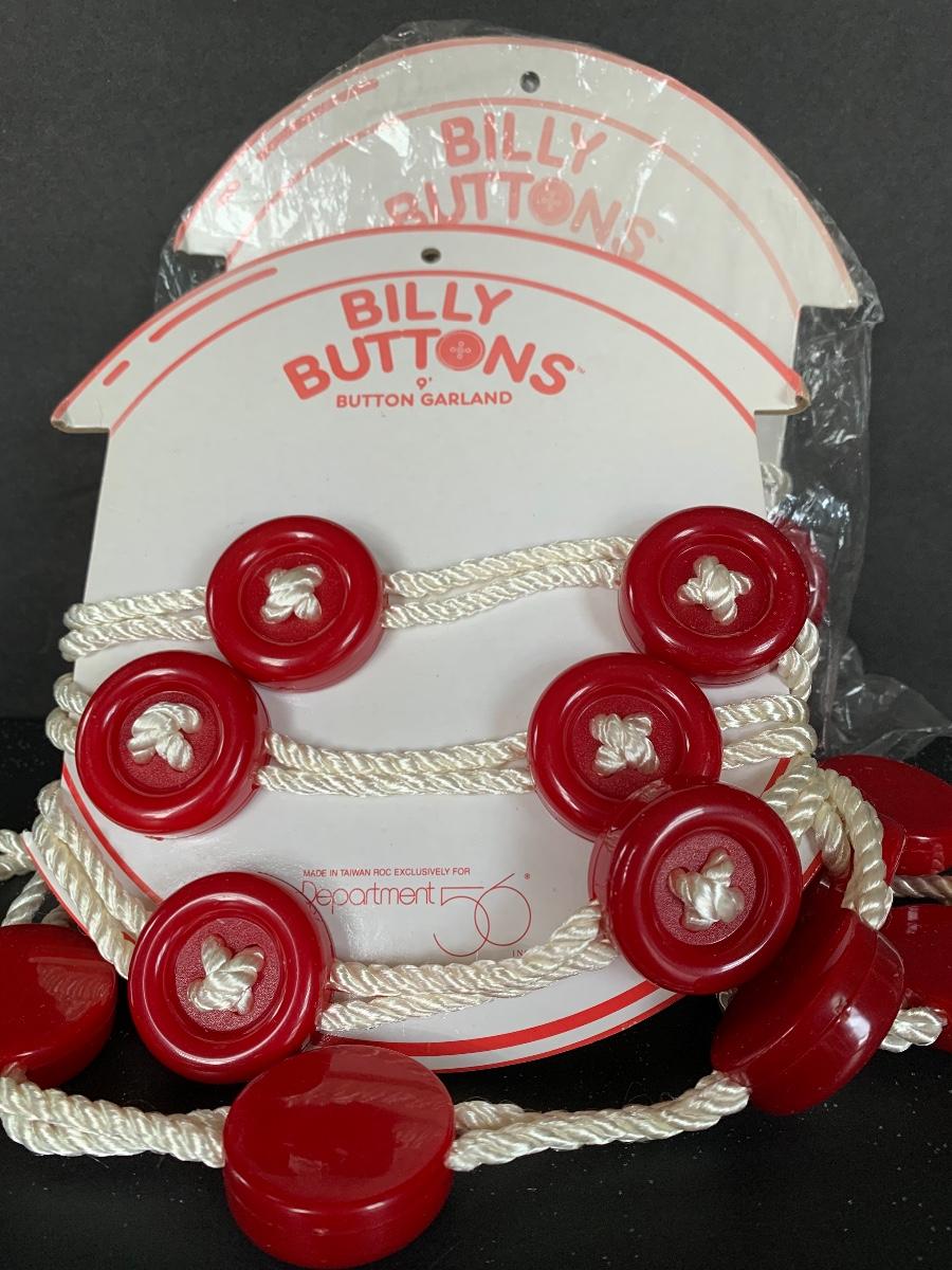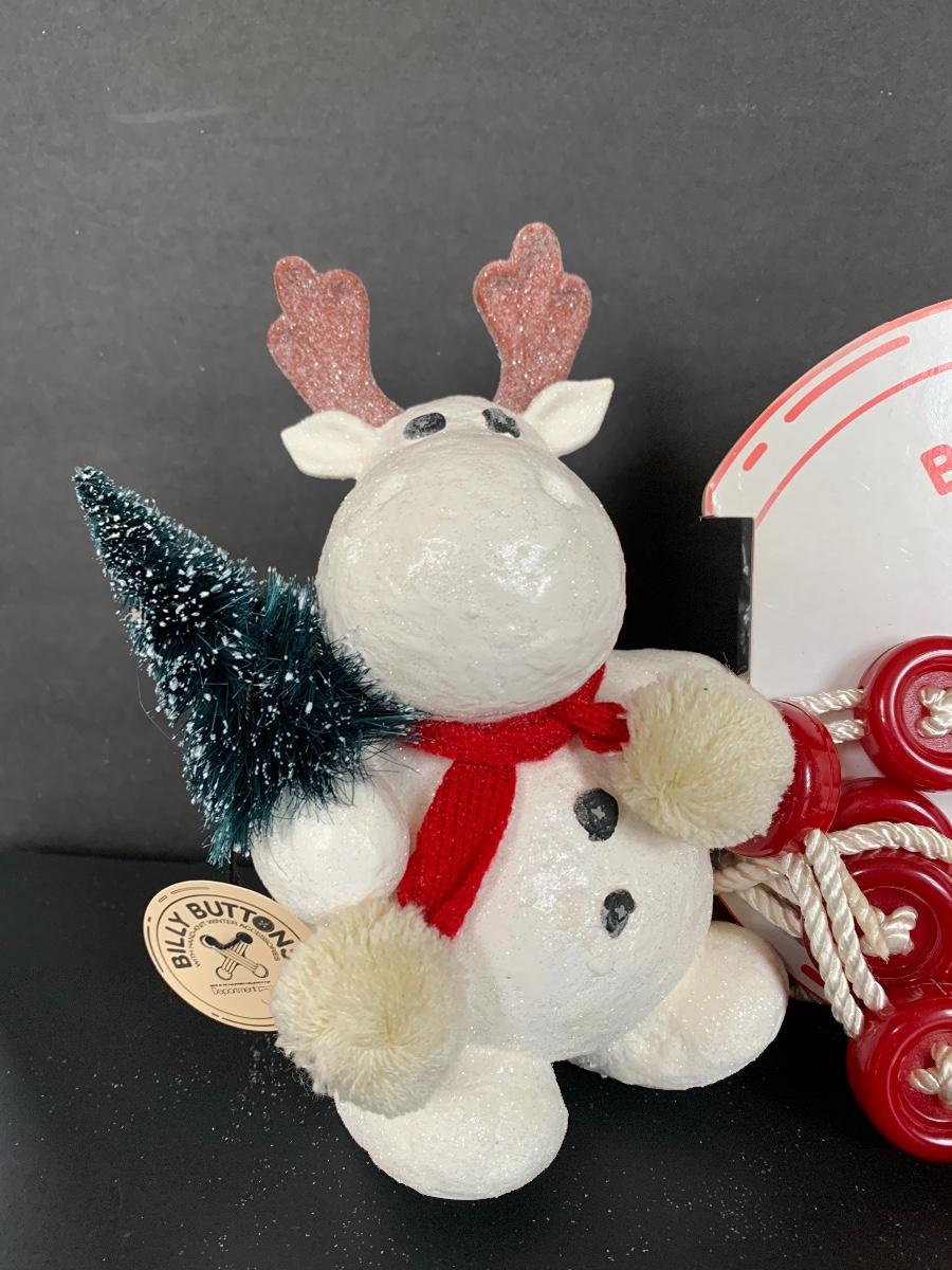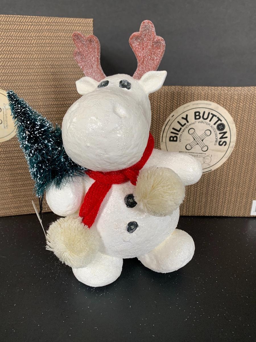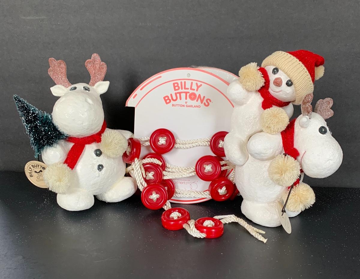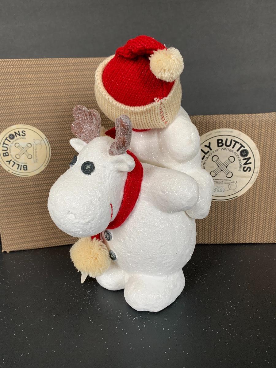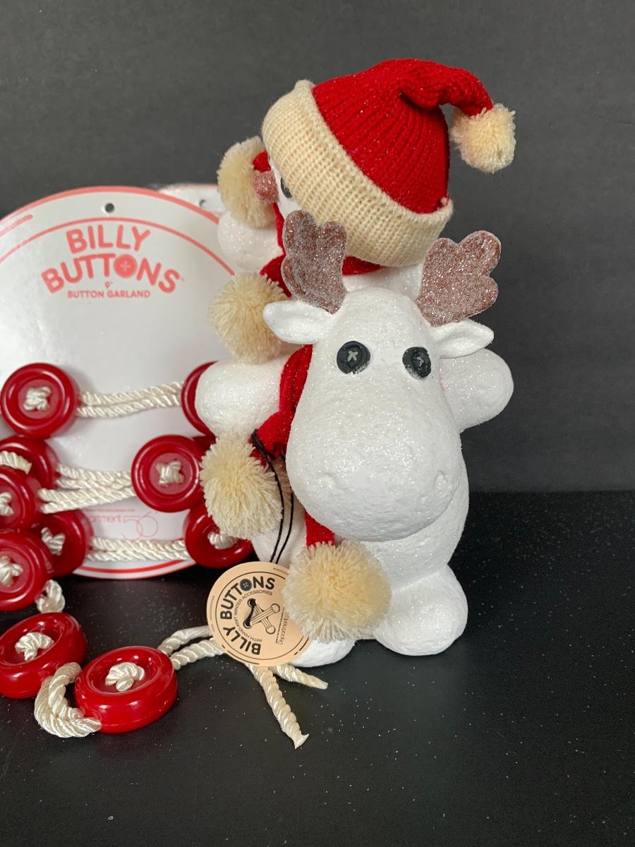 Billy Buttons DEPT DEPARTMENT 56 Piggyback Snowman, Reindeer with Tree along with two strands of 9' Billy Buttons Garland.