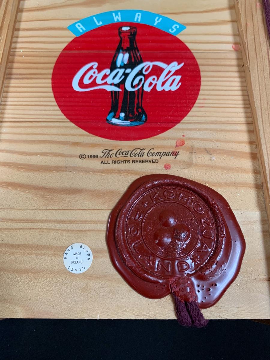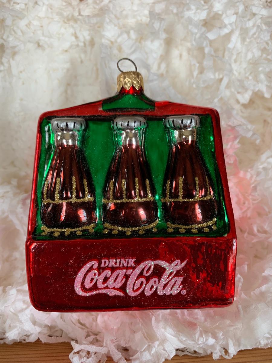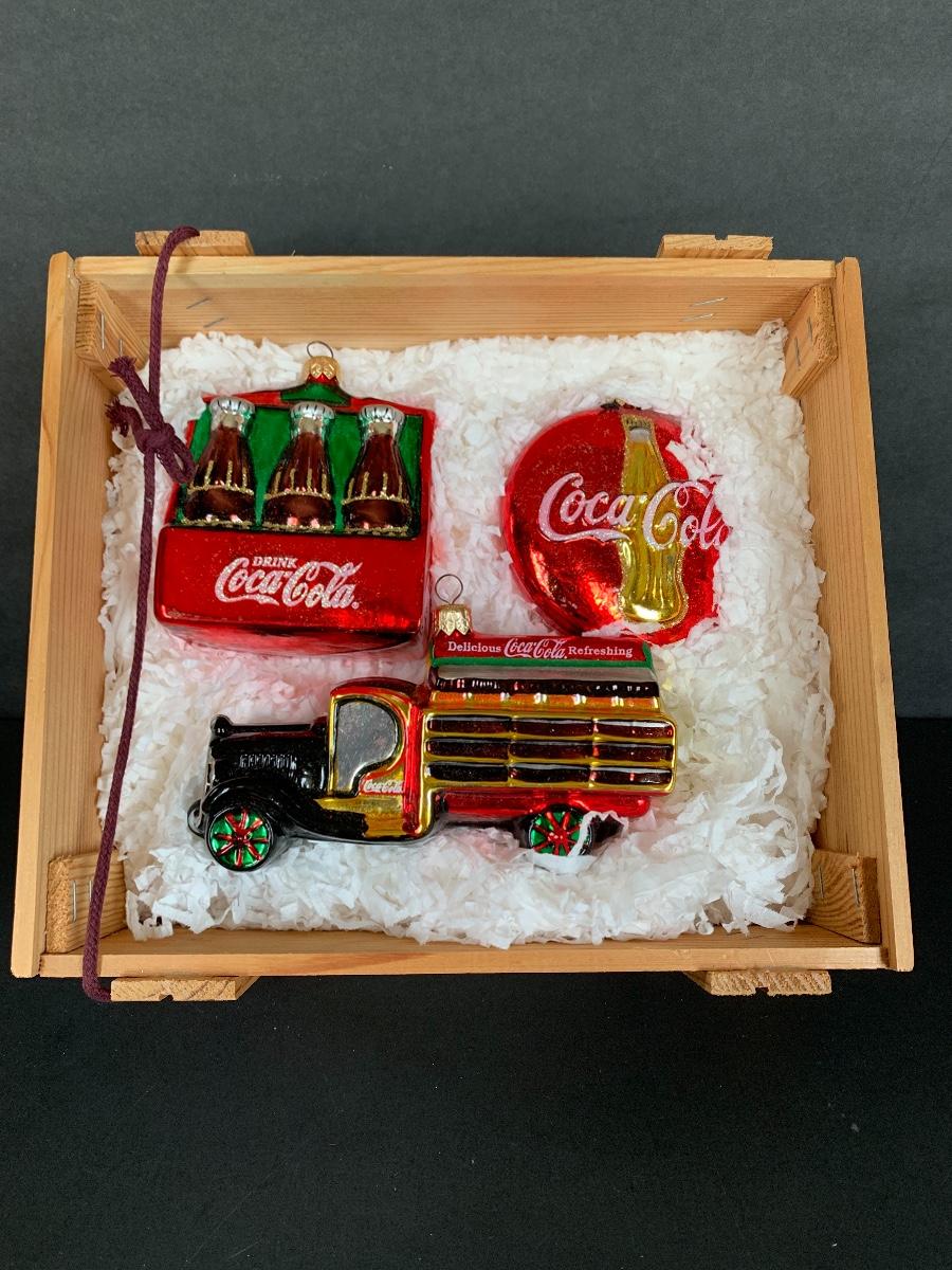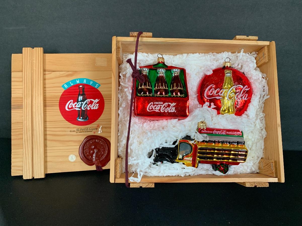 Lot 89:   Collectible Glass Blown Coca-Cola Ornaments in Crate &  Plush Animals