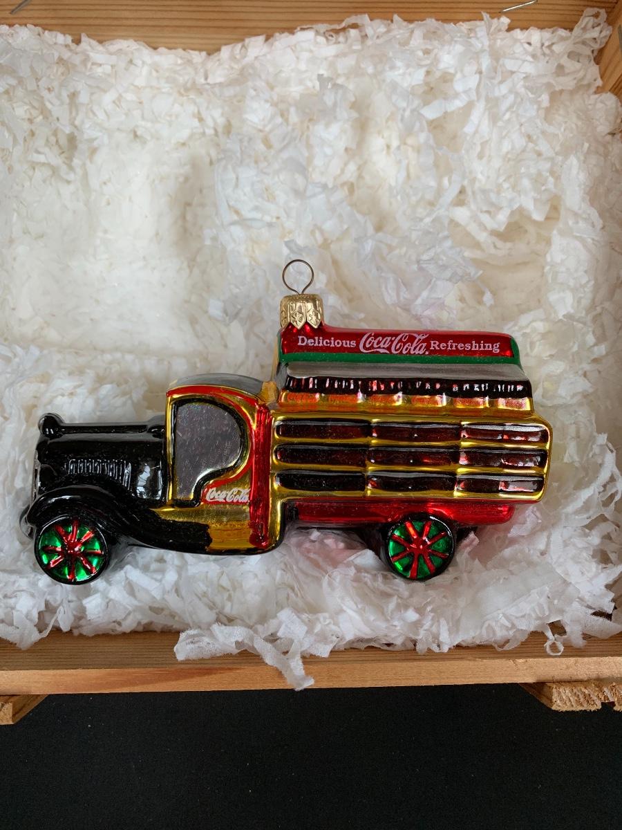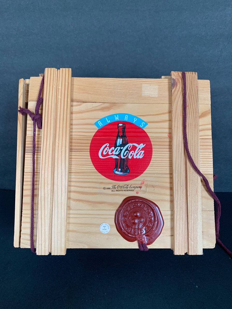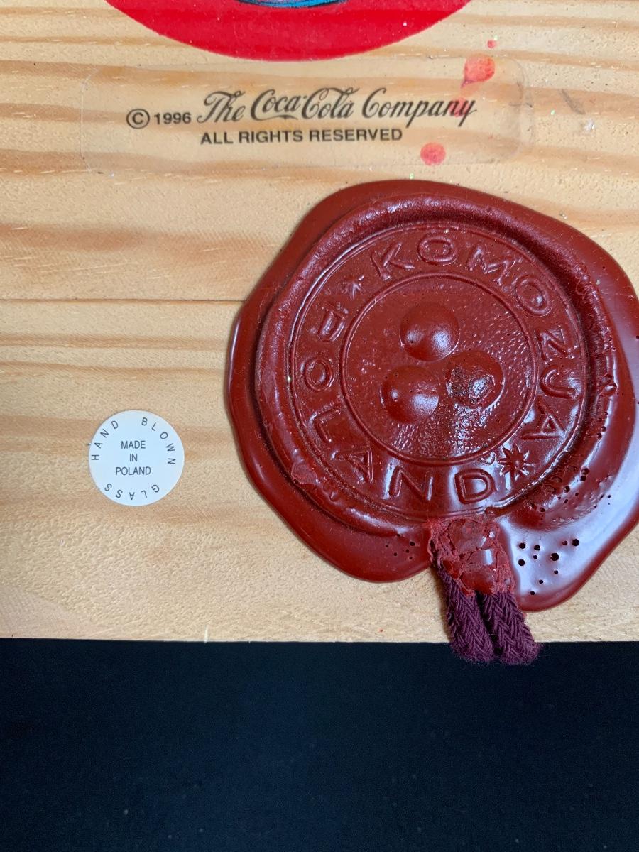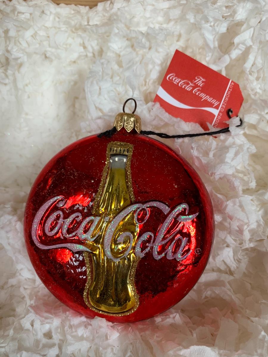 Lot 89:   Collectible Glass Blown Coca-Cola Ornaments in Crate &  Plush Animals