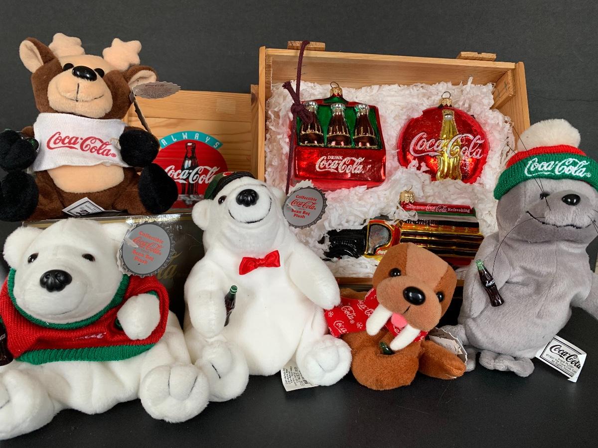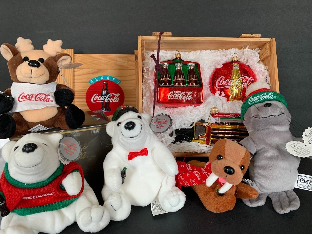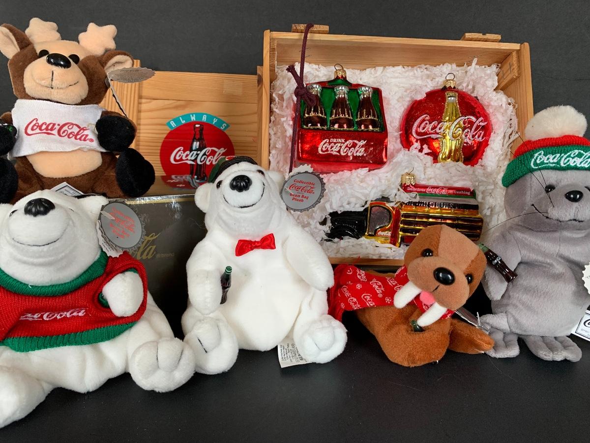 Lot 89: Collectible Glass Blown Coca-Cola Ornaments in Crate & Plush Animals