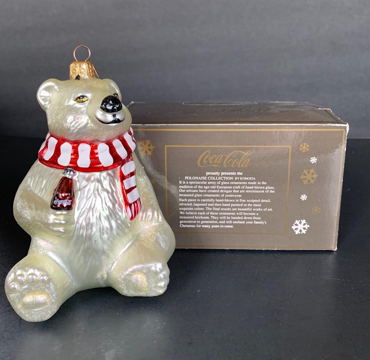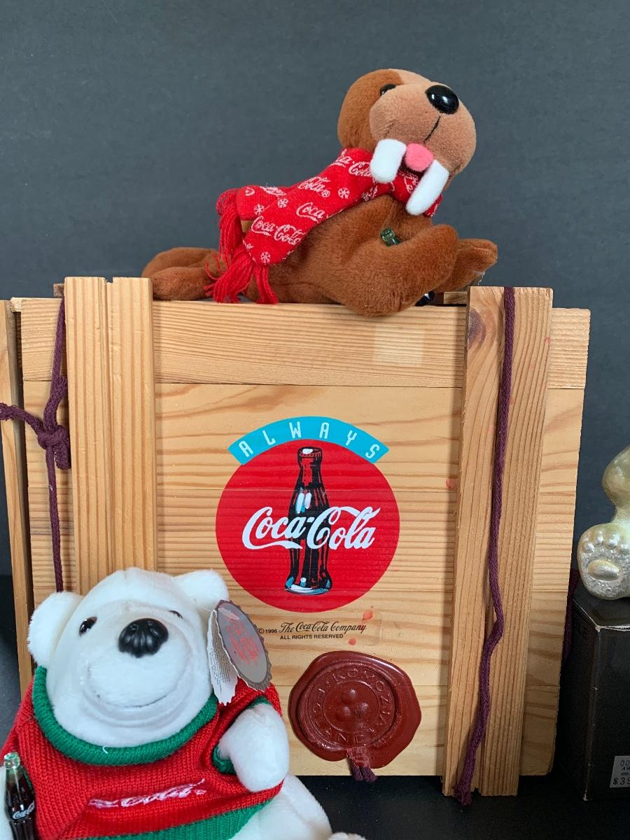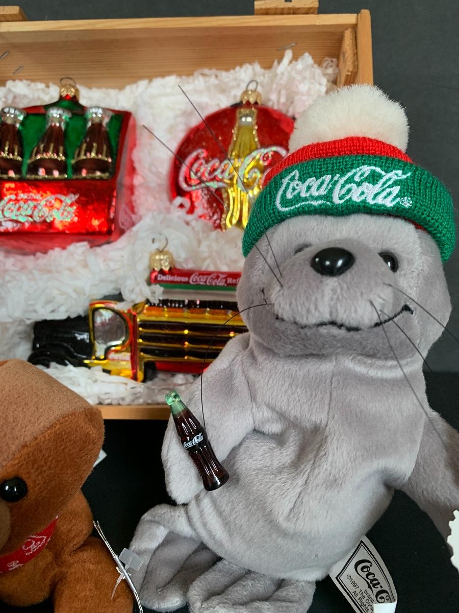 Lot 89: Collectible Glass Blown Coca-Cola Ornaments in Crate & Plush Animals