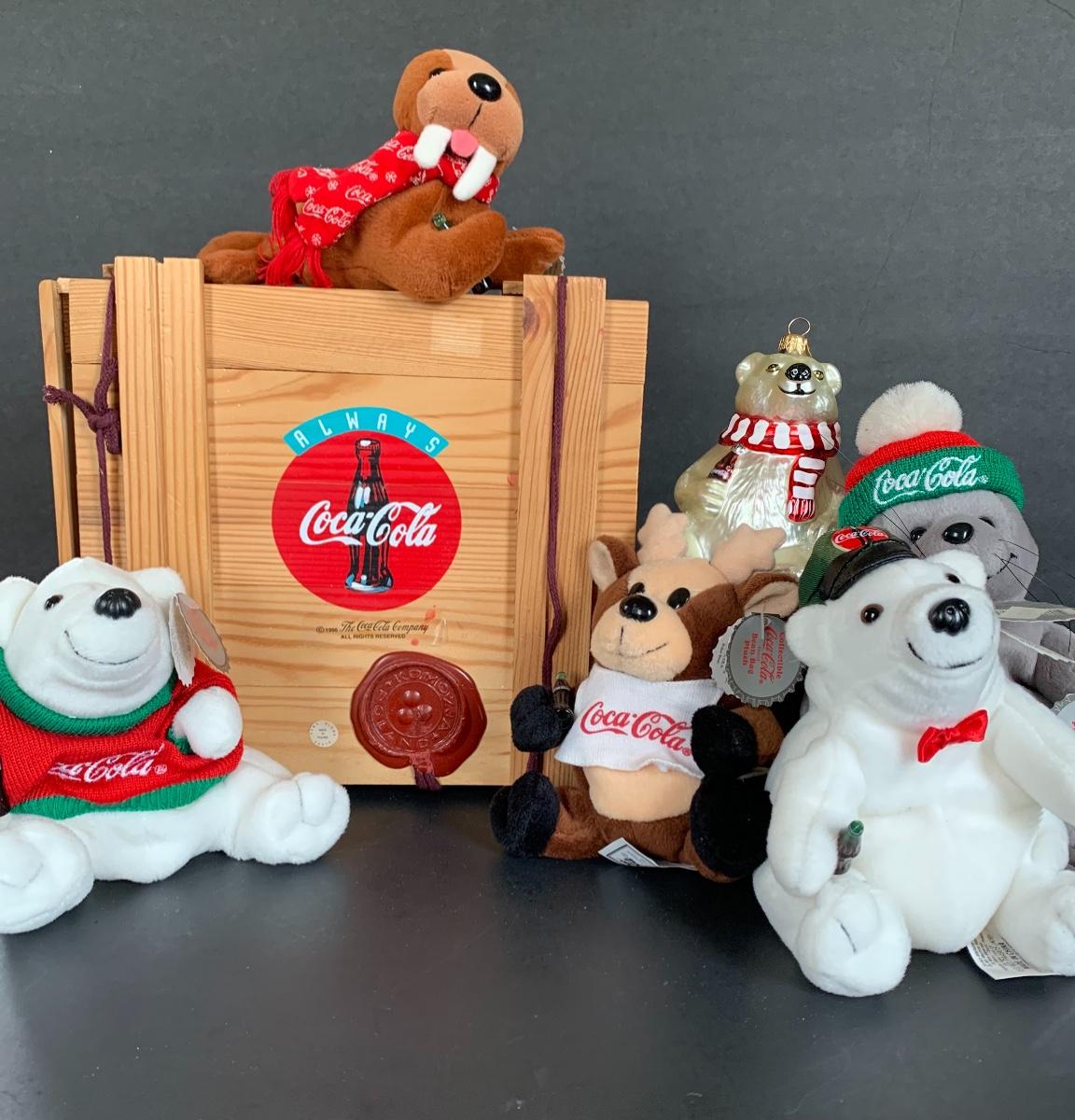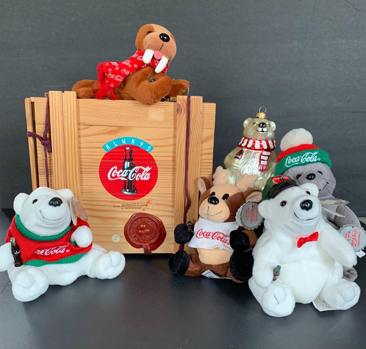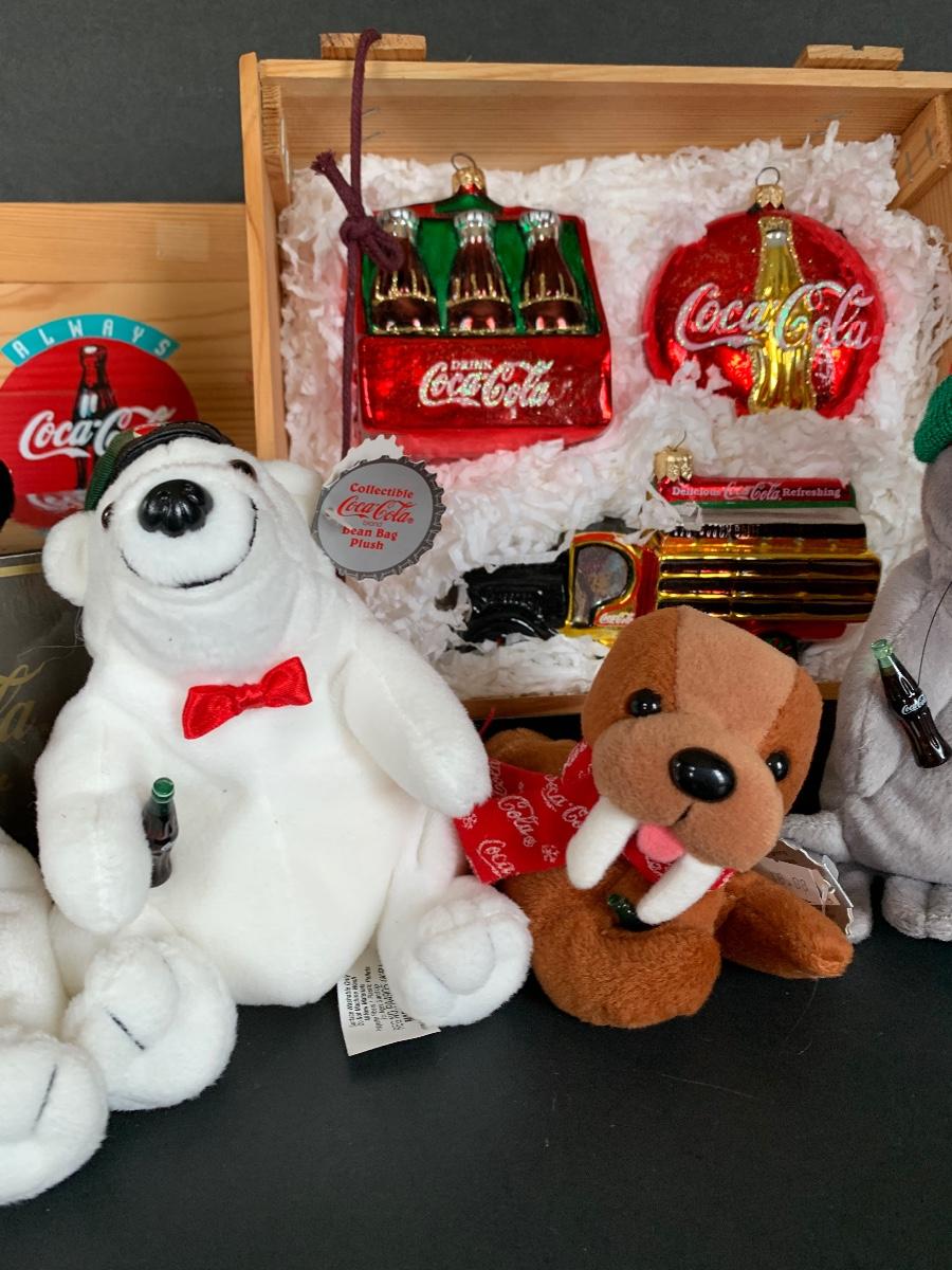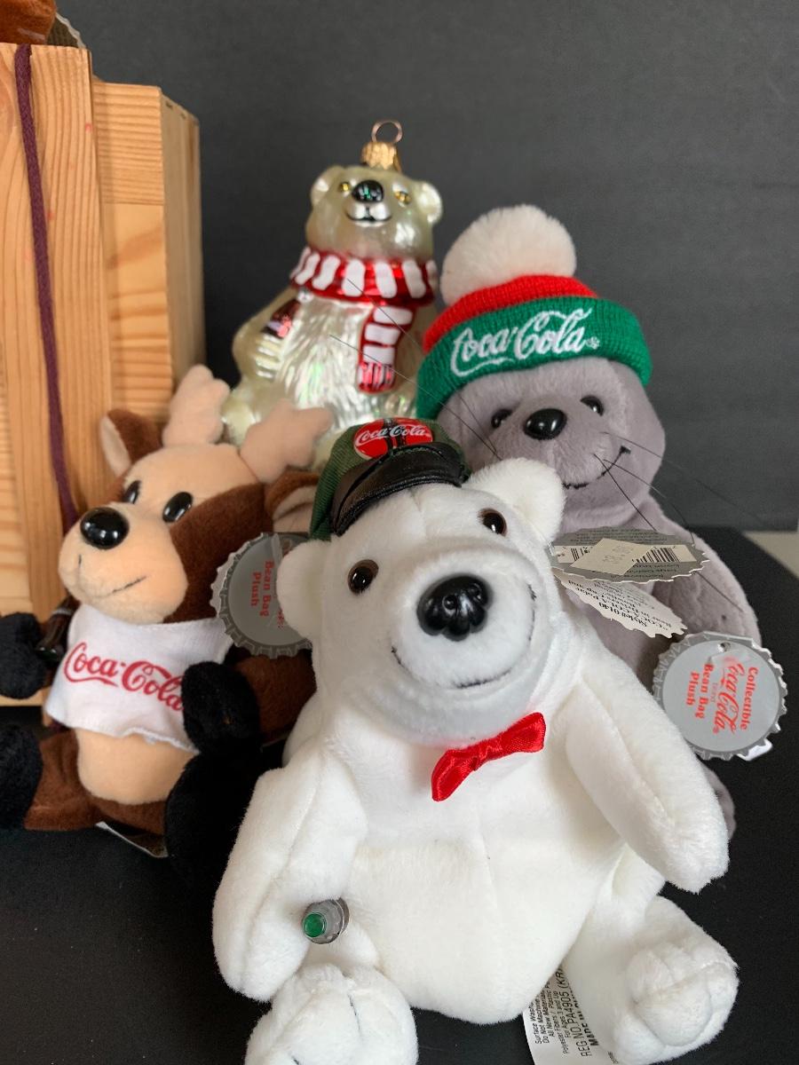 Coca-Cola Ornaments in Collectible Crate great for gift giving or hanging on your own tree. Collectible Plush Stuffed Animals with tags