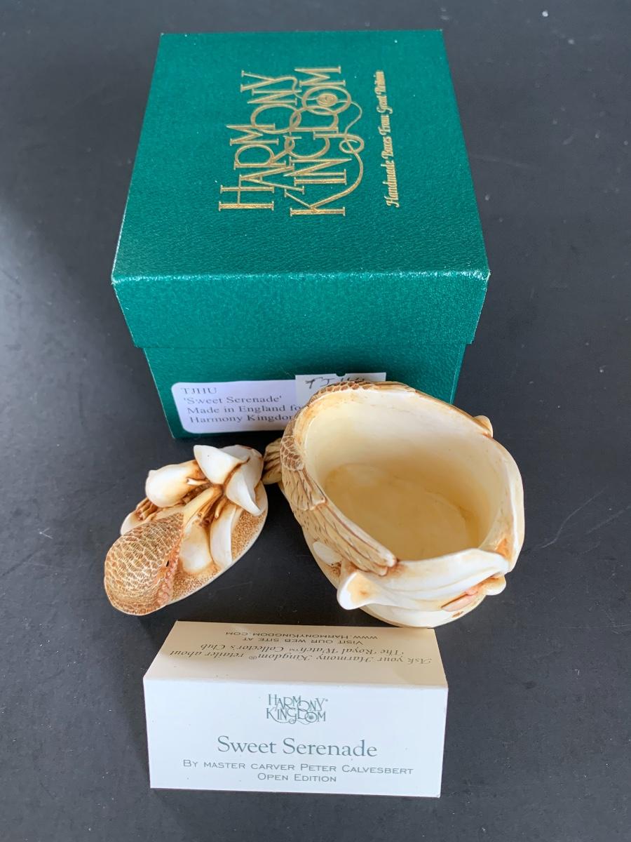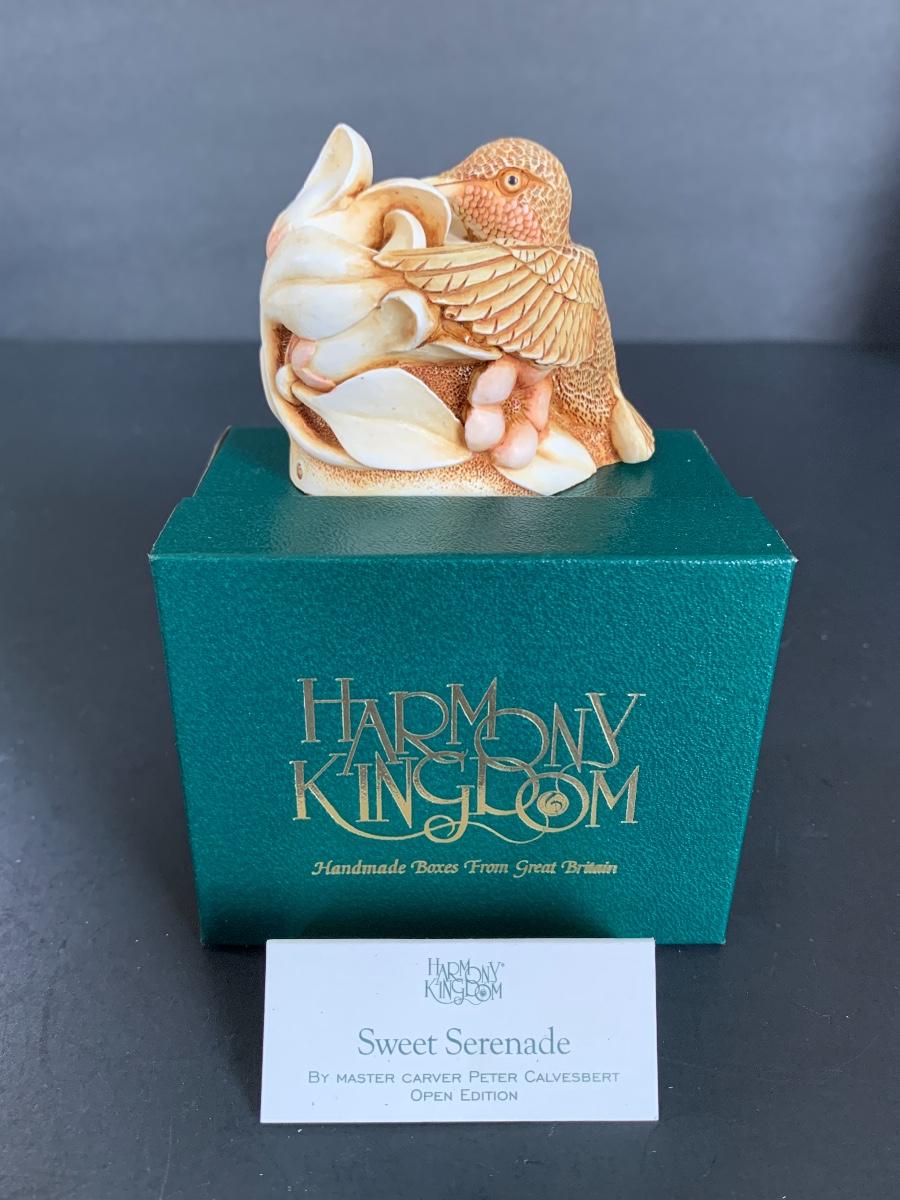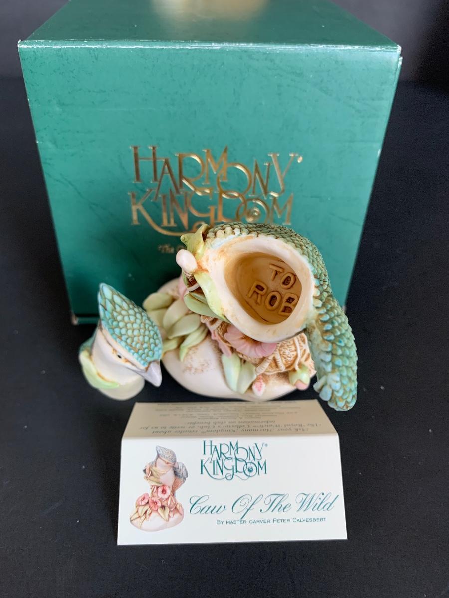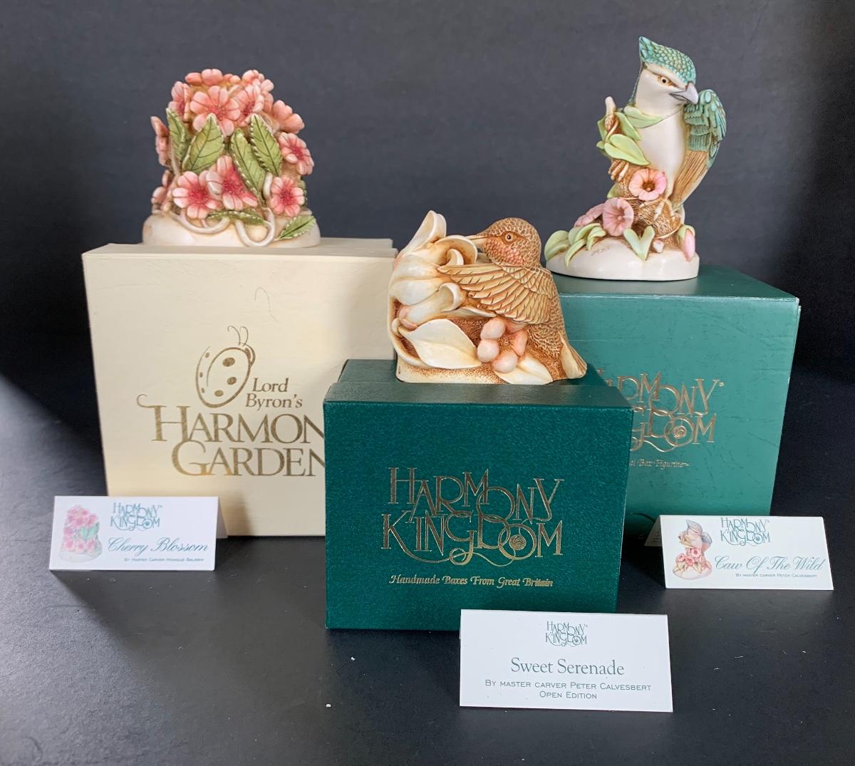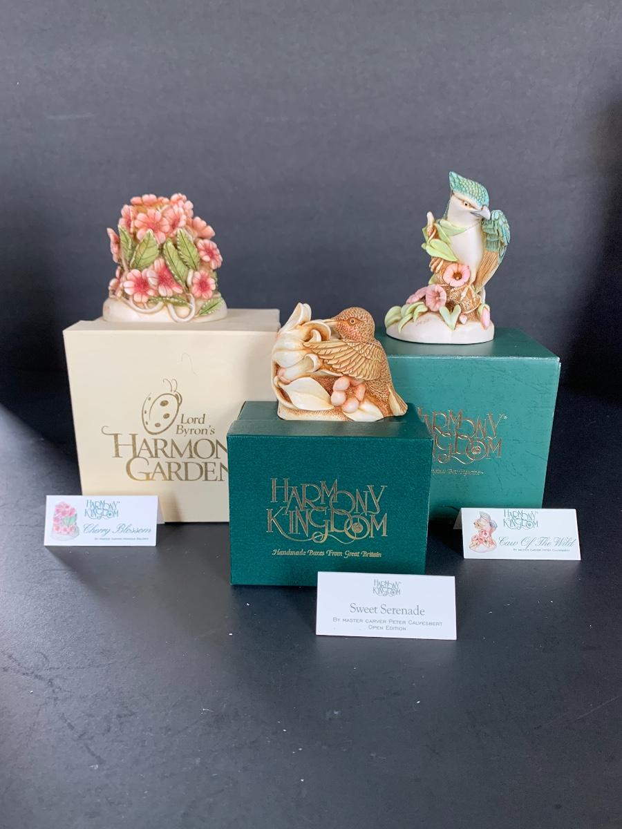 Harmony Kingdom’s unique collections are handmade of crushed marble and resin in the tradition of the English cottage industry. The whimsical animals of the Treasure Jest series, the beautiful blooms of Harmony Garden, and the entire Harmony Kingdom range all display the attention to detail and quirky sense of humor for which Harmony Kingdom’s artists are known for. Sweet Serenade: Beautiful Humming Bird - Caw of the Wild: lovely crested blue jay - Cherry Blossom: Harmony Gardens Cherry Blossom Teahouse
