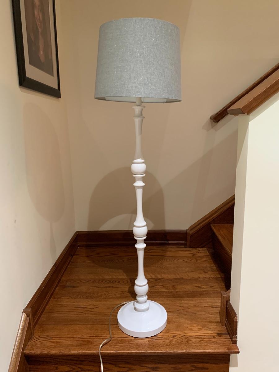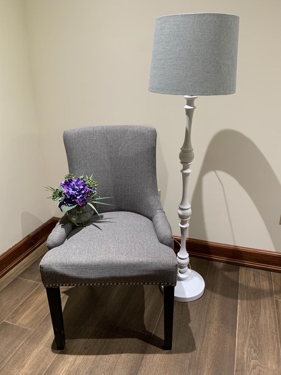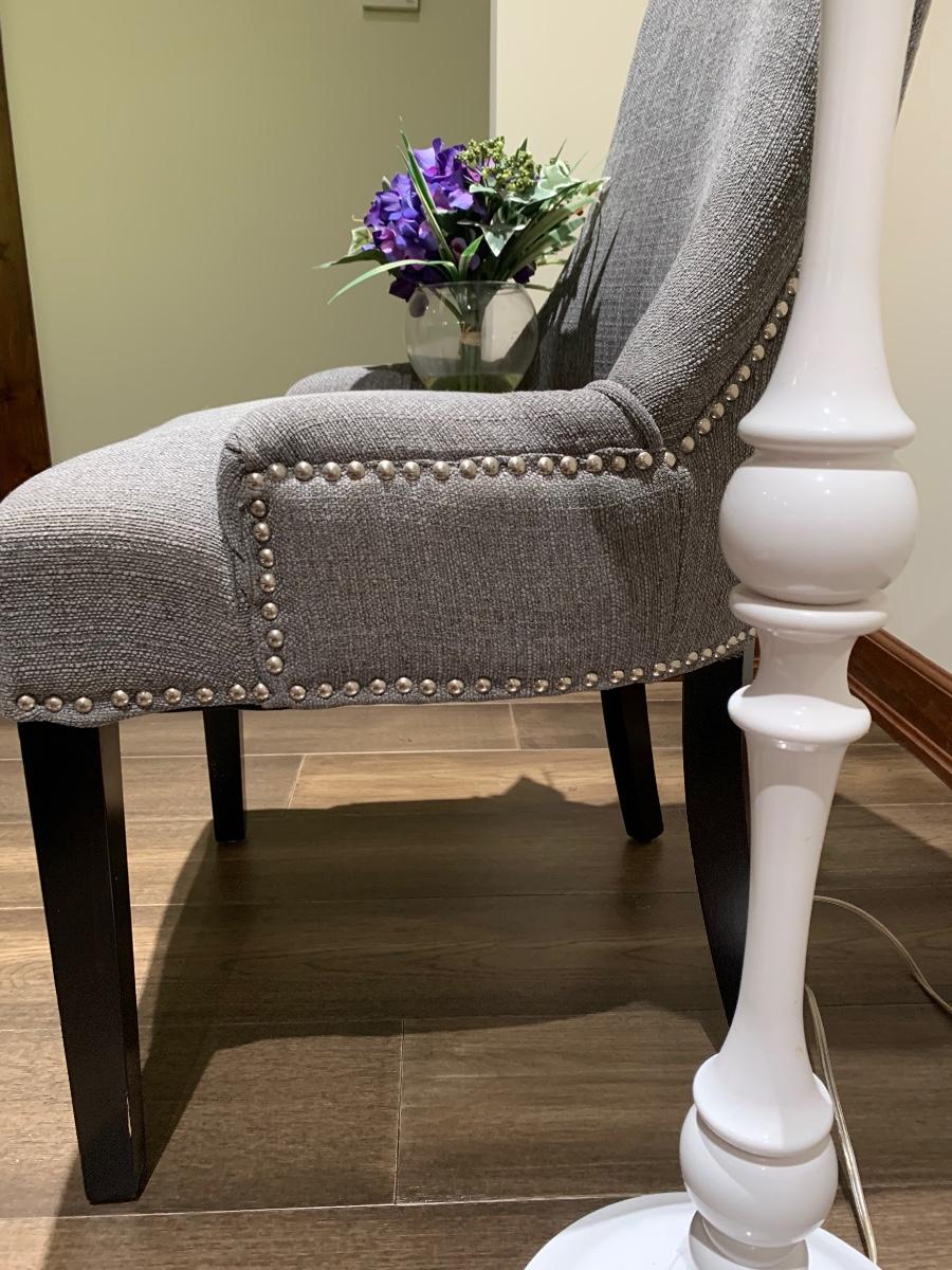 Lot 283:  Gray Studded Upholster Accent Chair with White Floor Lamp