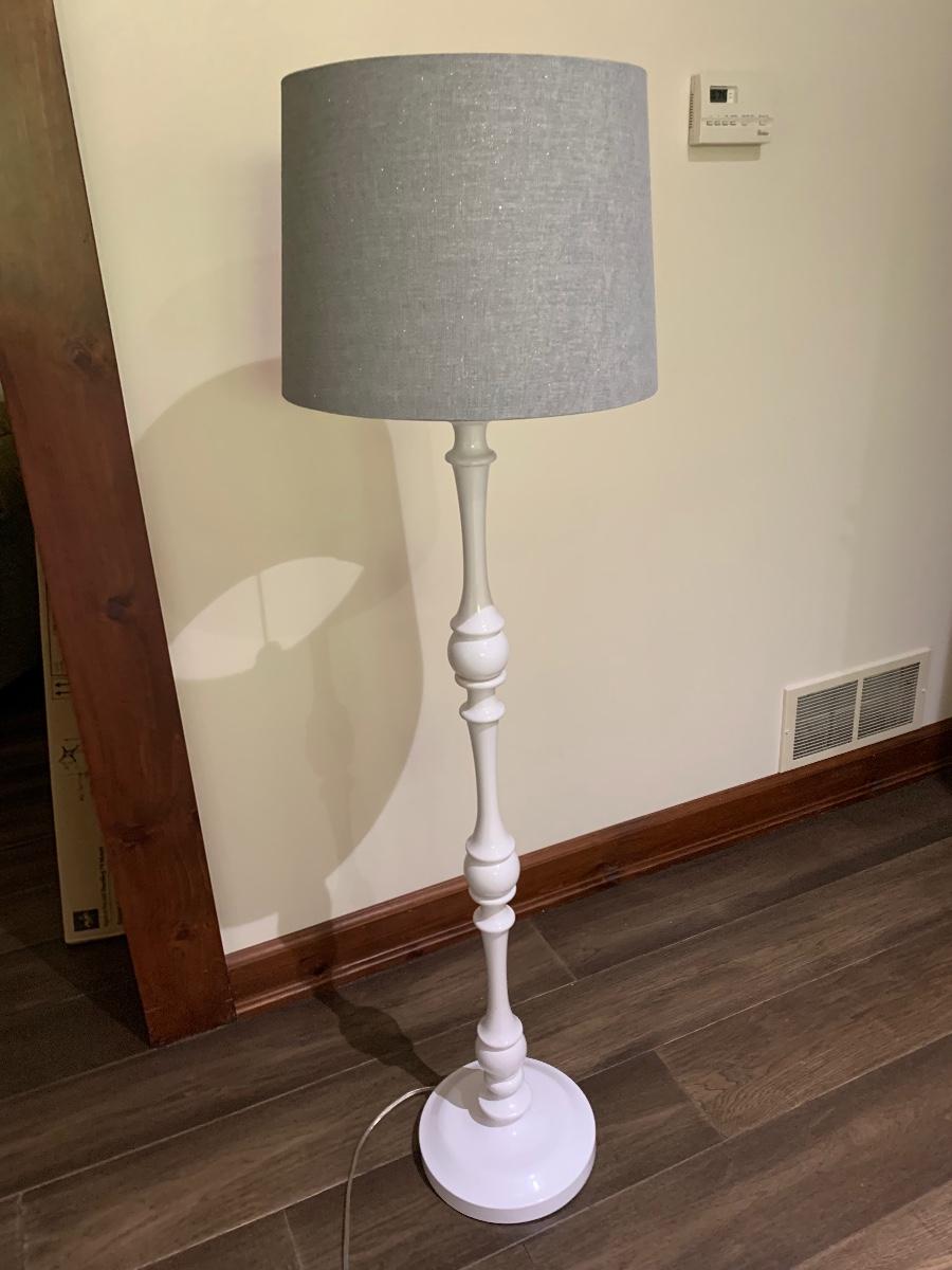 Lot 283: Gray Studded Upholster Accent Chair with White Floor Lamp