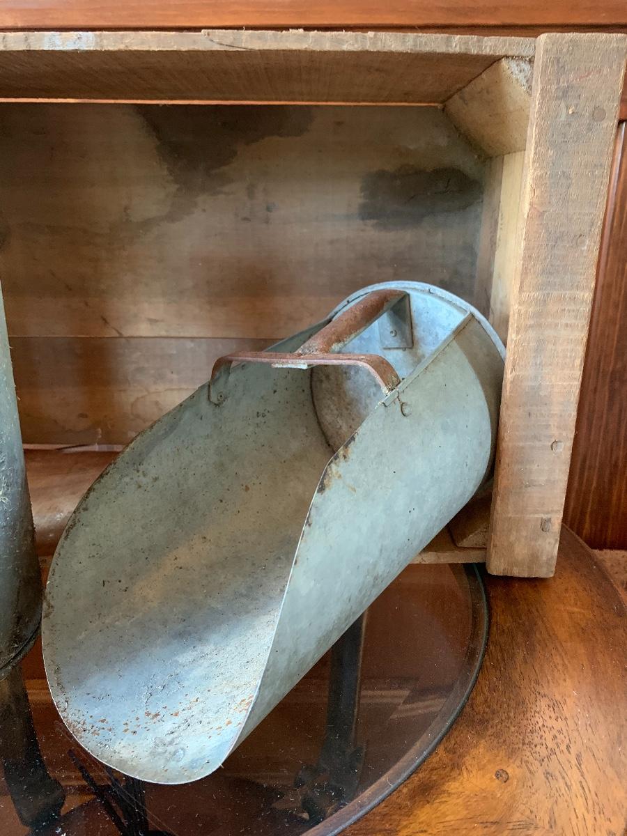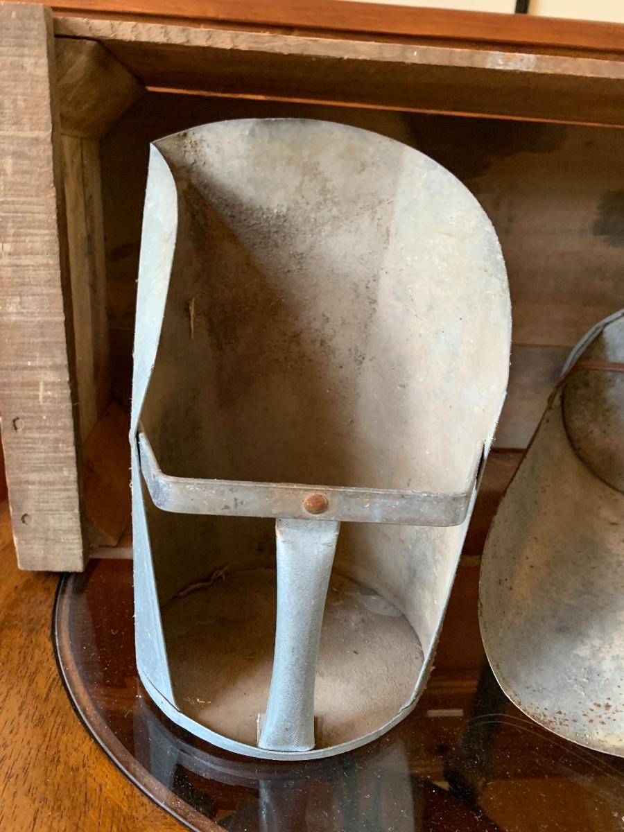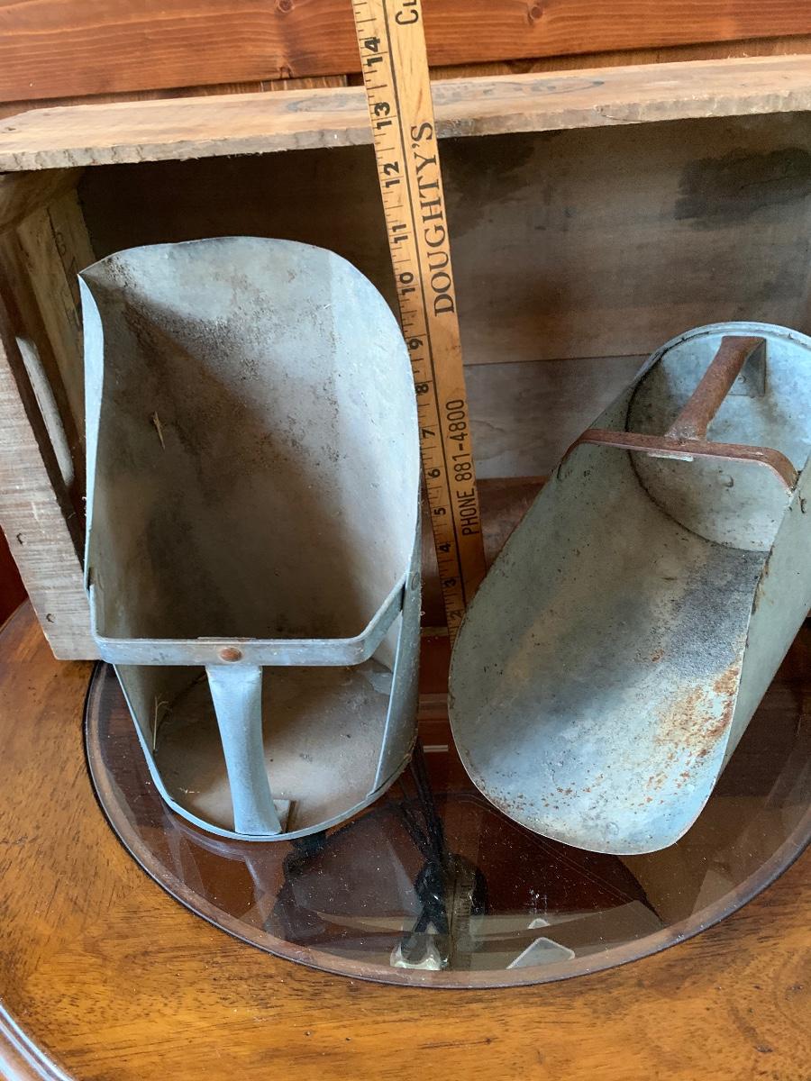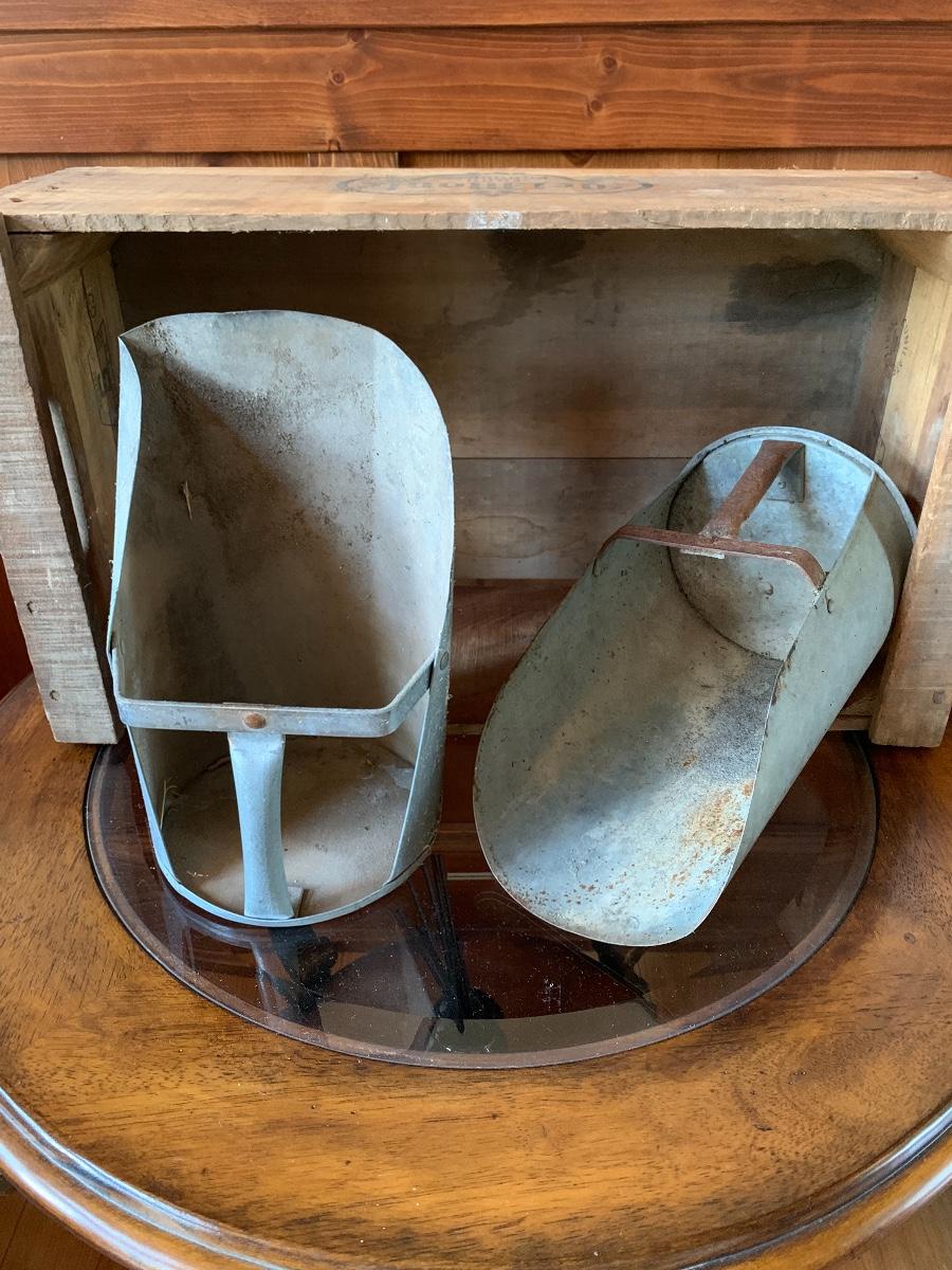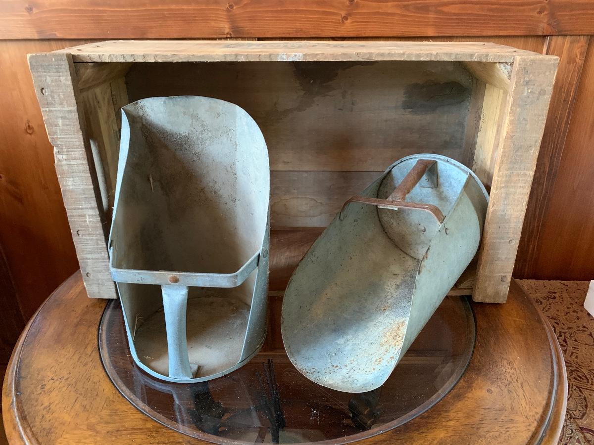 Lot 92: Antique Del Monte Crate & Vintage Galvanized Metal Grain Scoops