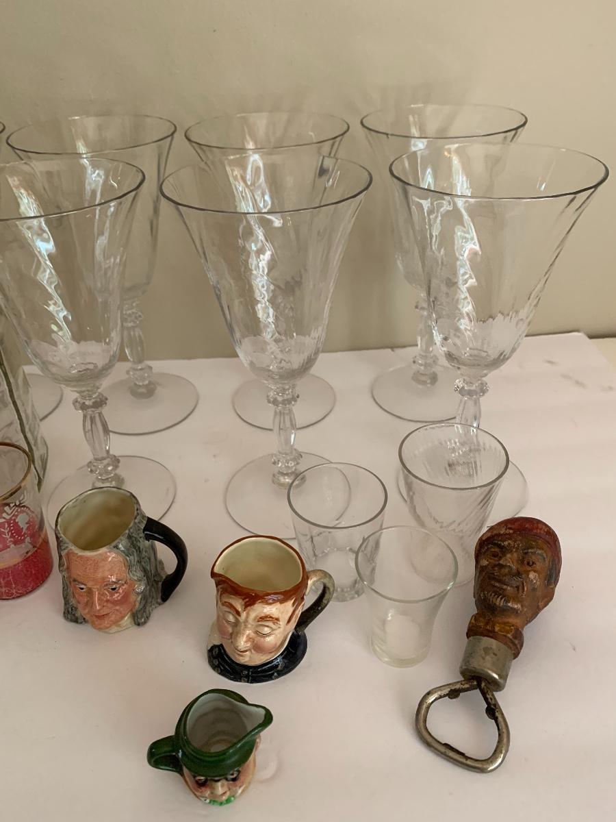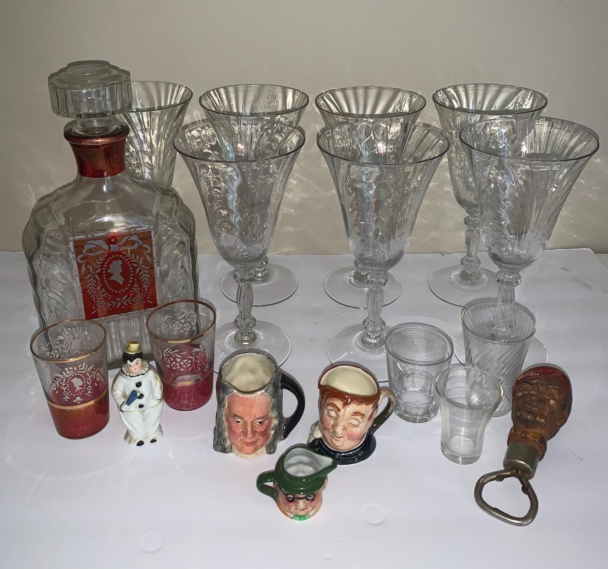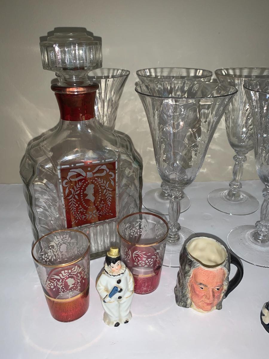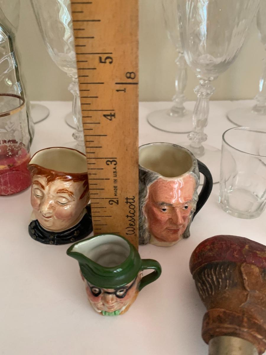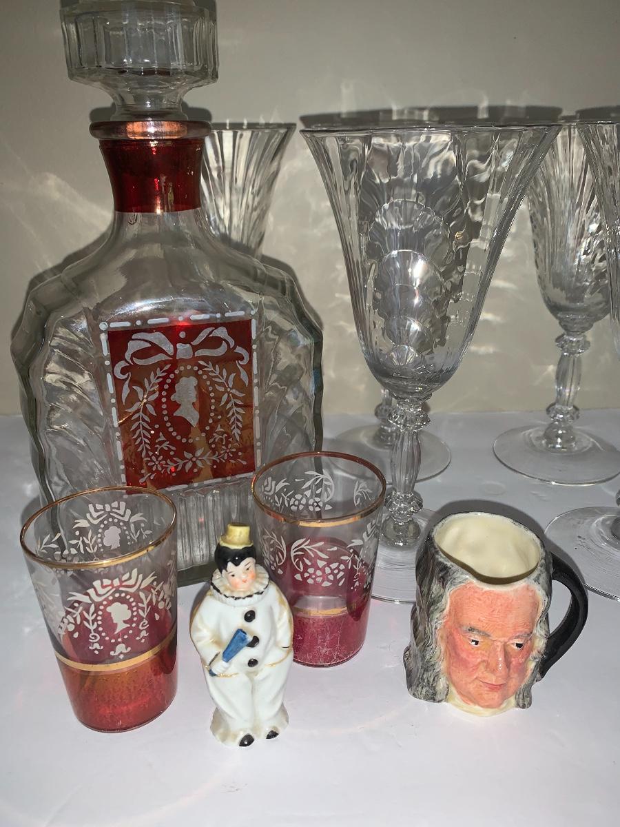Beautiful etched wine glasses, vintage decanter w/matching glasses. Miniature Figurine with no marking. Artone Hand painted miniature face mug, Royal Daulton miniature face mug and L & S LTD. Hand Painted Face mug.