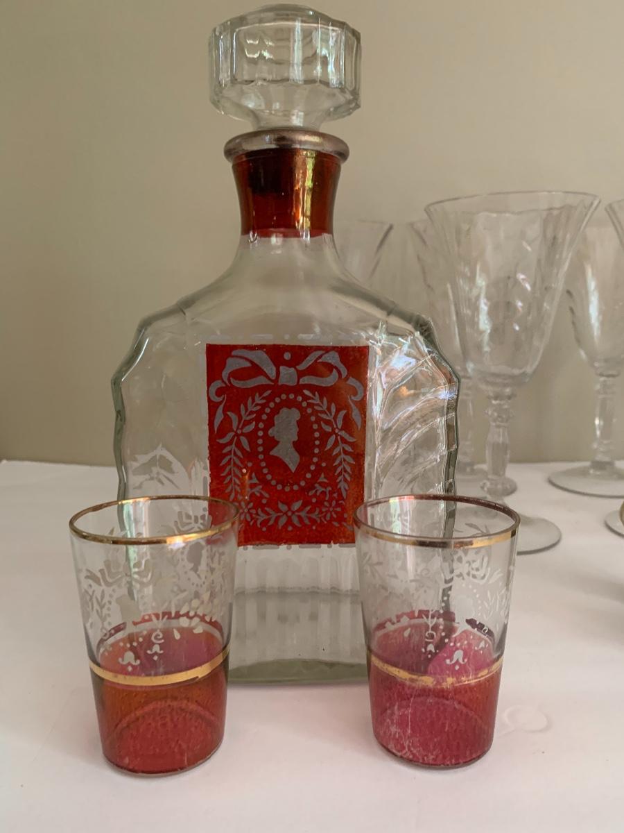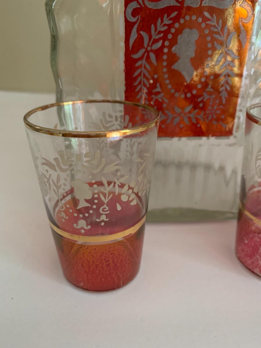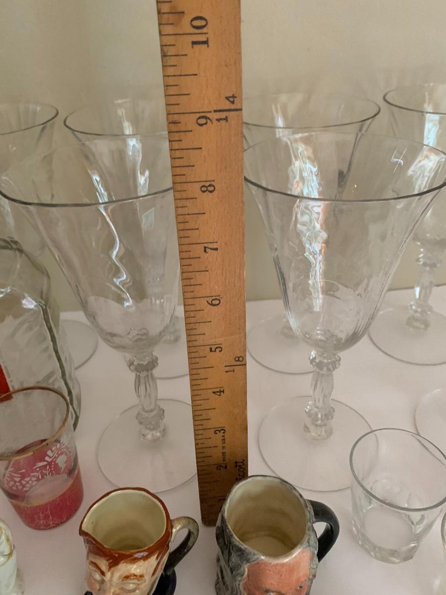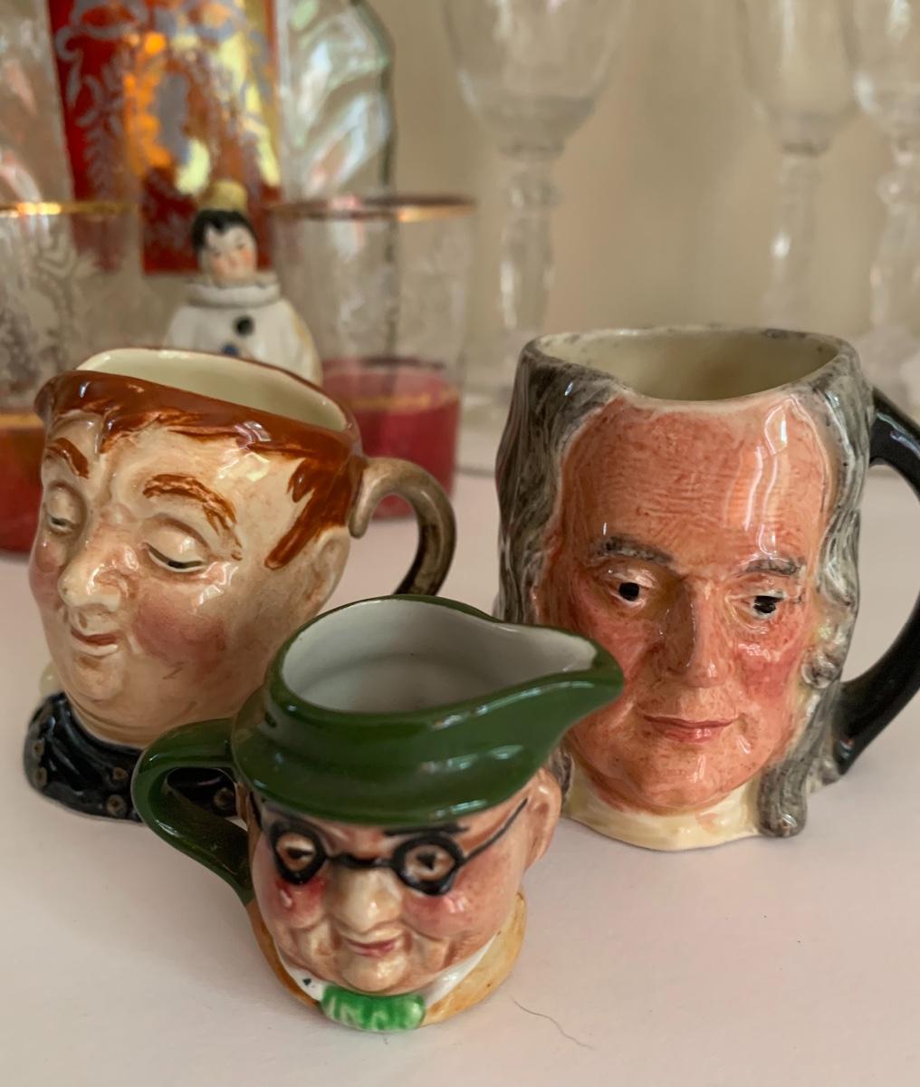 Beautiful etched wine glasses, vintage decanter w/matching glasses. Miniature Figurine with no marking. Artone Hand painted miniature face mug, Royal Daulton miniature face mug and L & S LTD. Hand Painted Face mug.