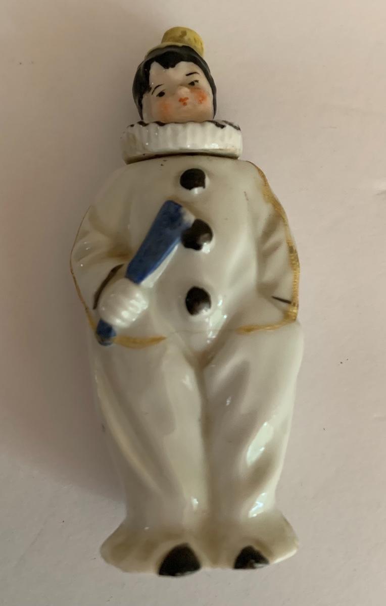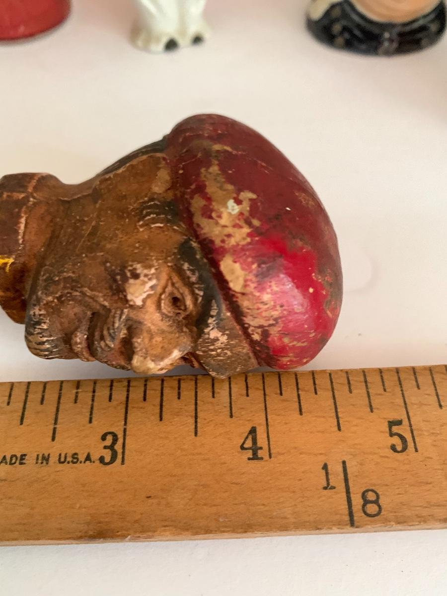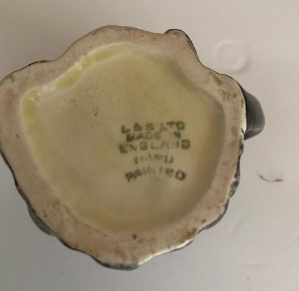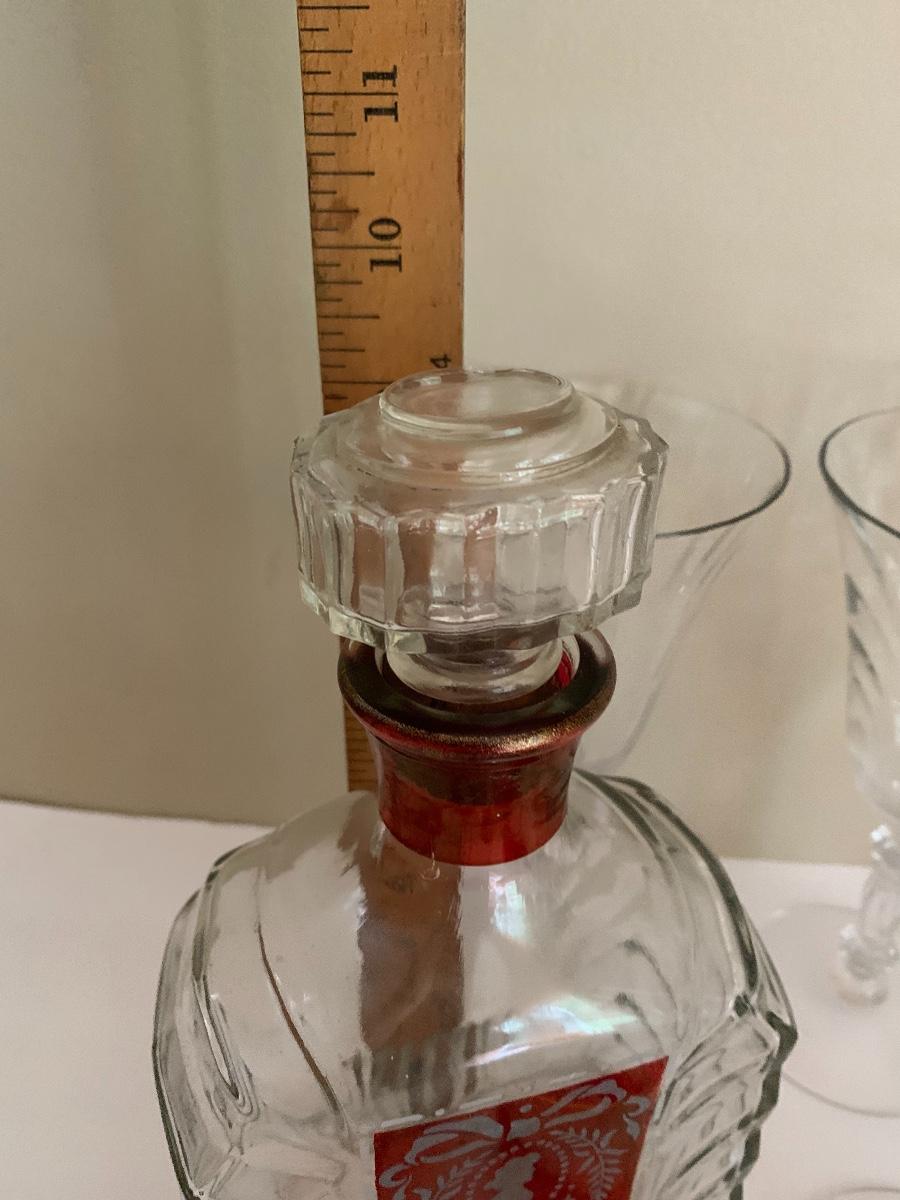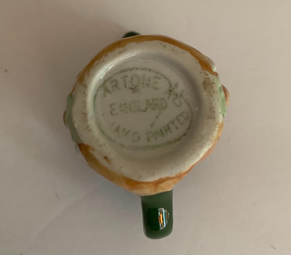 Beautiful etched wine glasses, vintage decanter w/matching glasses. Miniature Figurine with no marking. Artone Hand painted miniature face mug, Royal Daulton miniature face mug and L & S LTD. Hand Painted Face mug.