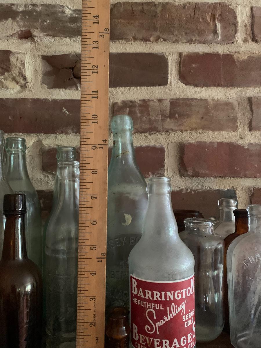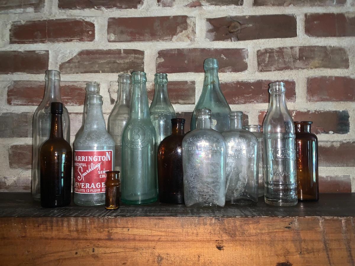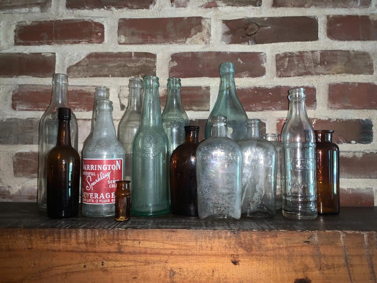 Large lot of vintage bottles with names and/or markings in various sizes.