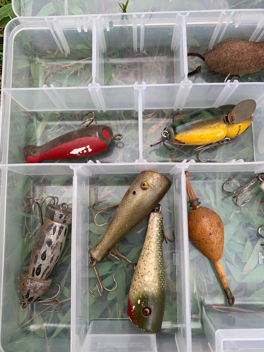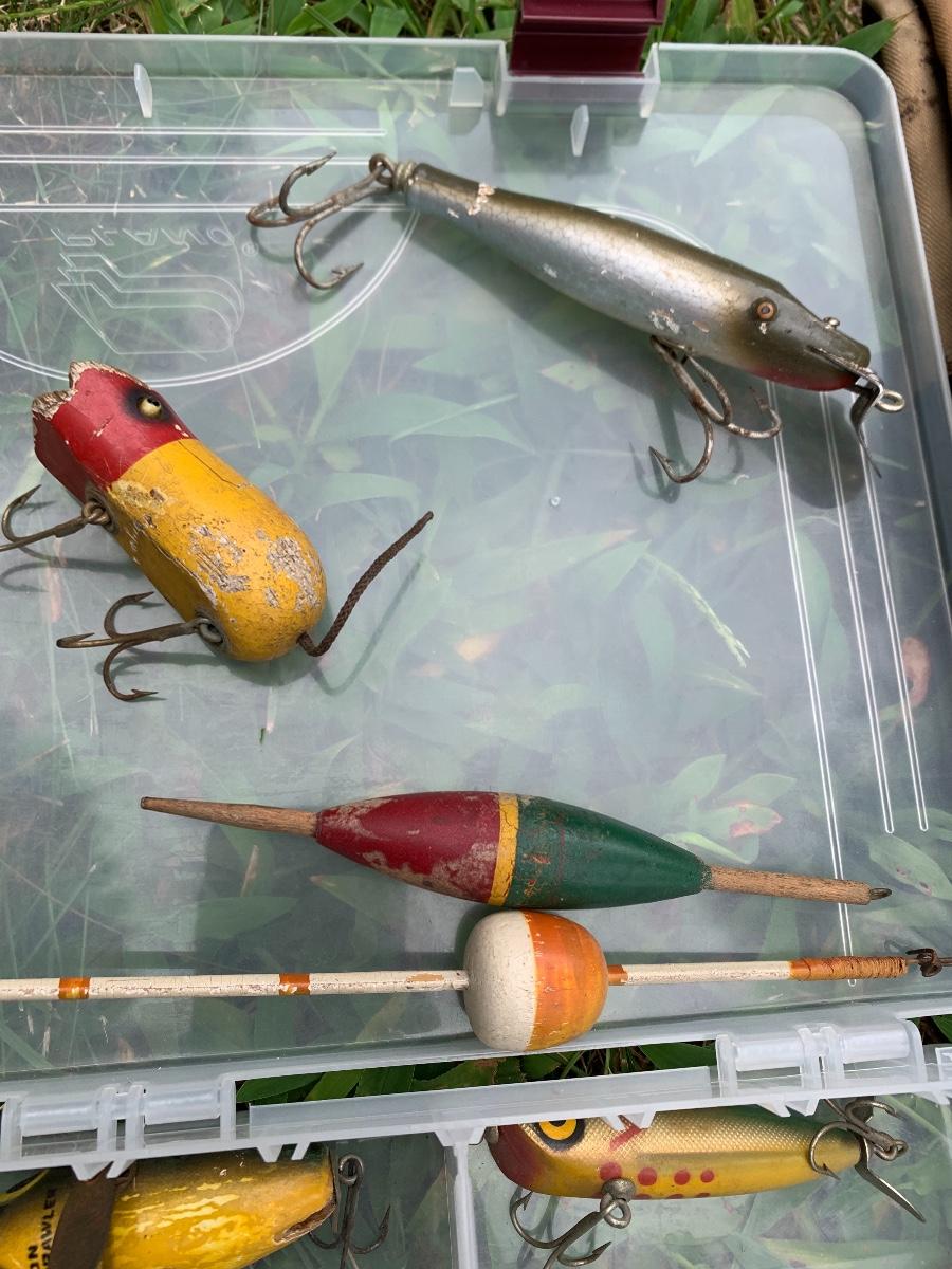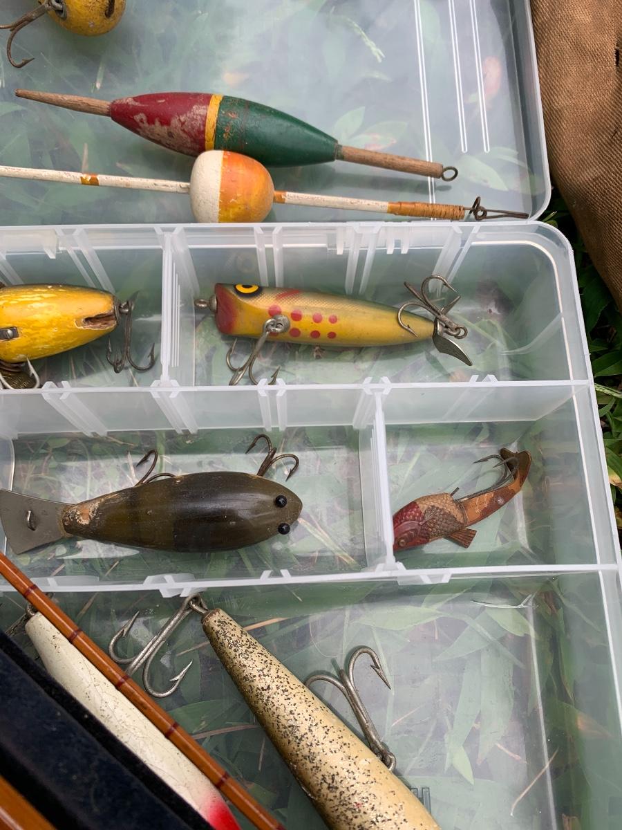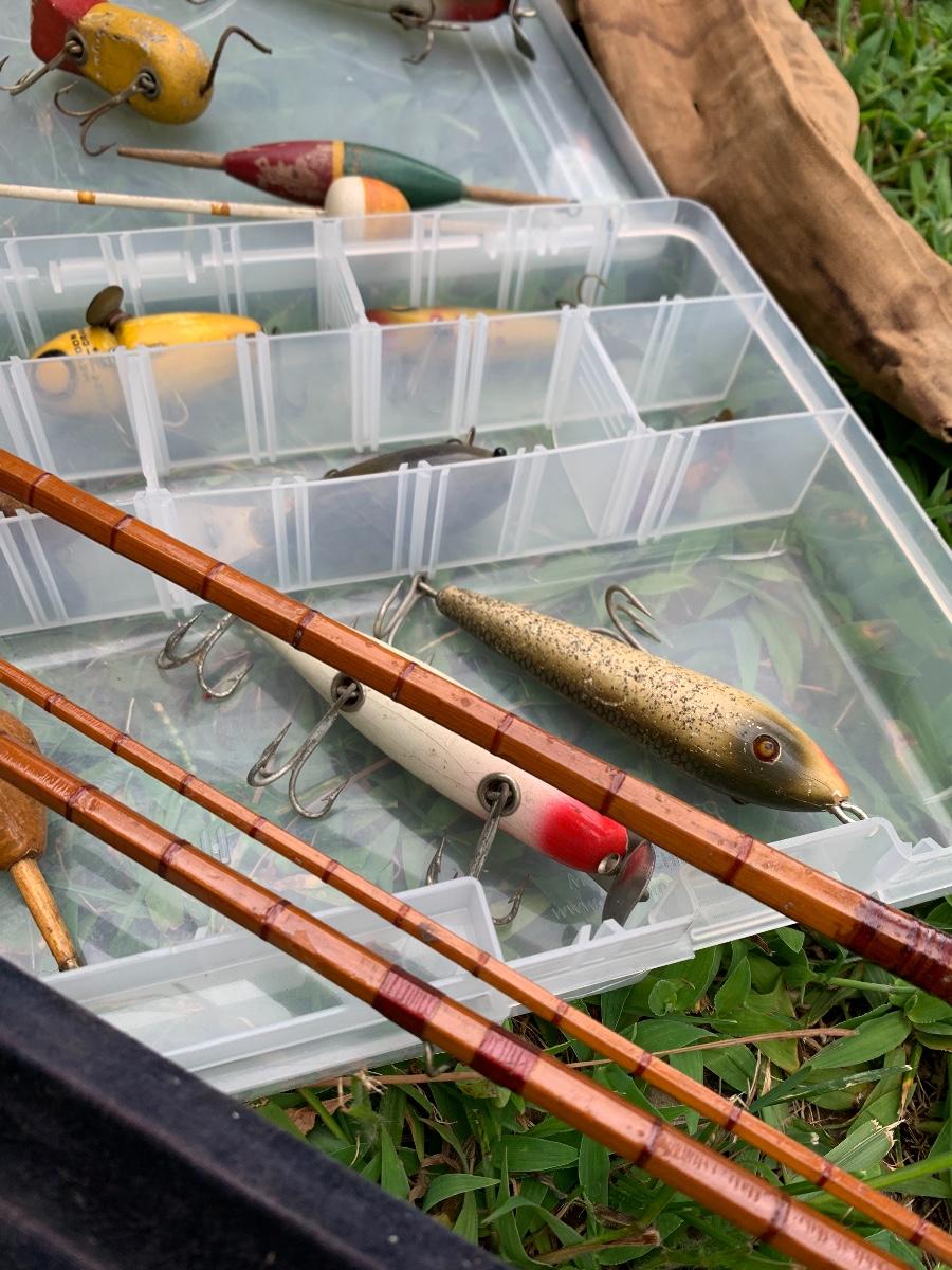 Antique Bamboo Fishing Pole is a Great Decorative Piece. Vintage Fishing Derby Tags along with a nice collection of vintage fishing lures.