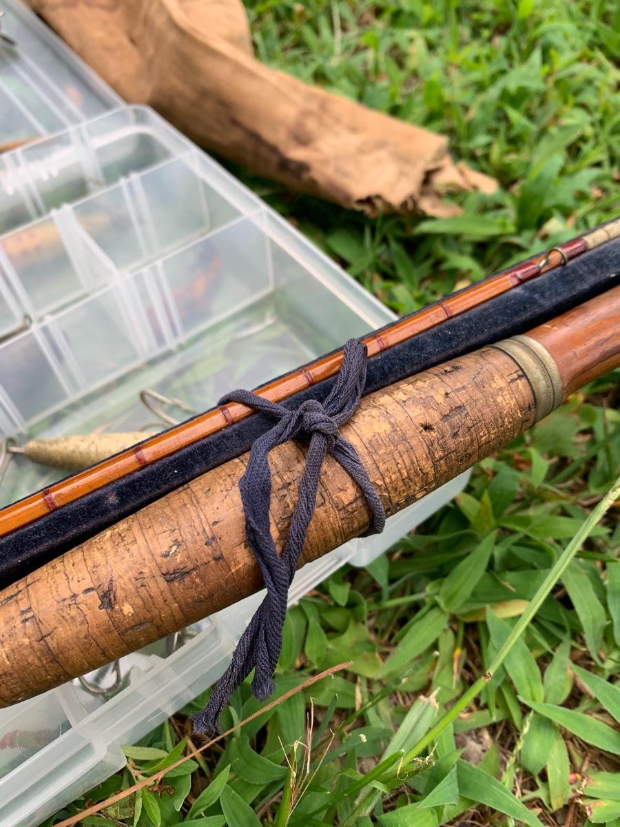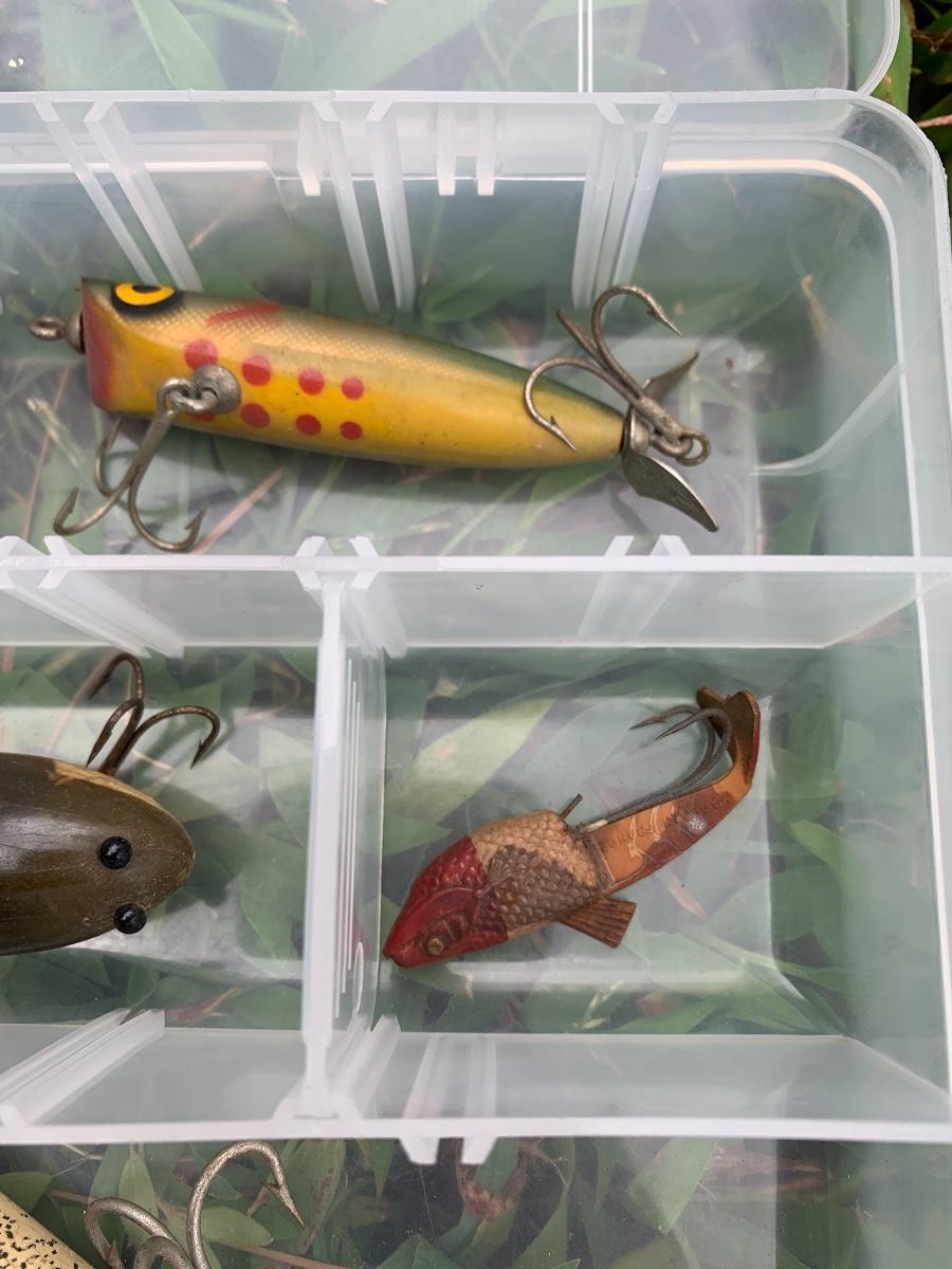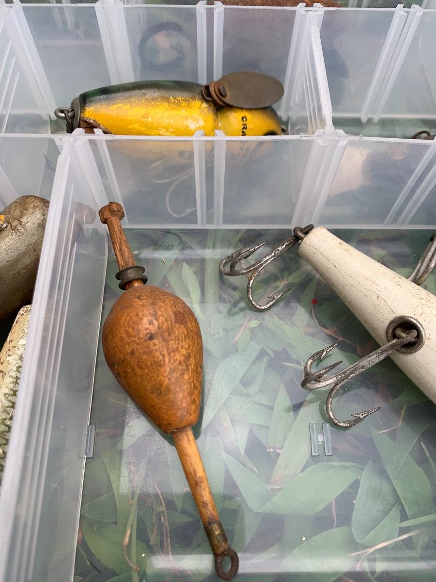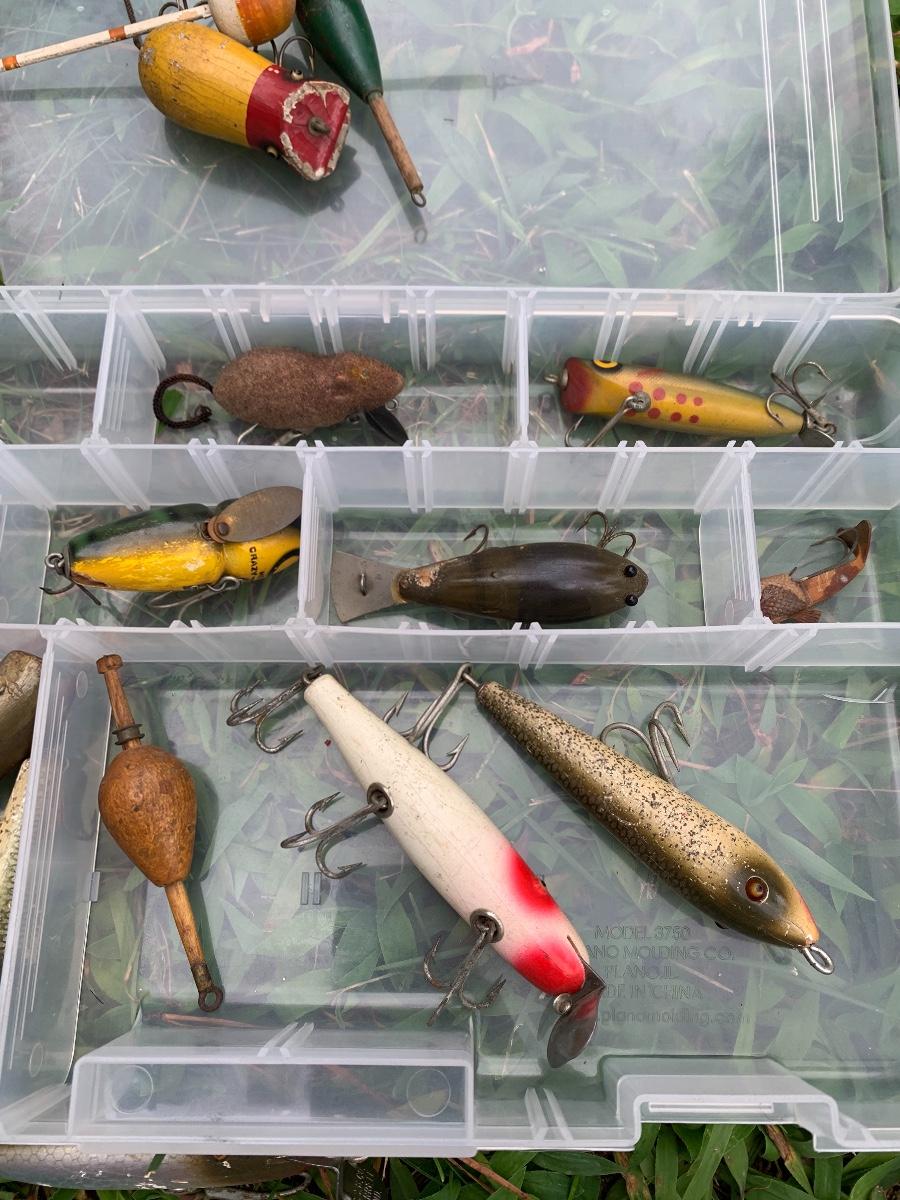 Antique Bamboo Fishing Pole is a Great Decorative Piece. Vintage Fishing Derby Tags along with a nice collection of vintage fishing lures.