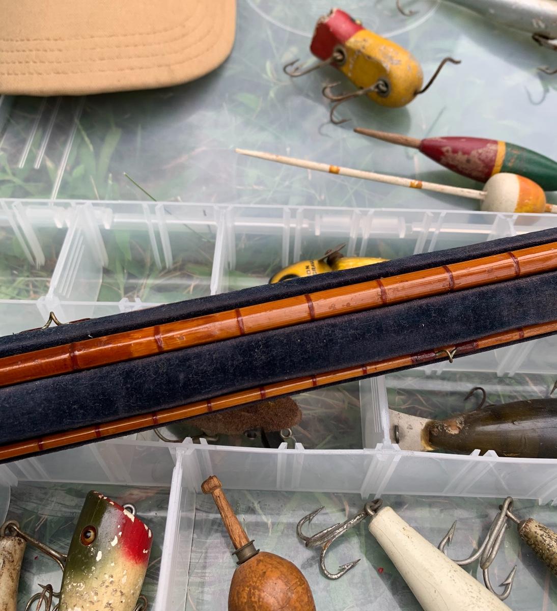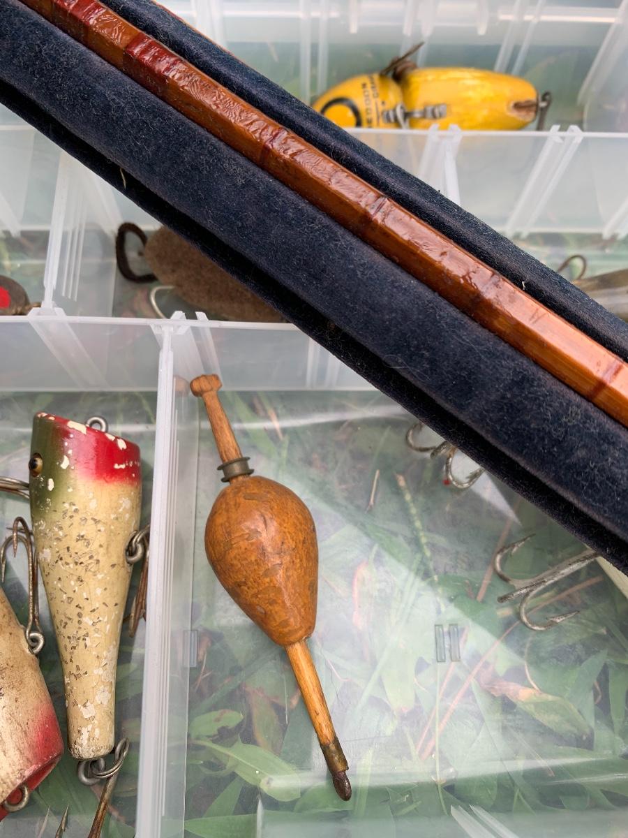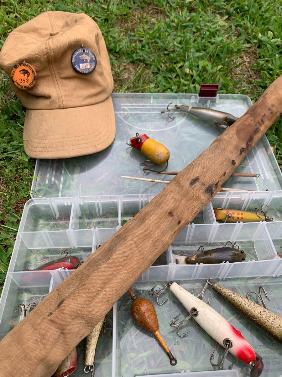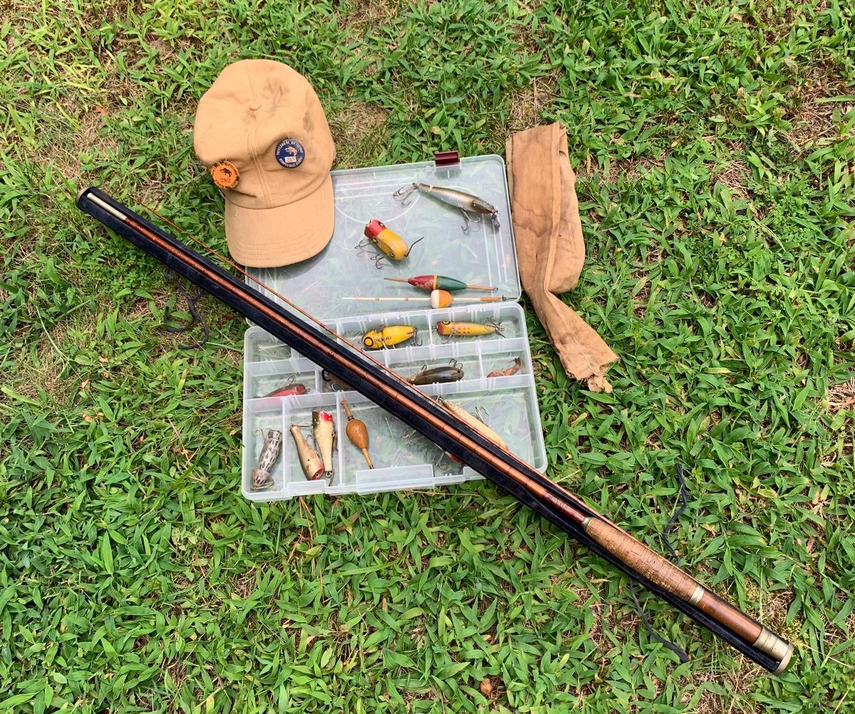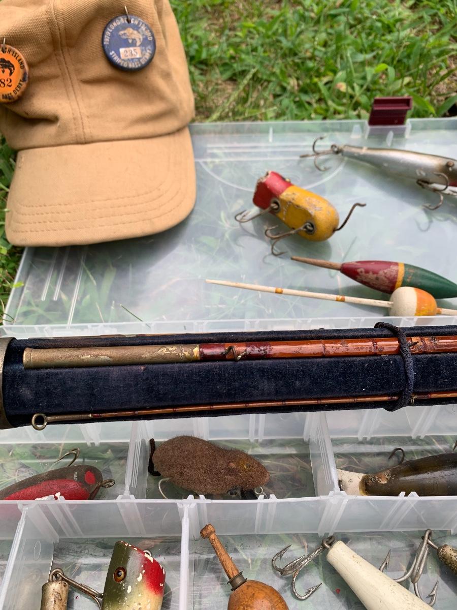 Lot 008: Antique Bamboo Fishing Pole, Vintage Lures, Fly-Fishing Badges & More