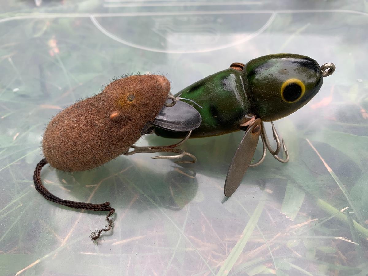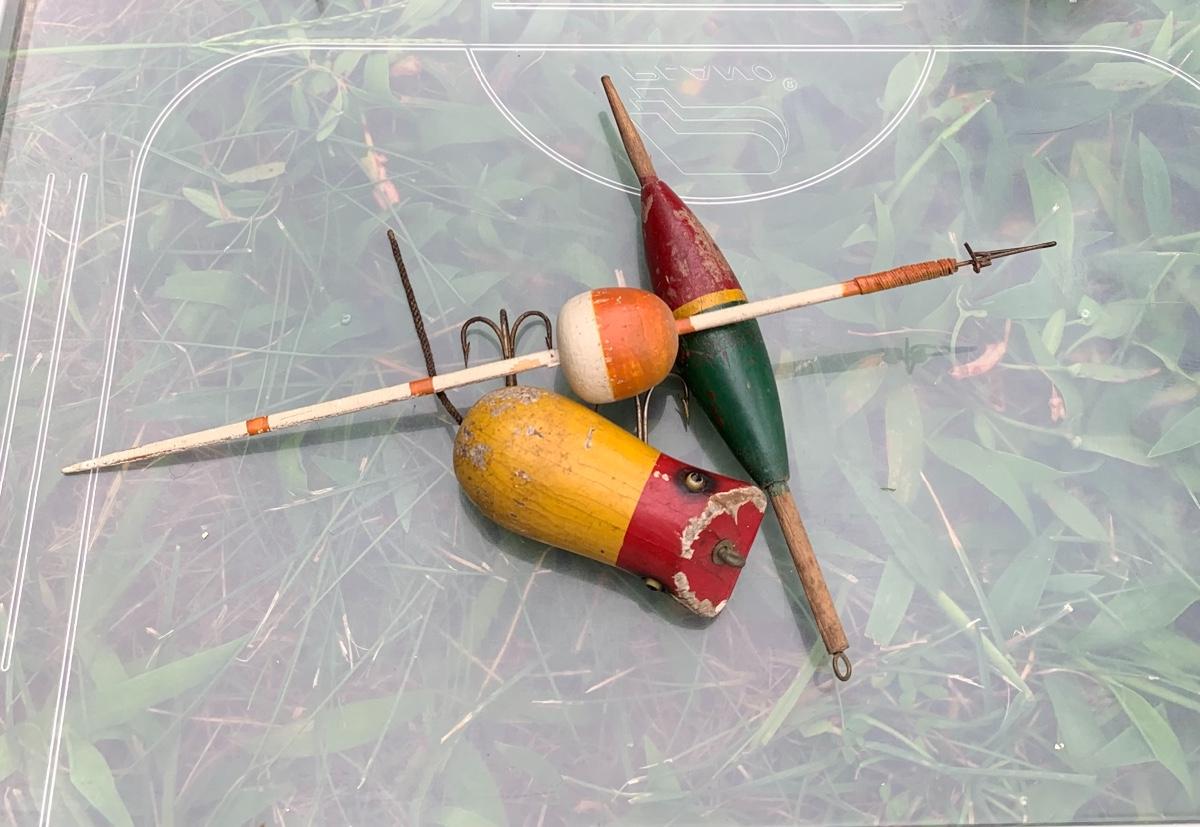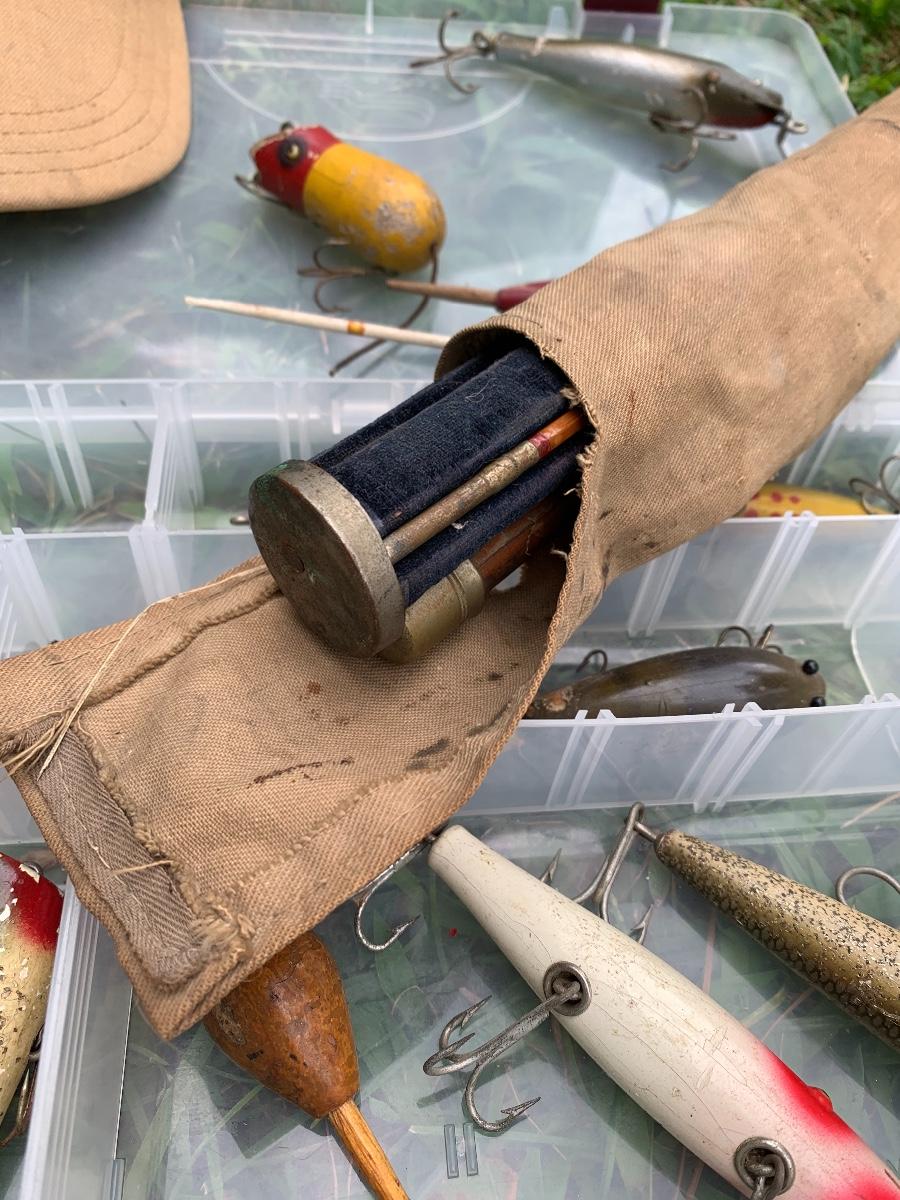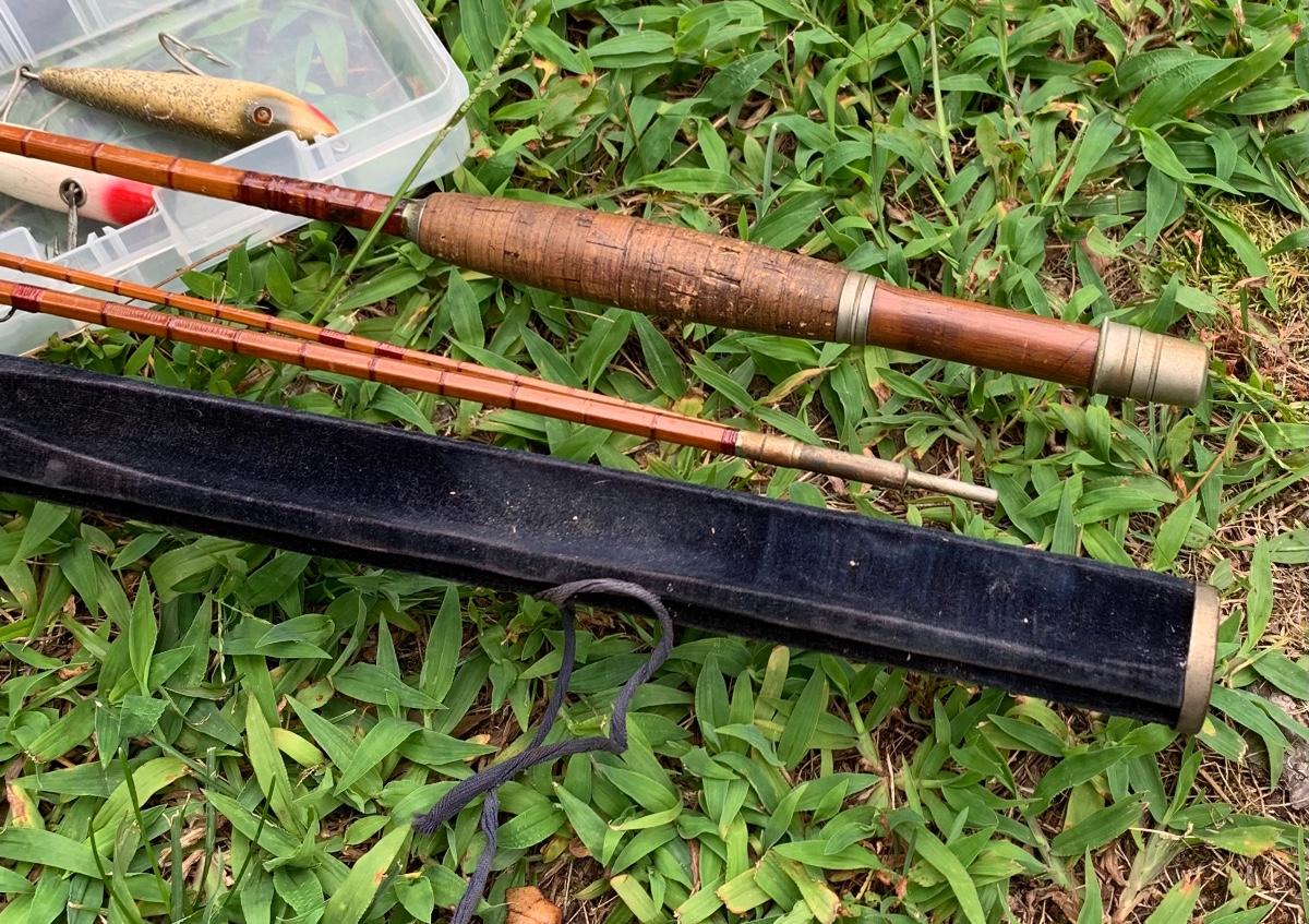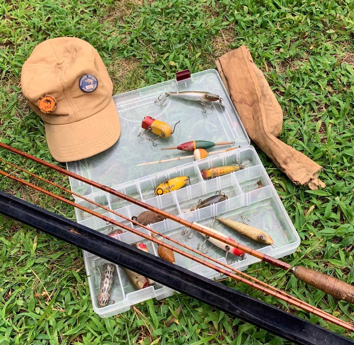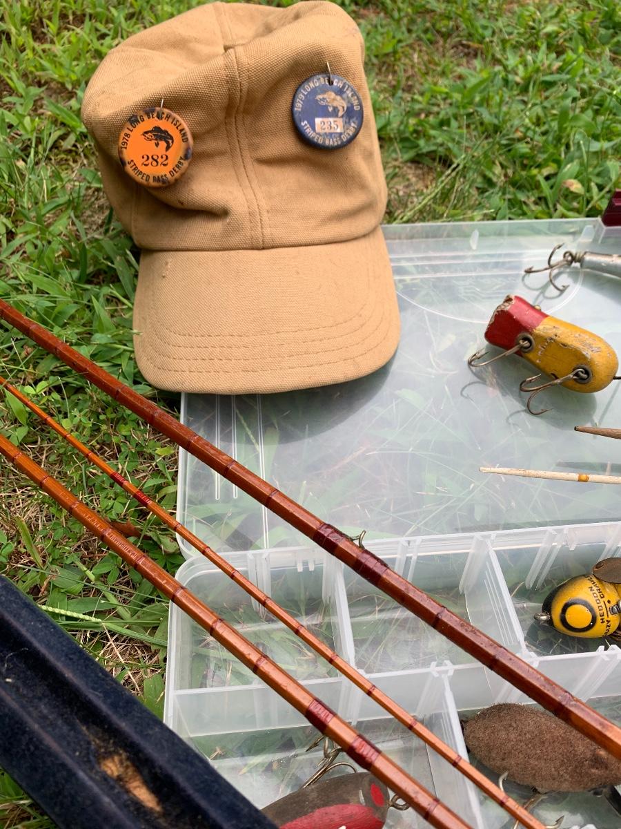 Lot 008: Antique Bamboo Fishing Pole, Vintage Lures, Fly-Fishing Badges & More