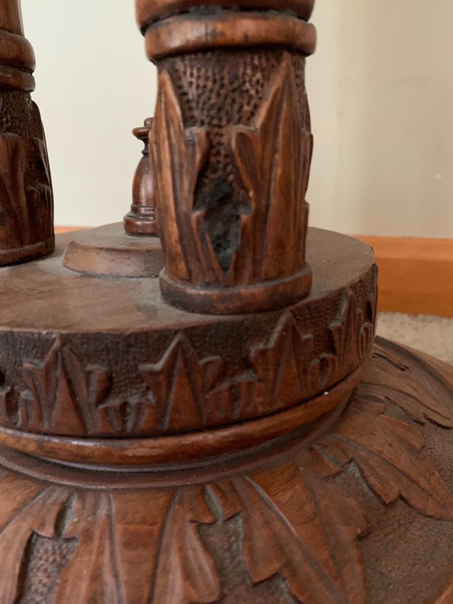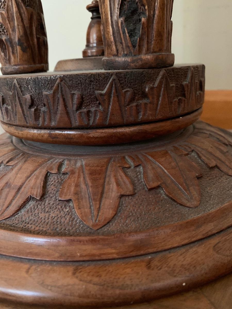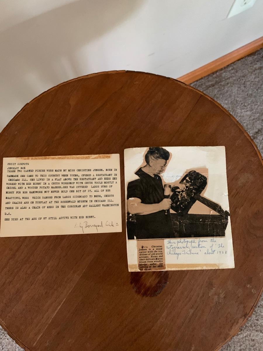 Hand Carved by Mrs. Christine Jenson. This is a beautiful piece of craftsmanship and art.. It is weighted at the bottom to ensure stability. Born in Denmark she came to this country when she was young. She opened a restaurant and lived above it in Chicago IL. It was there she pursued her hobby of wood carving using only crude tools. Mrs. Jenson did not sell her work and had pieces on display in museums. She was also pictured in the Chicago Tribune around 1928..