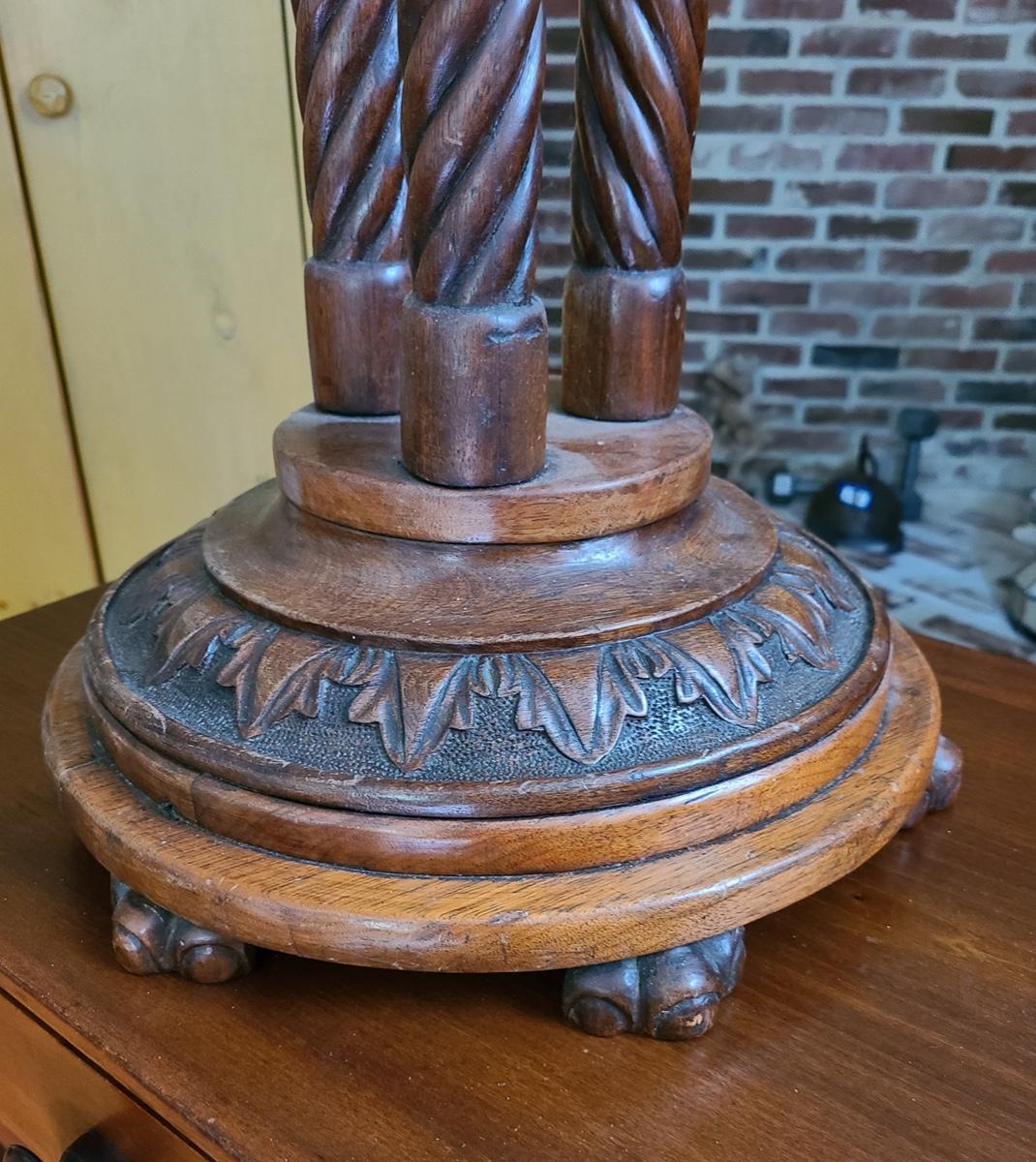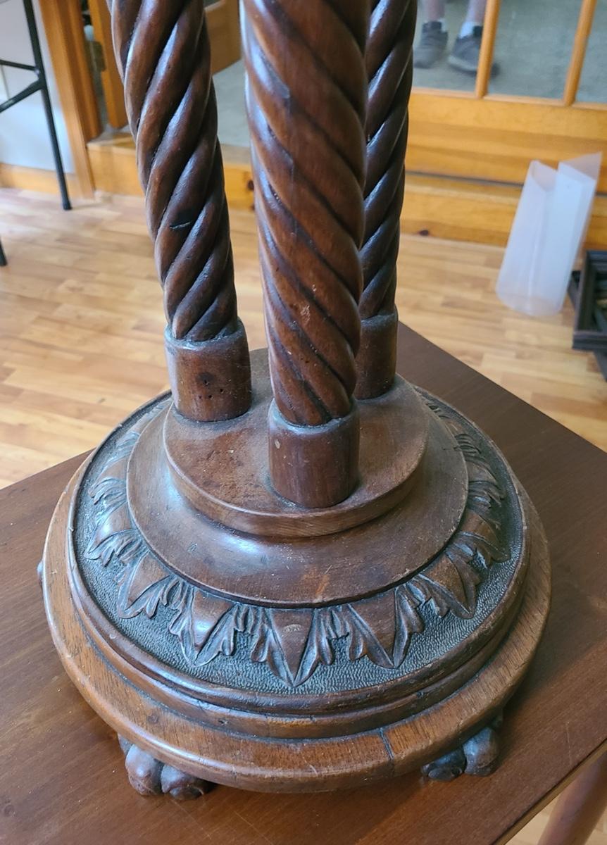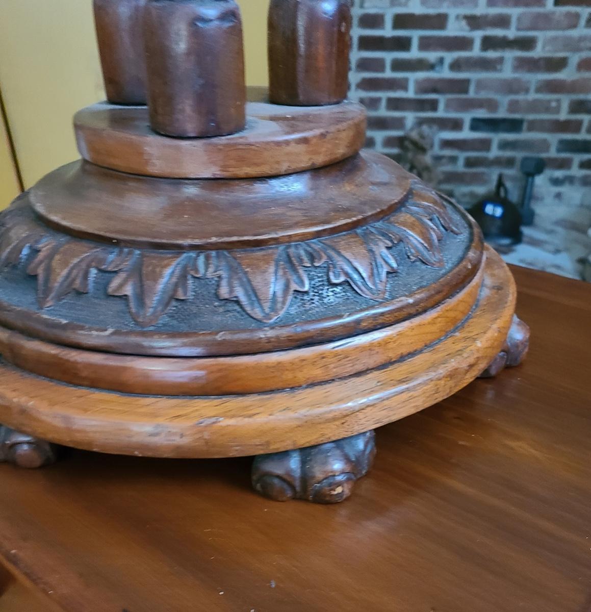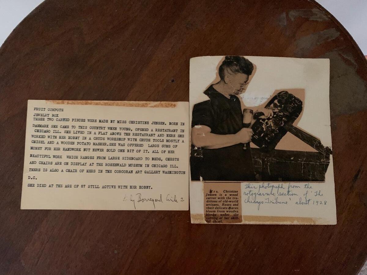 Hand Carved by Mrs. Christine Jenson. This is a beautiful piece of craftsmanship and art. It is weighted at the bottom to ensure stability, and has turned legs. Born in Denmark she came to this country when she was young. She opened a restaurant and lived above it in Chicago IL. It was there she pursued her hobby of wood carving using only crude tools. Mrs. Jenson did not sell her work and had pieces on display in museums. She was also pictured in the Chicago Tribune around 1928.