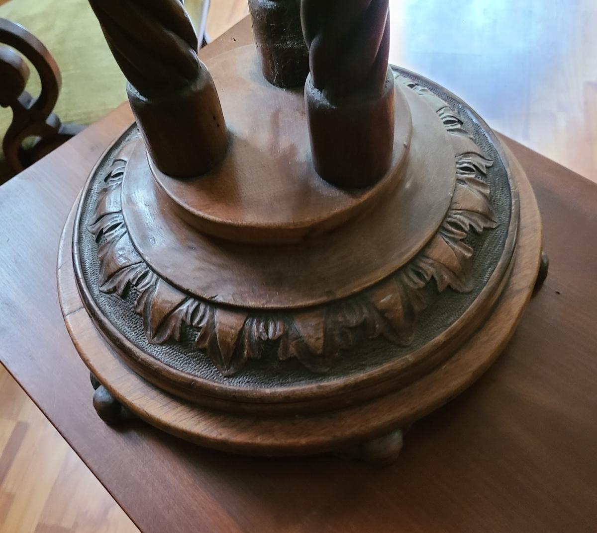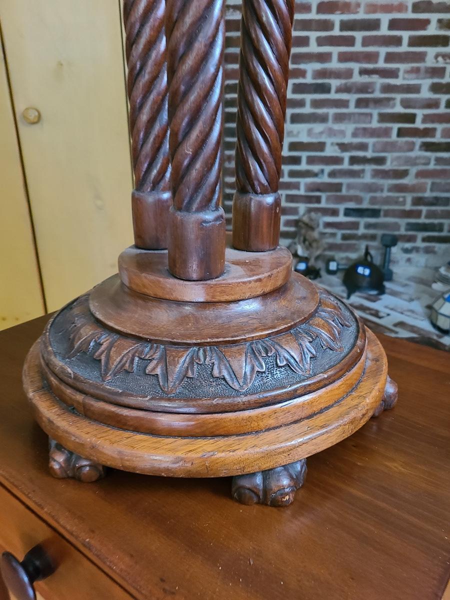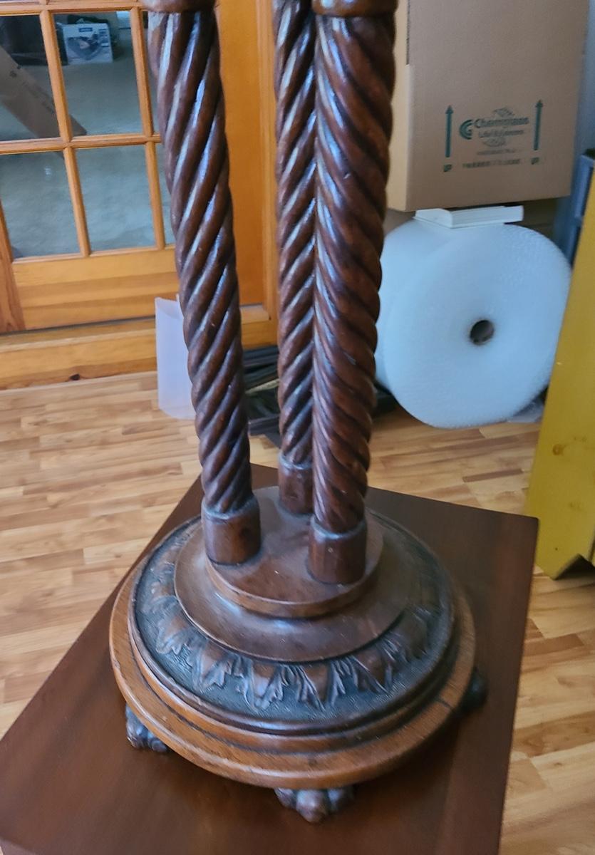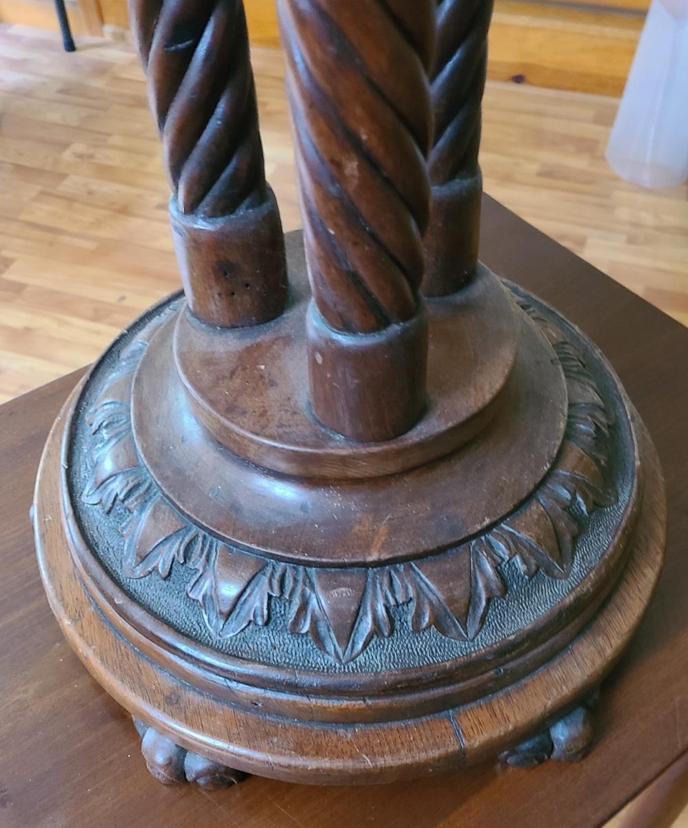 Hand Carved by Mrs. Christine Jenson. This is a beautiful piece of craftsmanship and art. It is weighted at the bottom to ensure stability, and has turned legs. Born in Denmark she came to this country when she was young. She opened a restaurant and lived above it in Chicago IL. It was there she pursued her hobby of wood carving using only crude tools. Mrs. Jenson did not sell her work and had pieces on display in museums. She was also pictured in the Chicago Tribune around 1928.