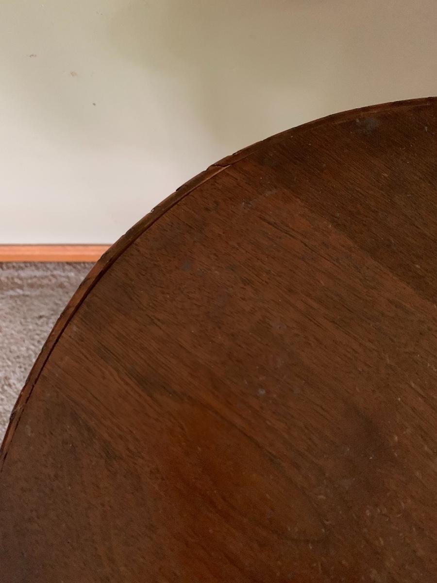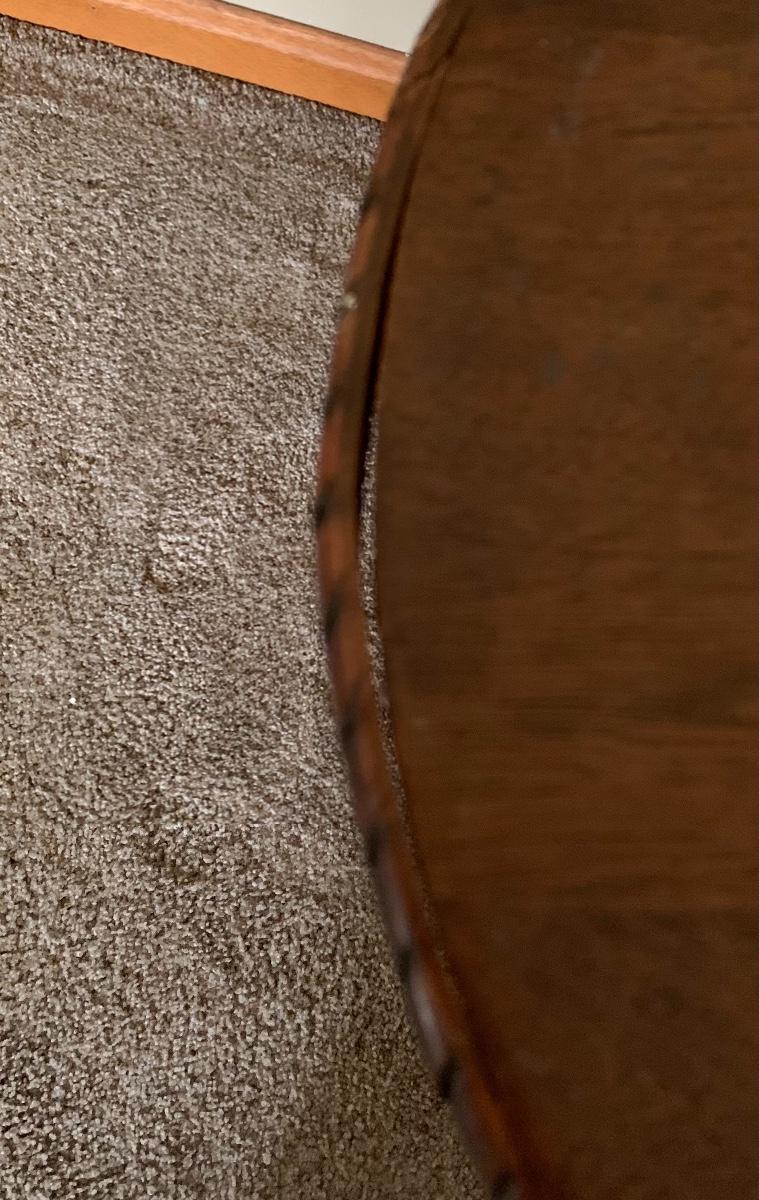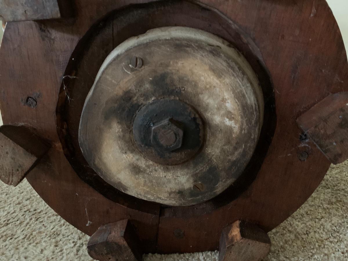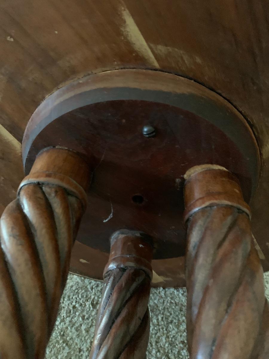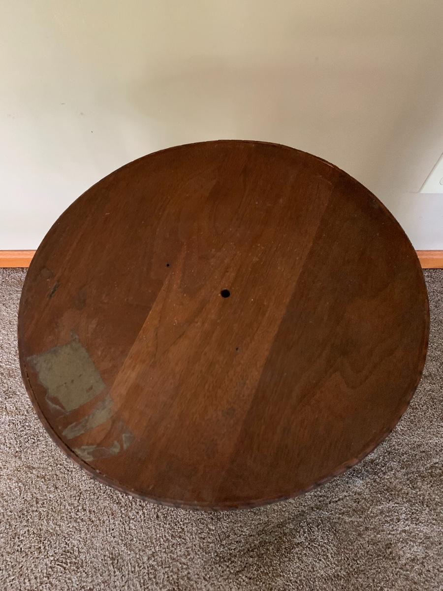Hand Carved by Mrs. Christine Jenson. This is a beautiful piece of craftsmanship and art. It is weighted at the bottom to ensure stability, and has turned legs. Born in Denmark she came to this country when she was young. She opened a restaurant and lived above it in Chicago IL. It was there she pursued her hobby of wood carving using only crude tools. Mrs. Jenson did not sell her work and had pieces on display in museums. She was also pictured in the Chicago Tribune around 1928.