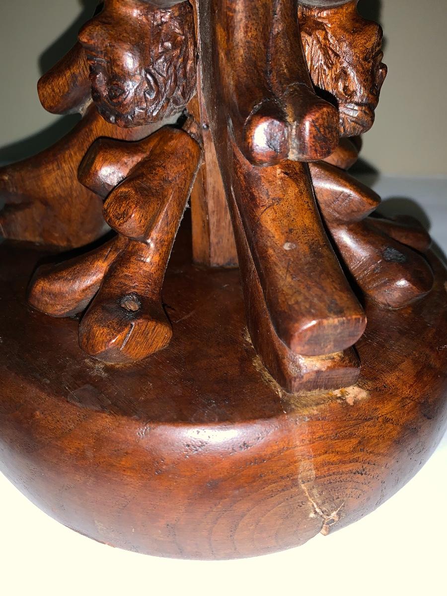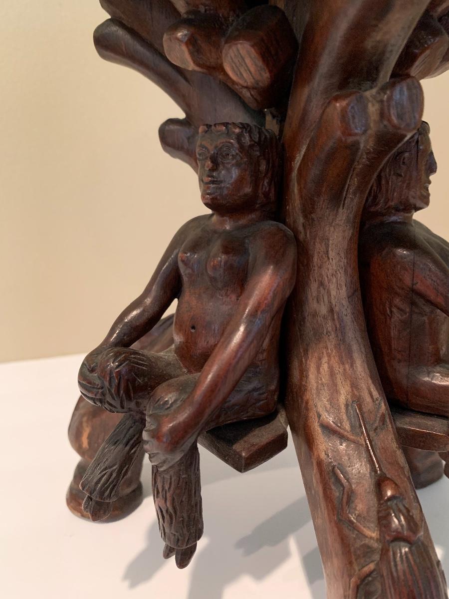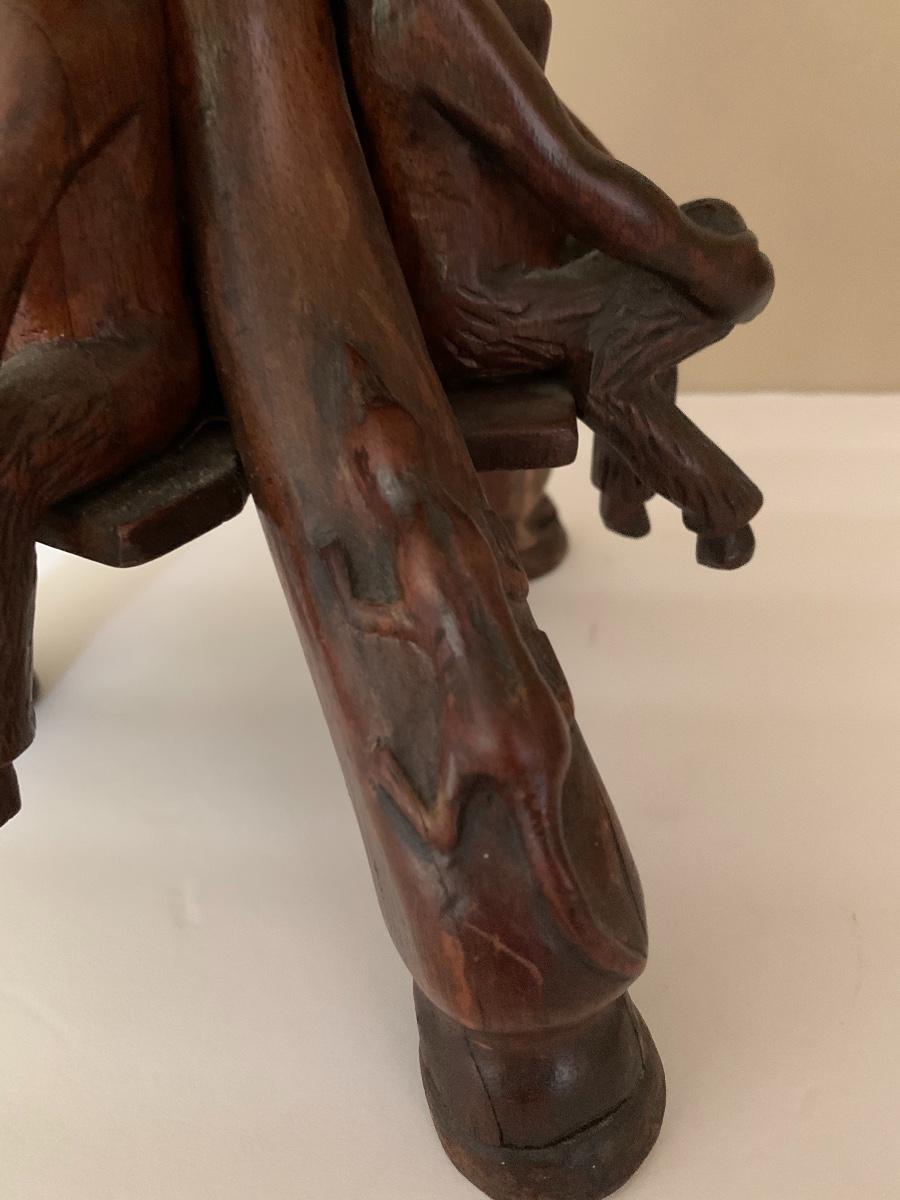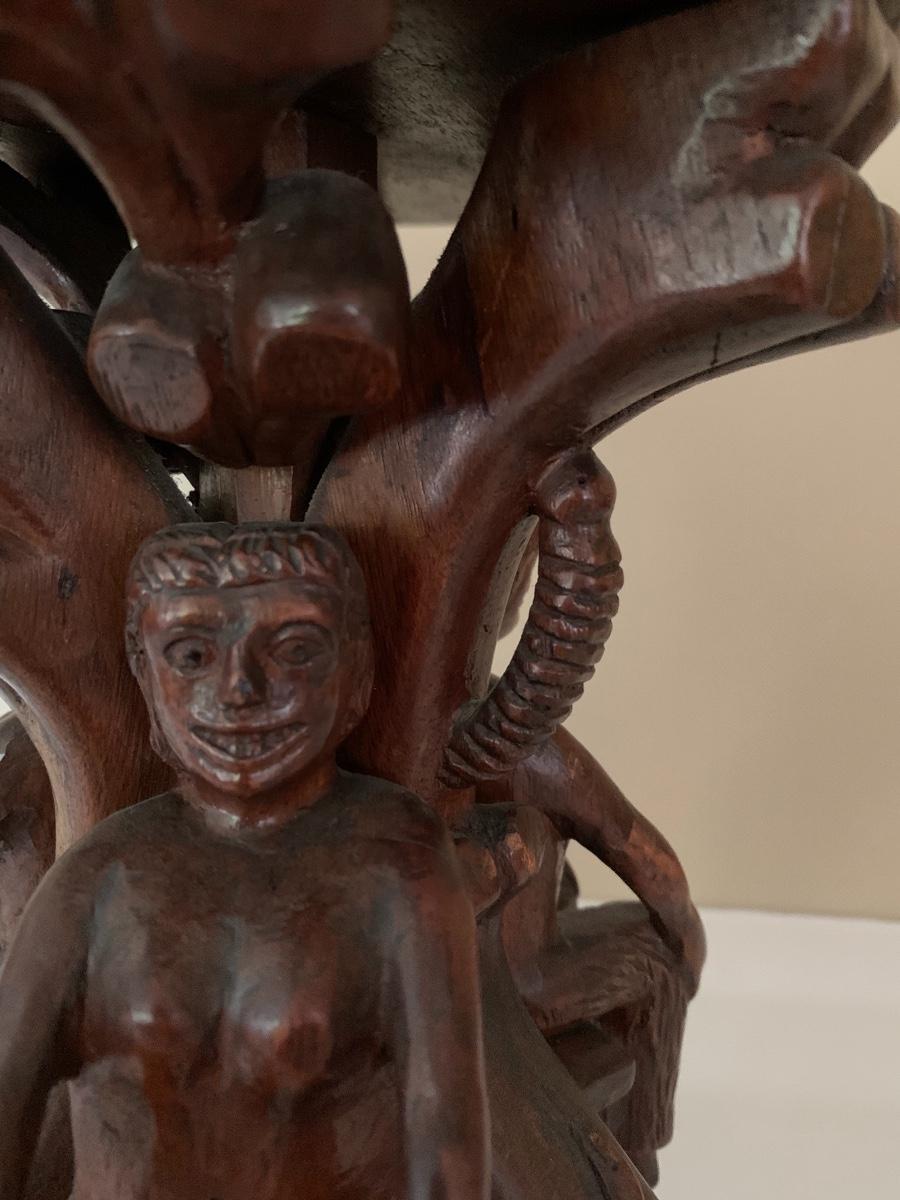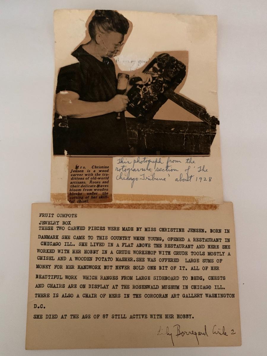 Hand Carved by Mrs. Christine Jenson. This is a beautiful piece of craftsmanship and art. Born in Denmark she came to this country when she was young. She opened a restaurant and lived above it in Chicago IL. It was there she pursued her hobby of wood carving using only crude tools. Mrs. Jenson did not sell her work and had pieces on display in museums. She was also pictured in the Chicago Tribune around 1928.