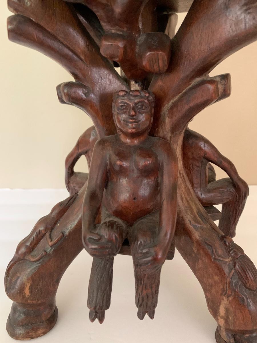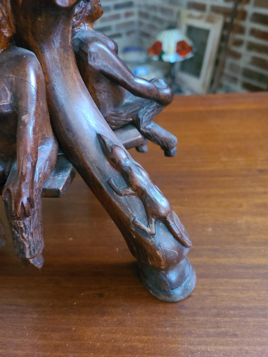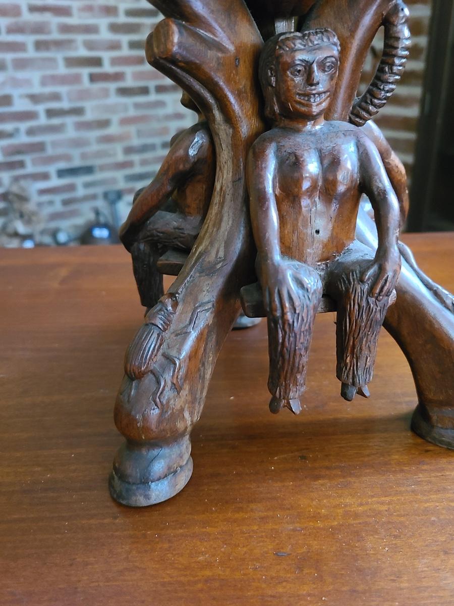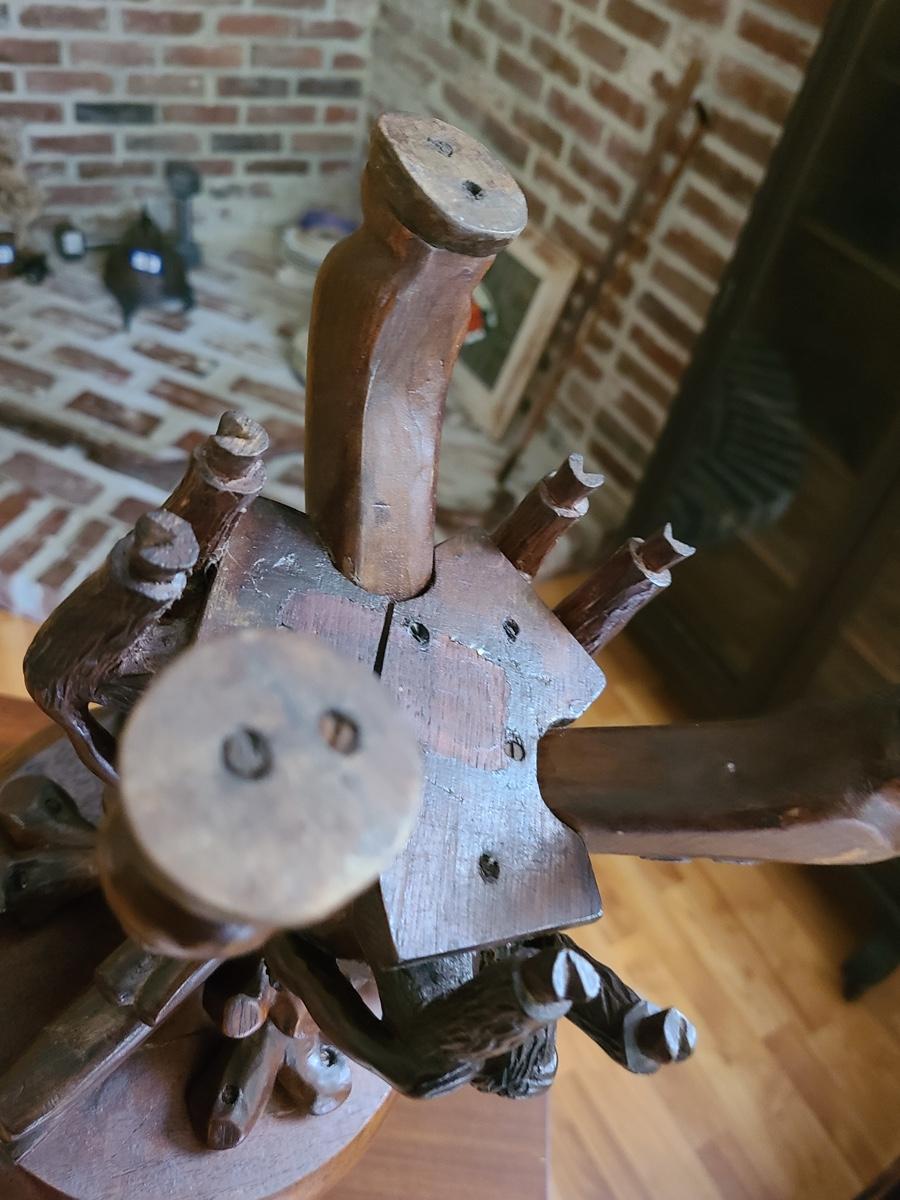 Hand Carved by Mrs. Christine Jenson. This is a beautiful piece of craftsmanship and art. Born in Denmark she came to this country when she was young. She opened a restaurant and lived above it in Chicago IL. It was there she pursued her hobby of wood carving using only crude tools. Mrs. Jenson did not sell her work and had pieces on display in museums. She was also pictured in the Chicago Tribune around 1928.