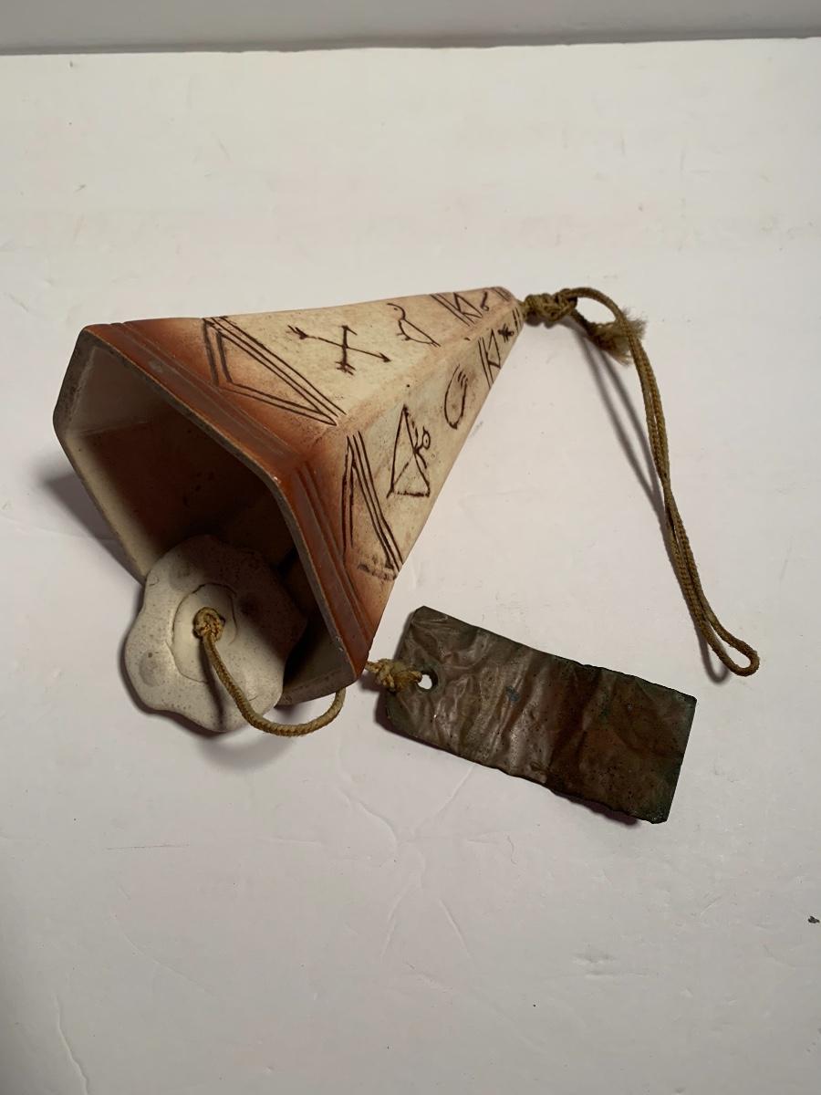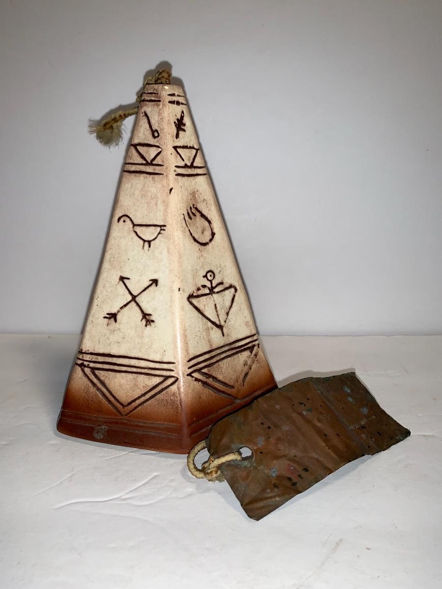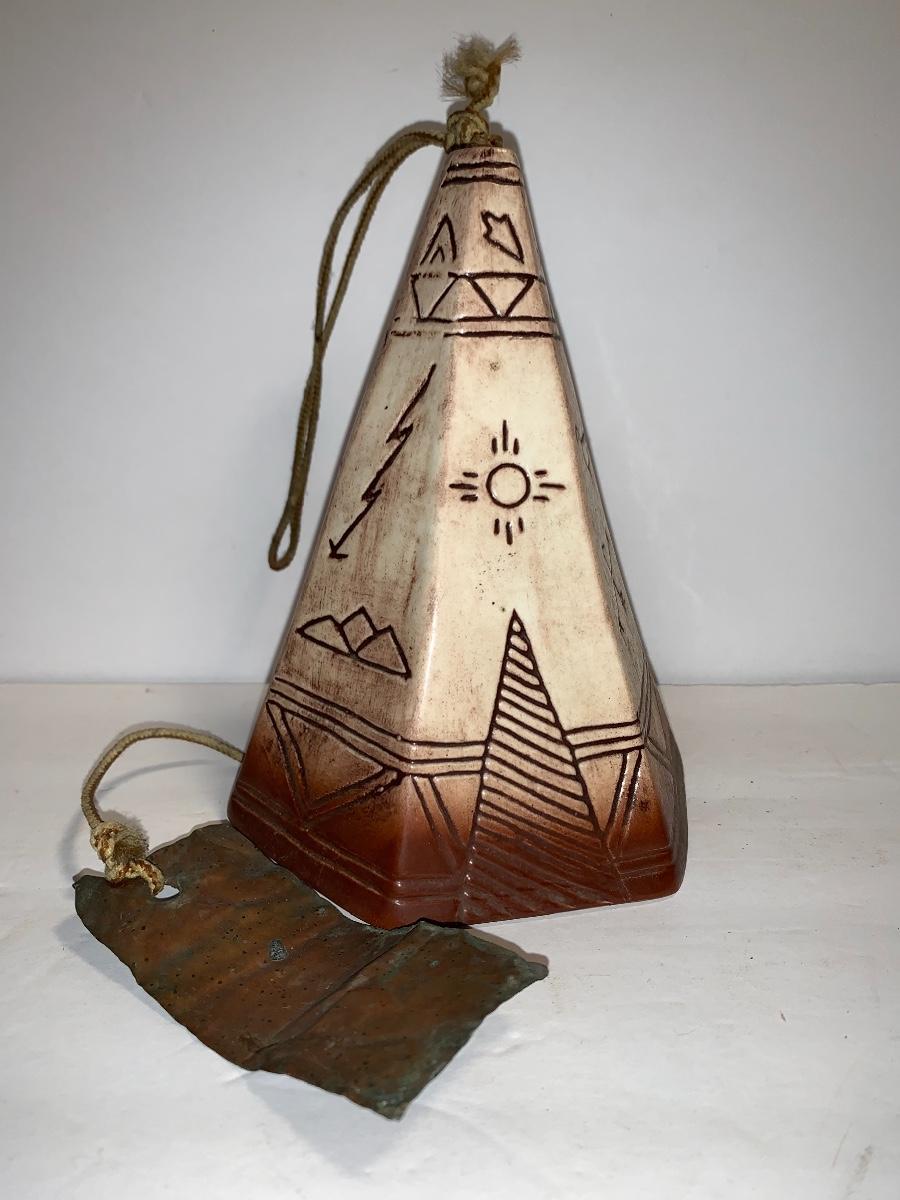 Hexagon Teepee Style Wind-chime, Etched Pottery handmade by the Blackhorse family, Blanding Utah,, signed piece from Cherokee, NC.