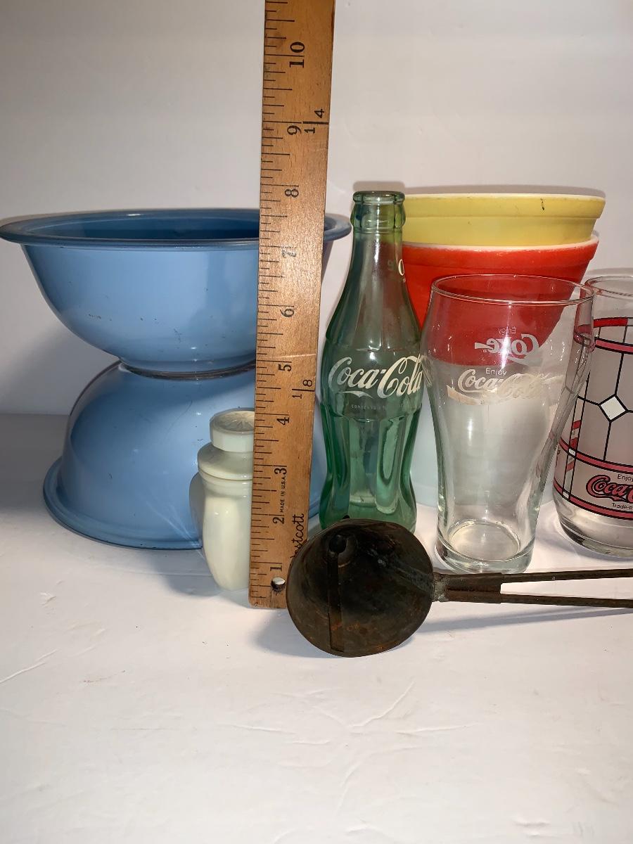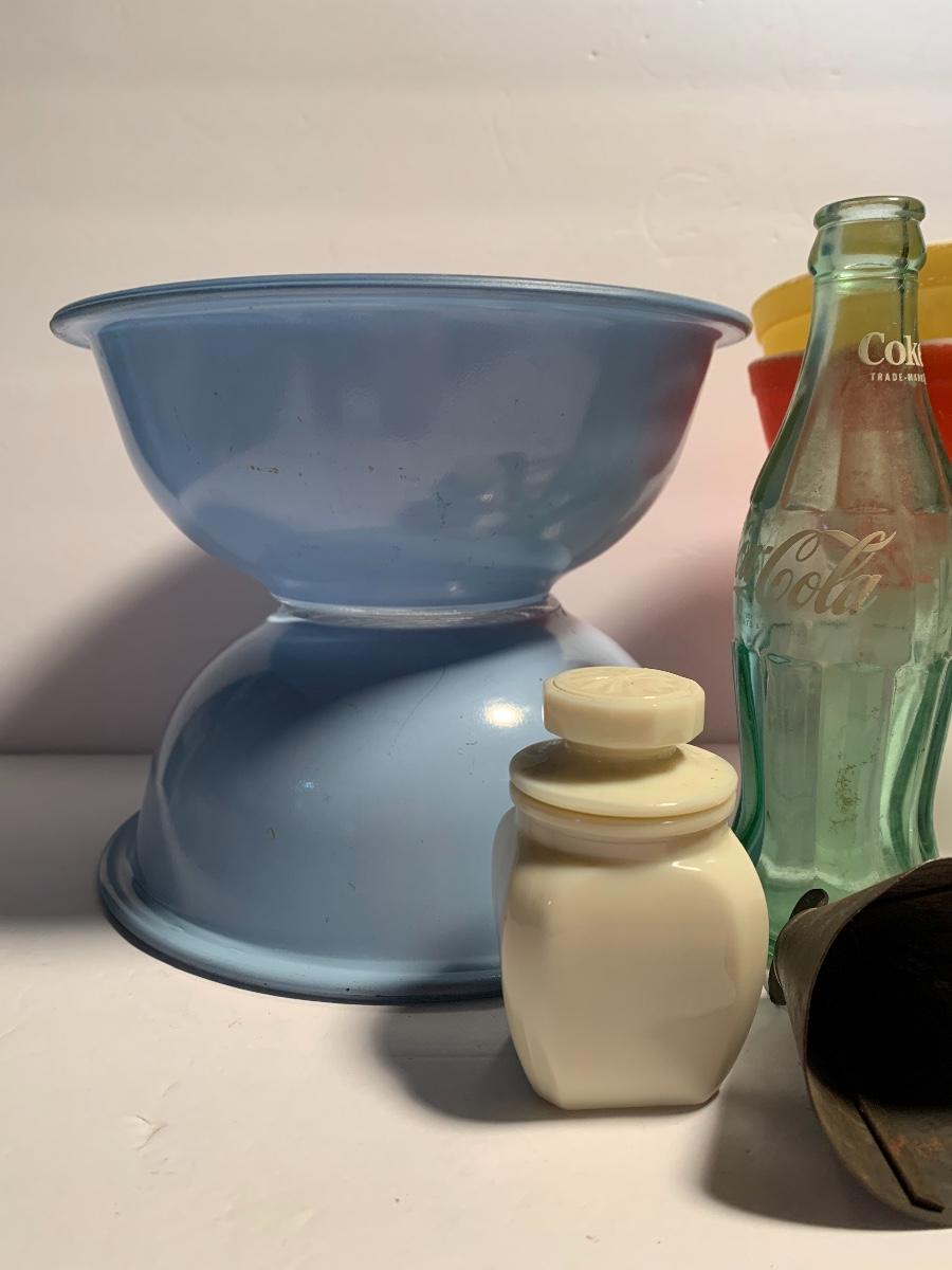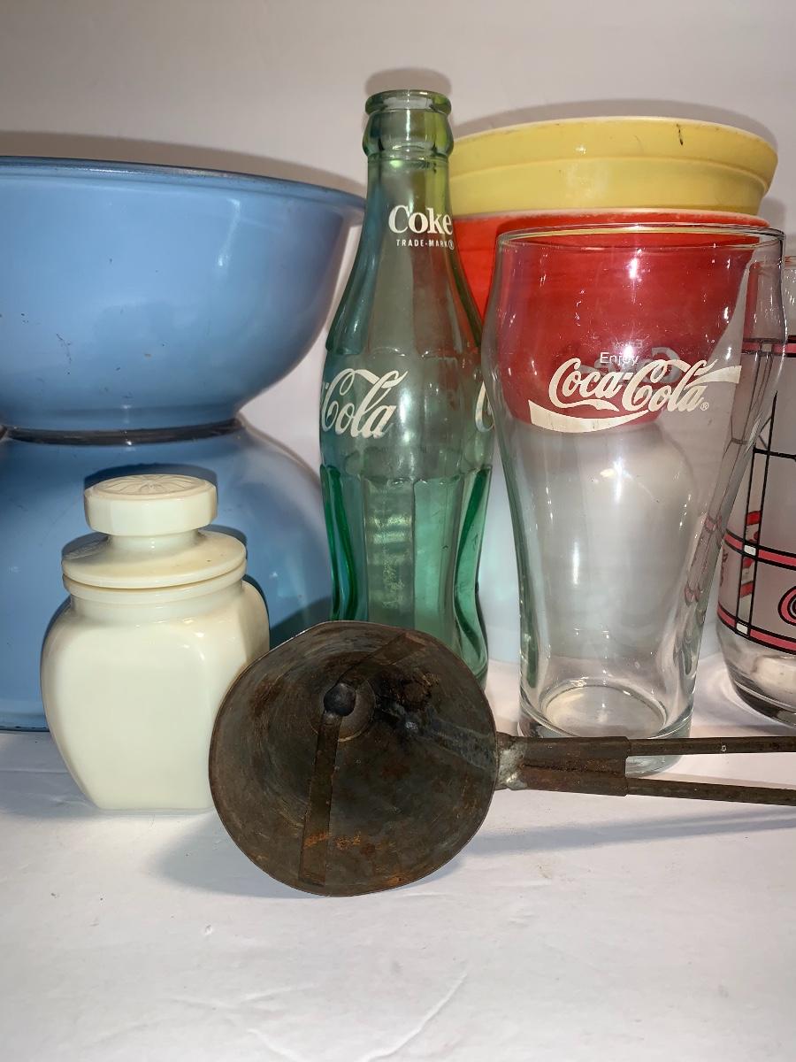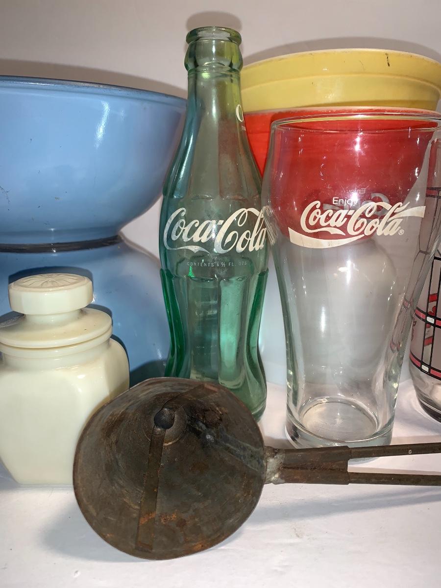 Antique ice cream scoop, Vintage Coke bottle & glasses, vintage Pyrex bowls with nice color and more for you to enjoy.