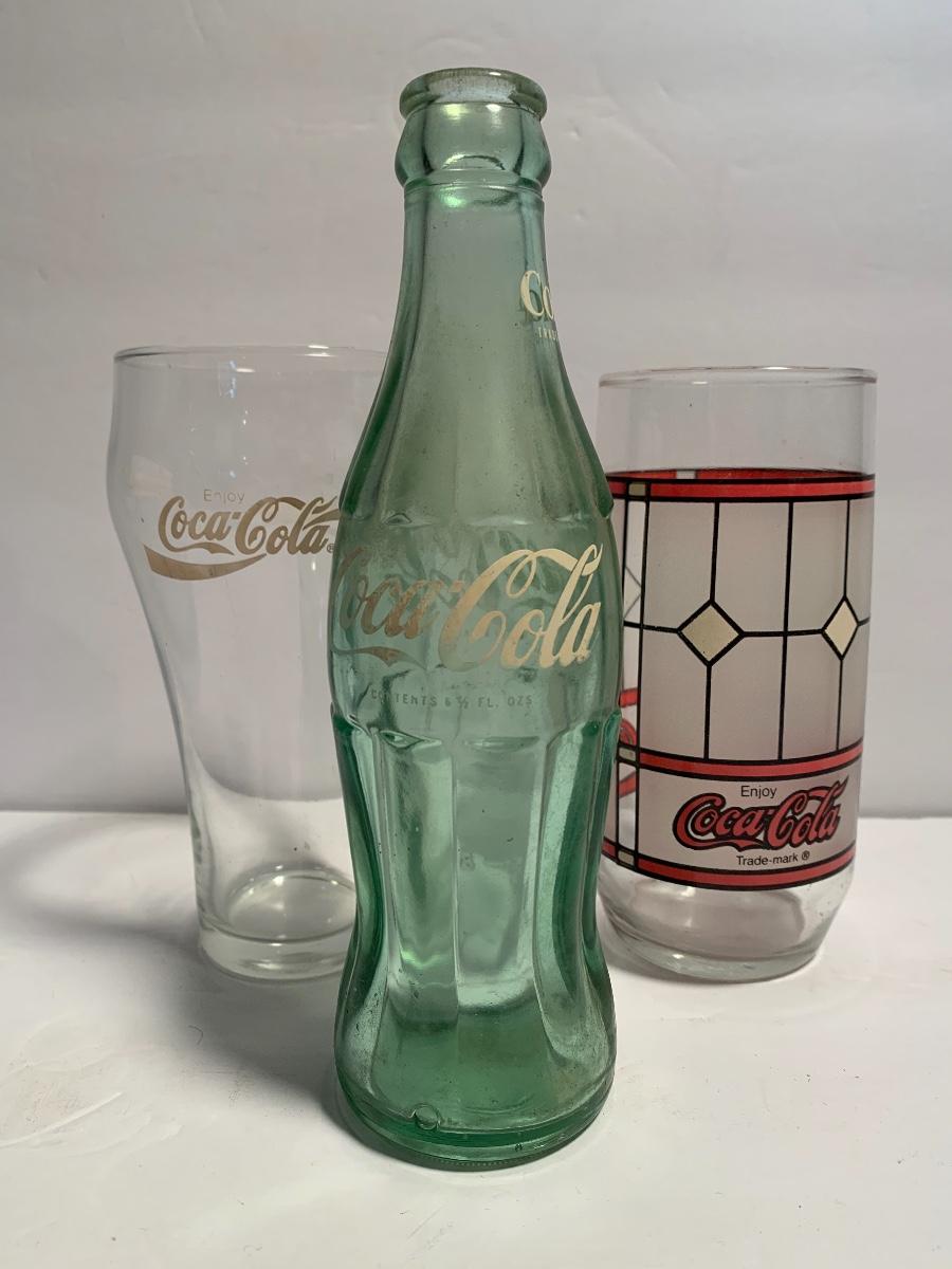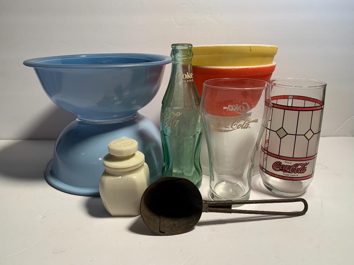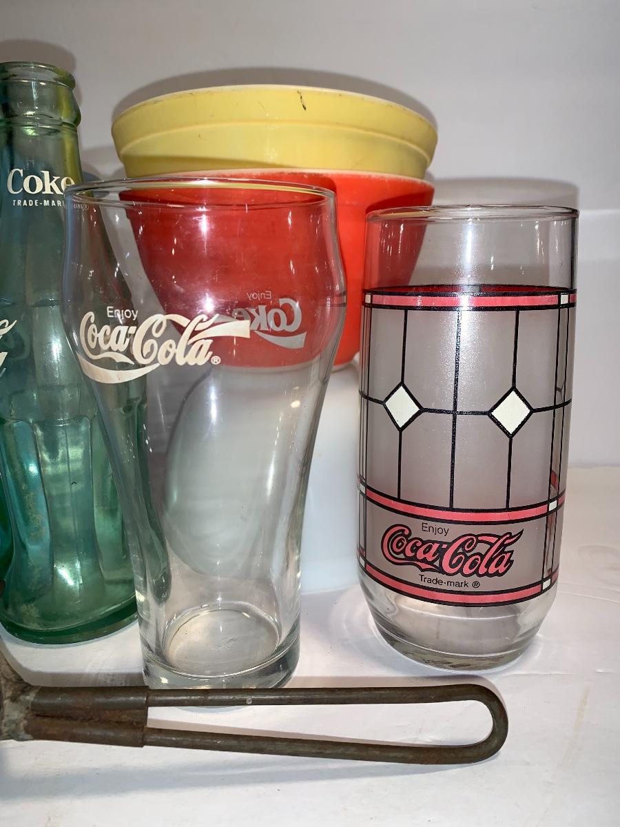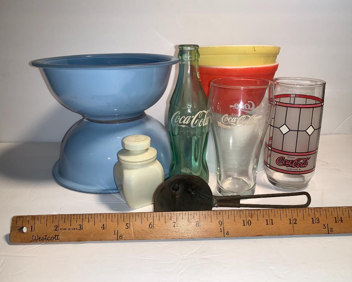 Antique ice cream scoop, Vintage Coke bottle & glasses, vintage Pyrex bowls with nice color and more for you to enjoy.