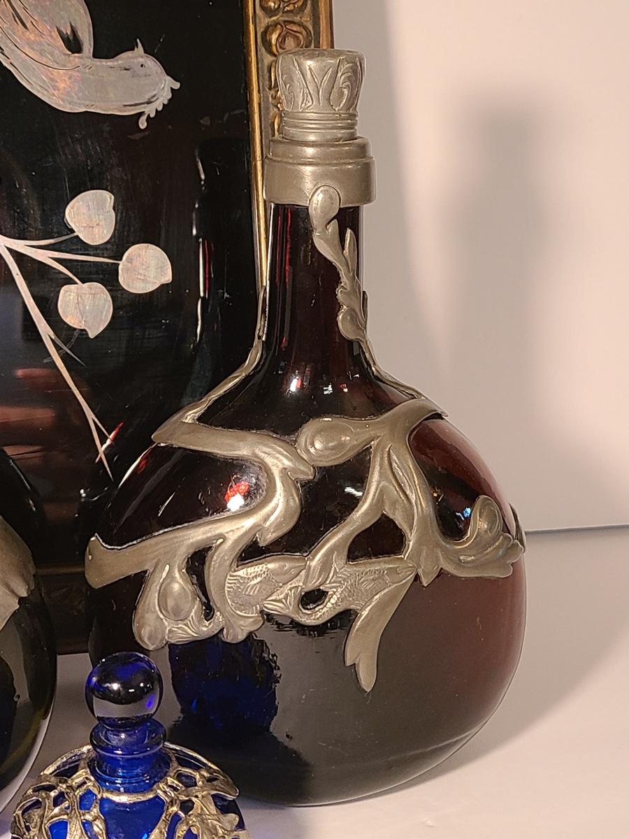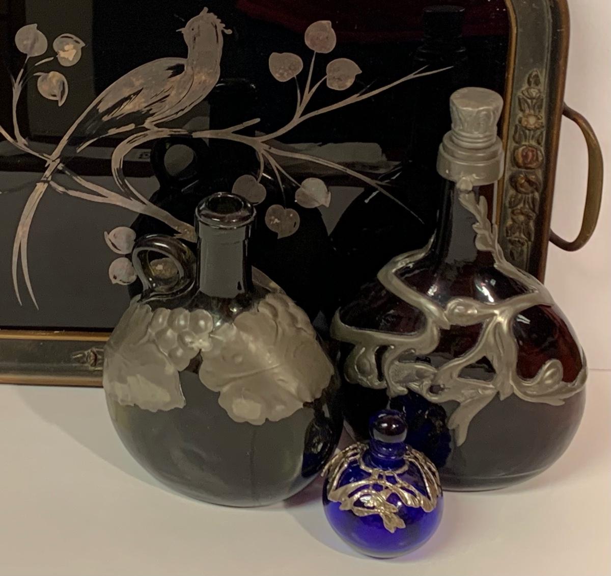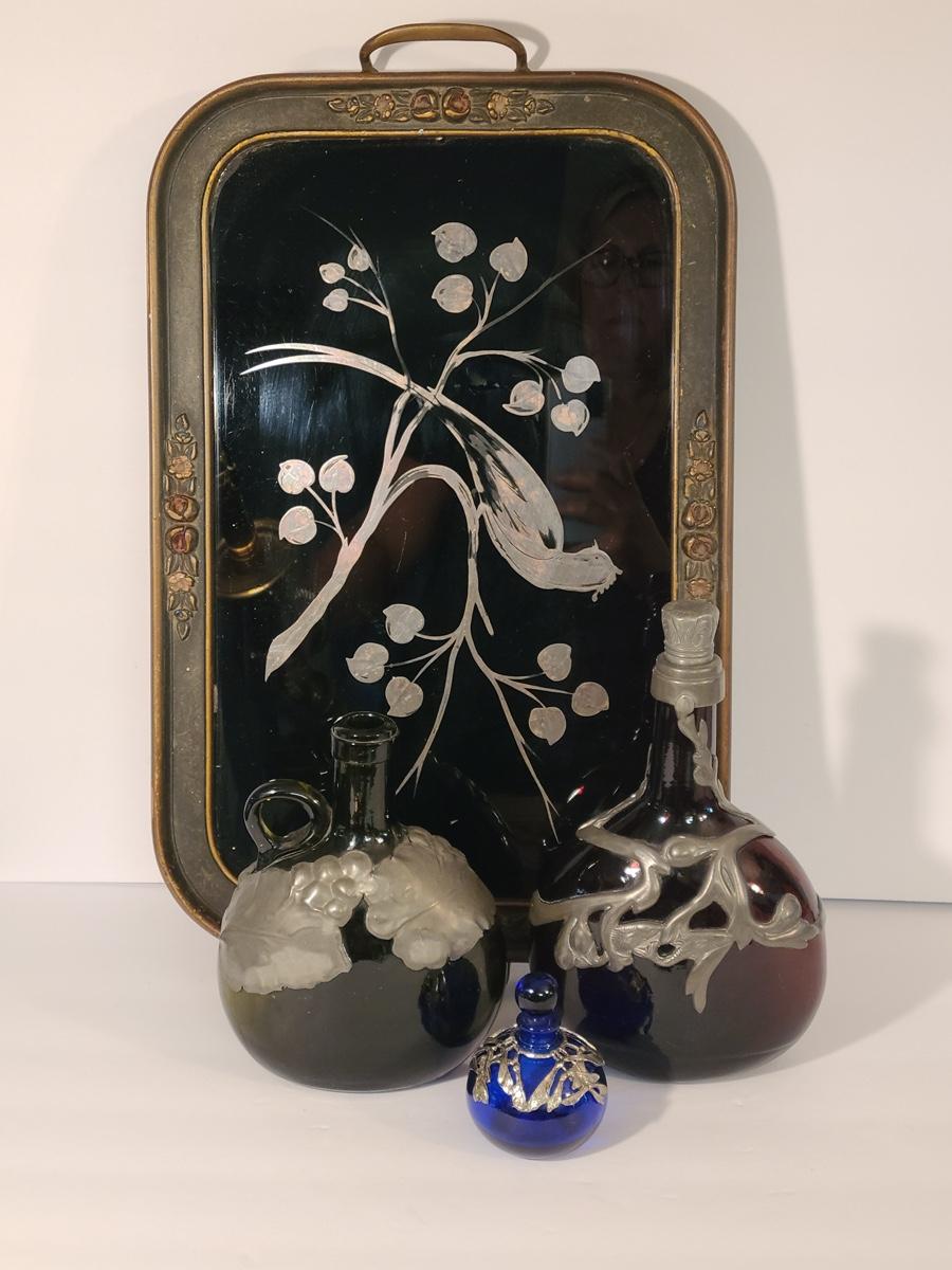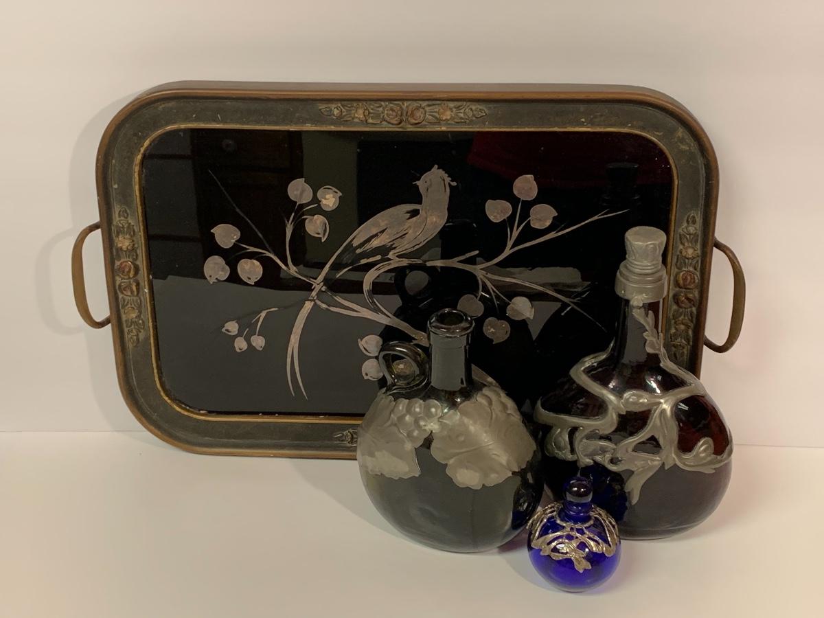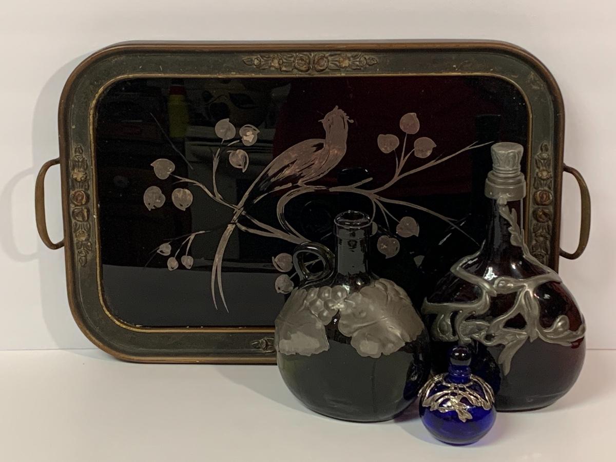 Art Deco bird style serving tray with mirrored look. Red & green wine decanters have patterned overlays. Cobalt blue bottle with overlay - stopper has small chip.