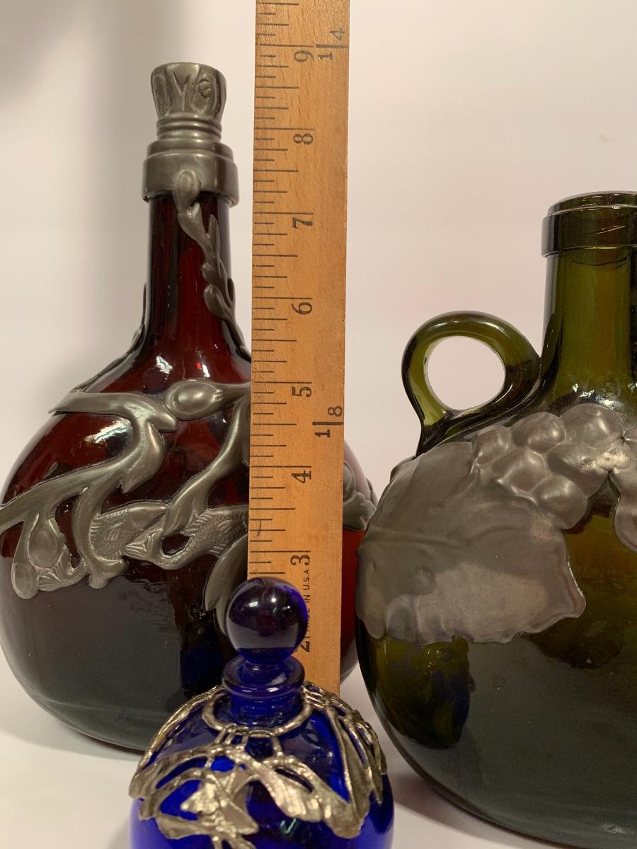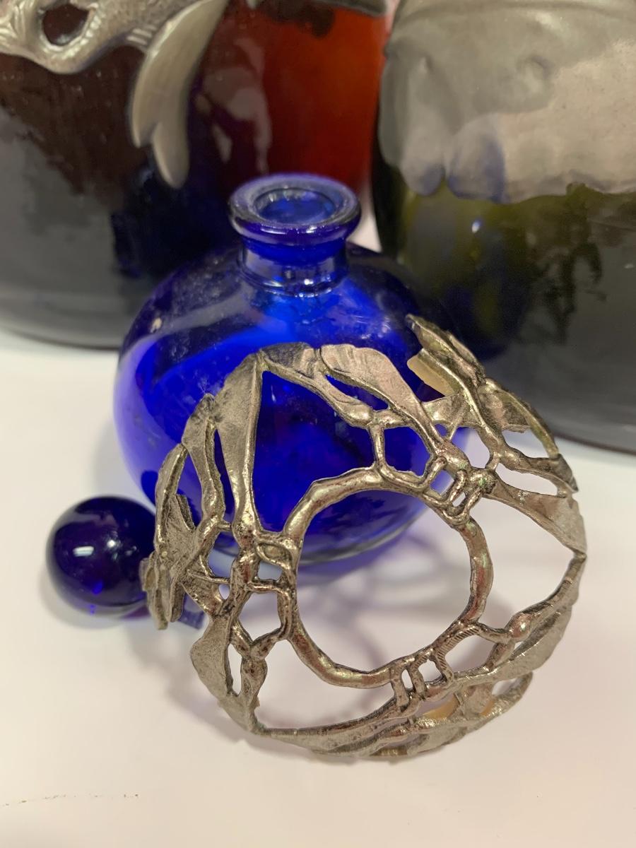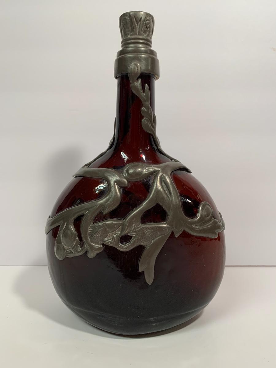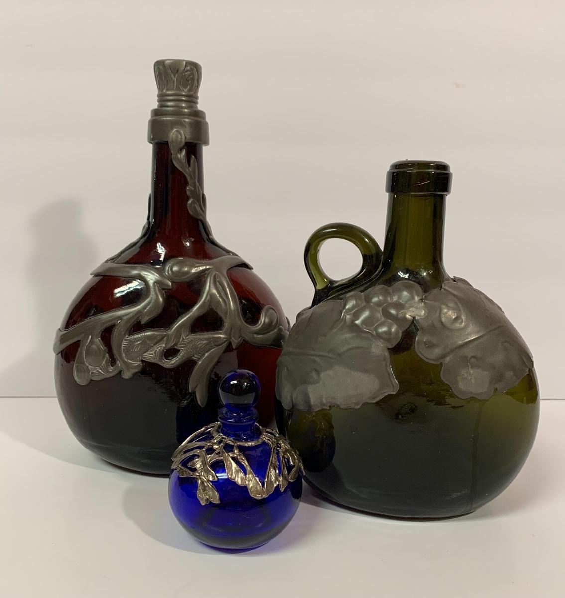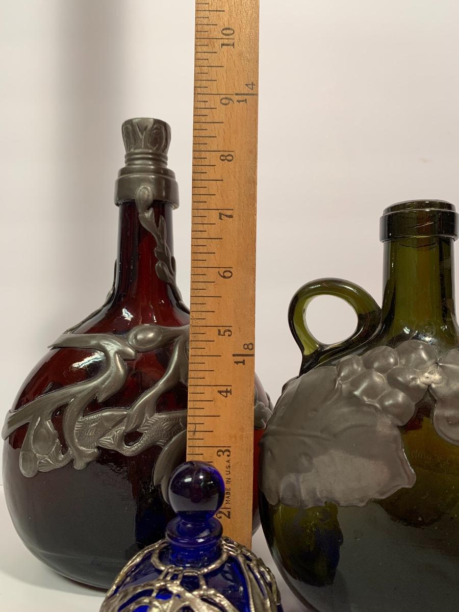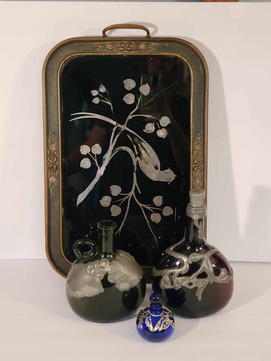 Art Deco bird style serving tray with mirrored look. Red & green wine decanters have patterned overlays. Cobalt blue bottle with overlay - stopper has small chip.