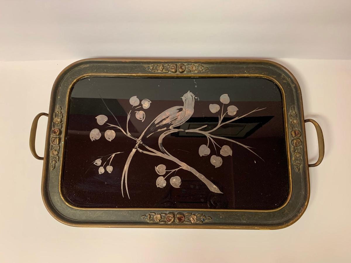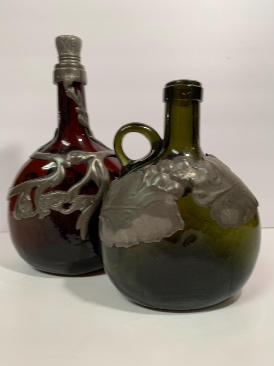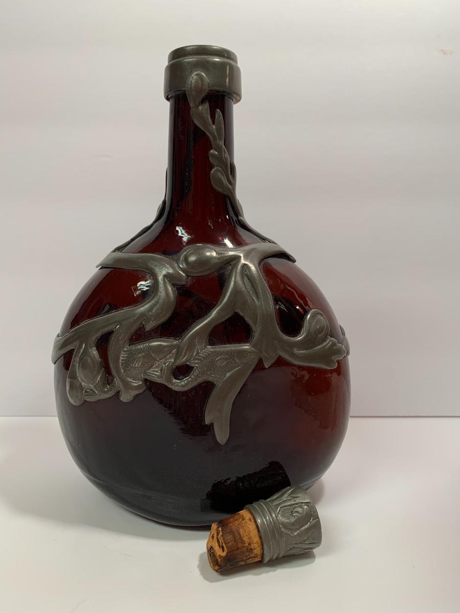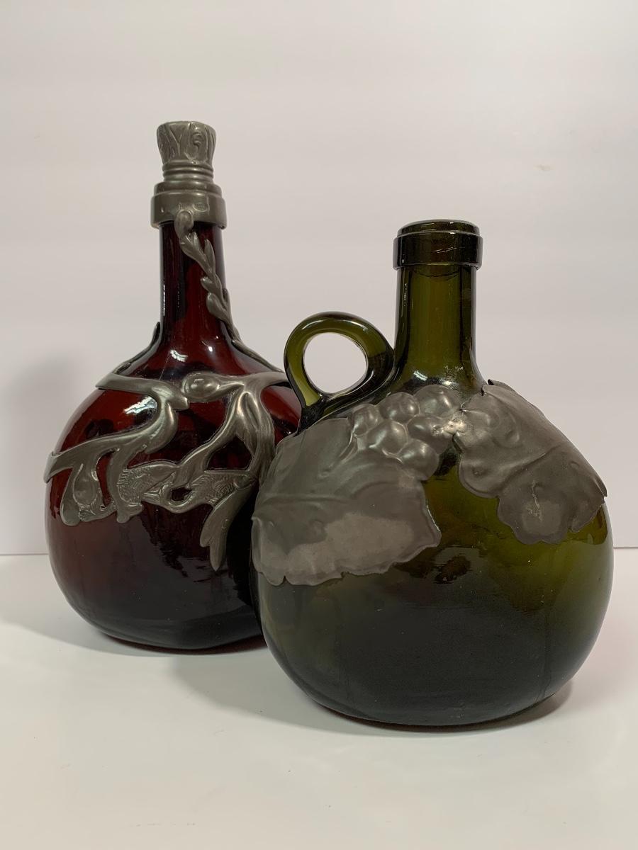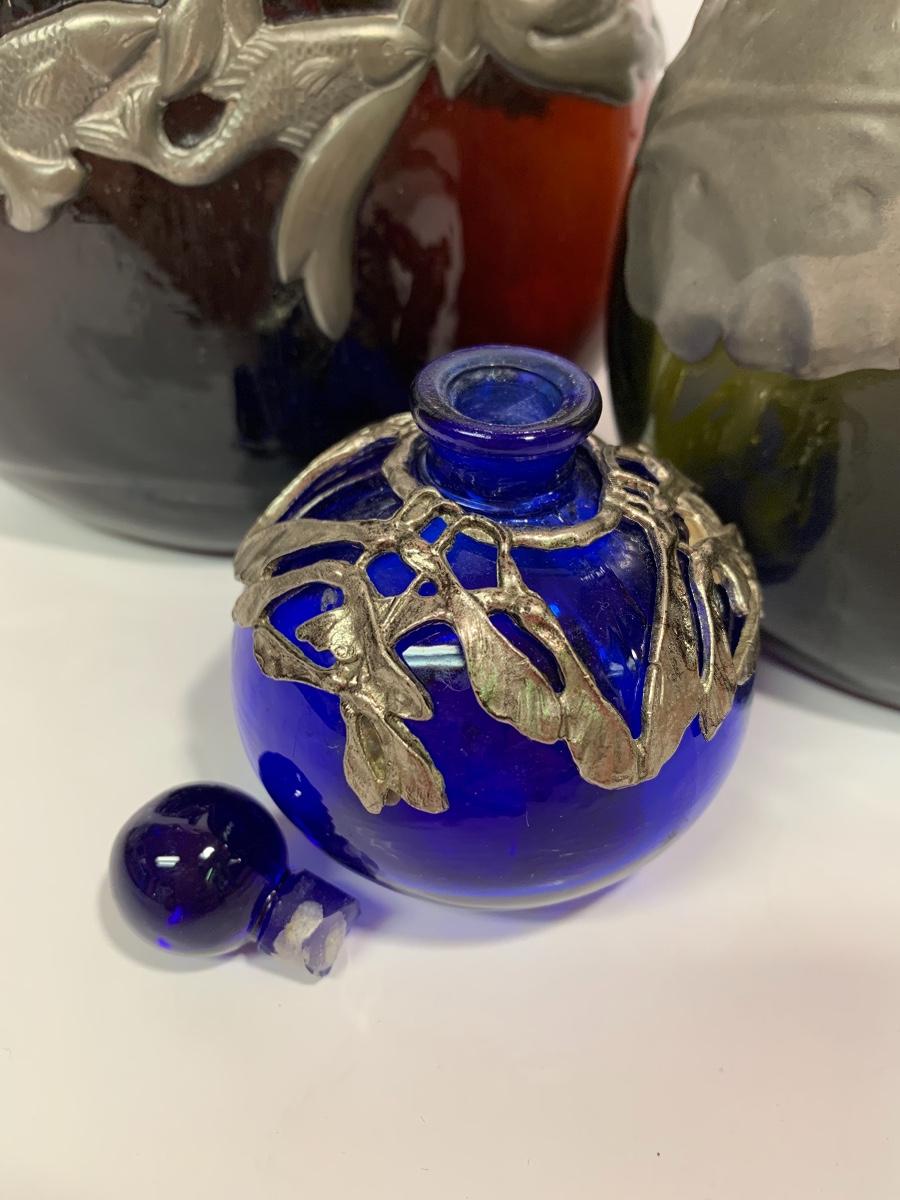 Art Deco bird style serving tray with mirrored look. Red & green wine decanters have patterned overlays. Cobalt blue bottle with overlay - stopper has small chip.