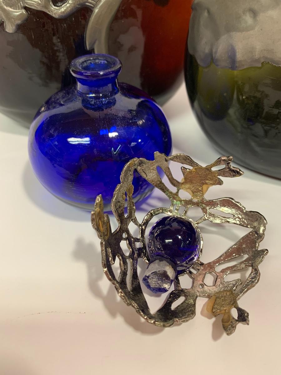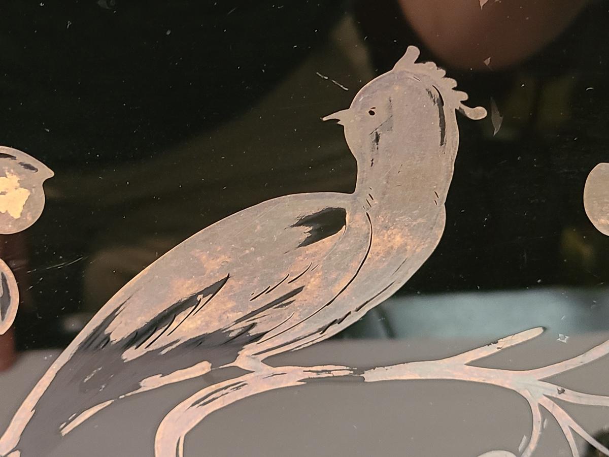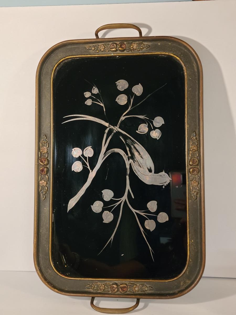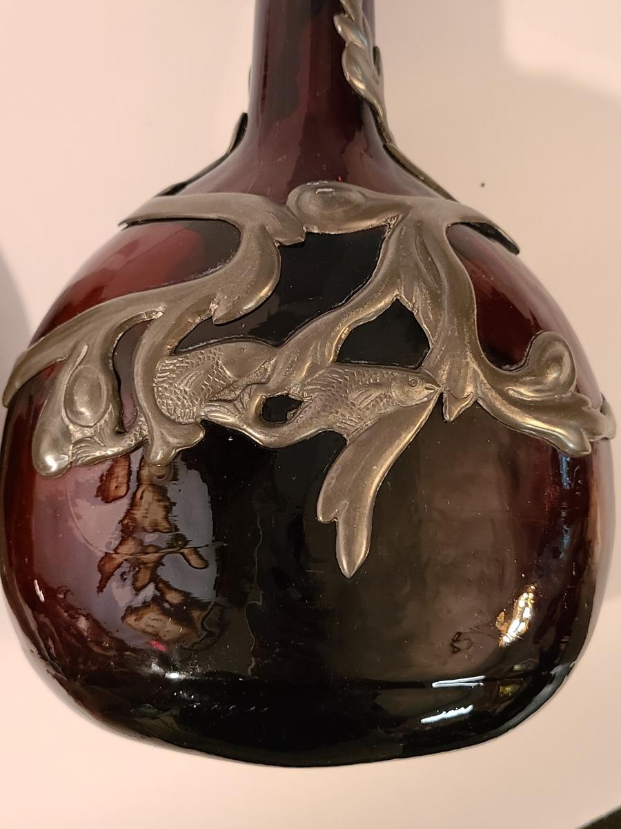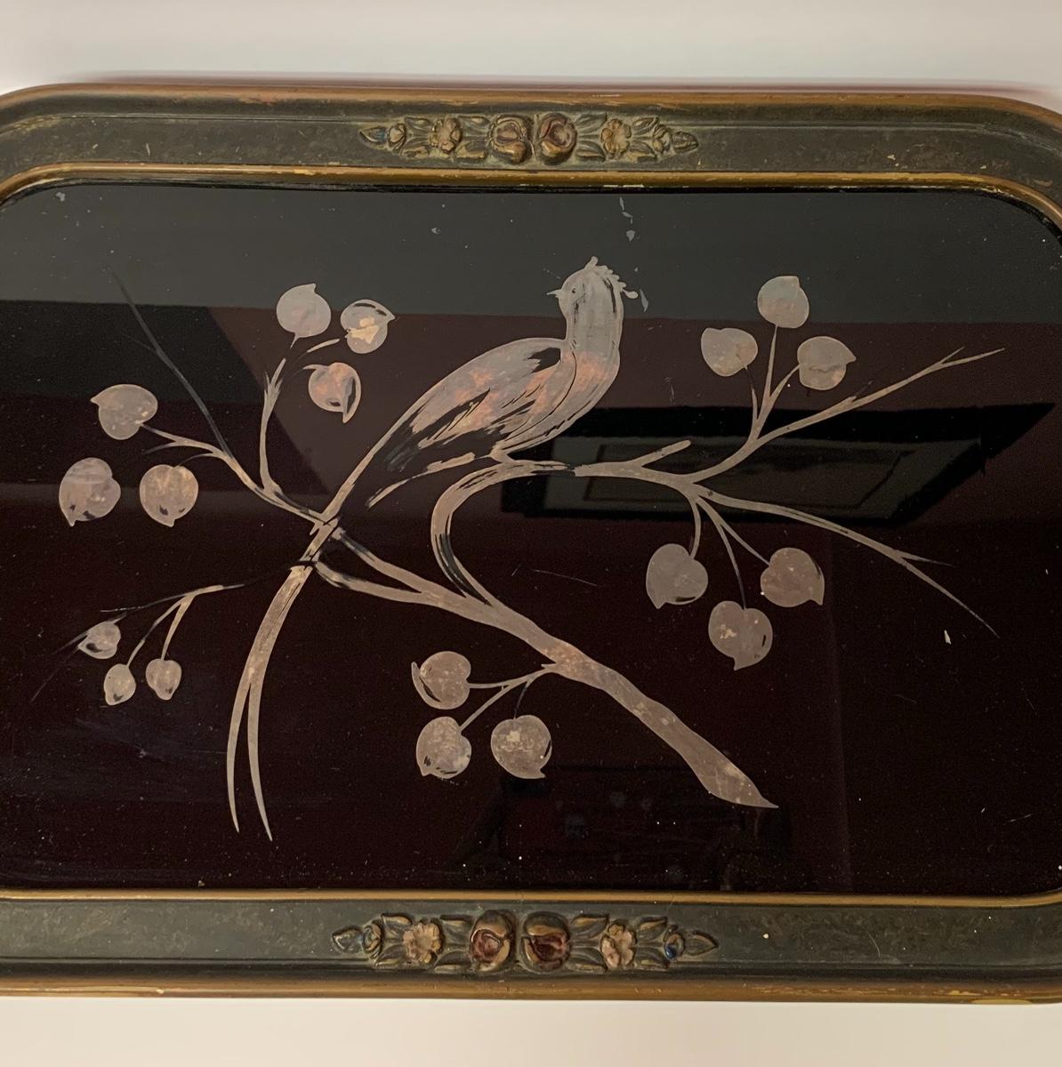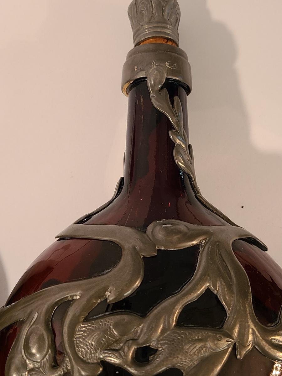 Art Deco bird style serving tray with mirrored look. Red & green wine decanters have patterned overlays. Cobalt blue bottle with overlay - stopper has small chip.
