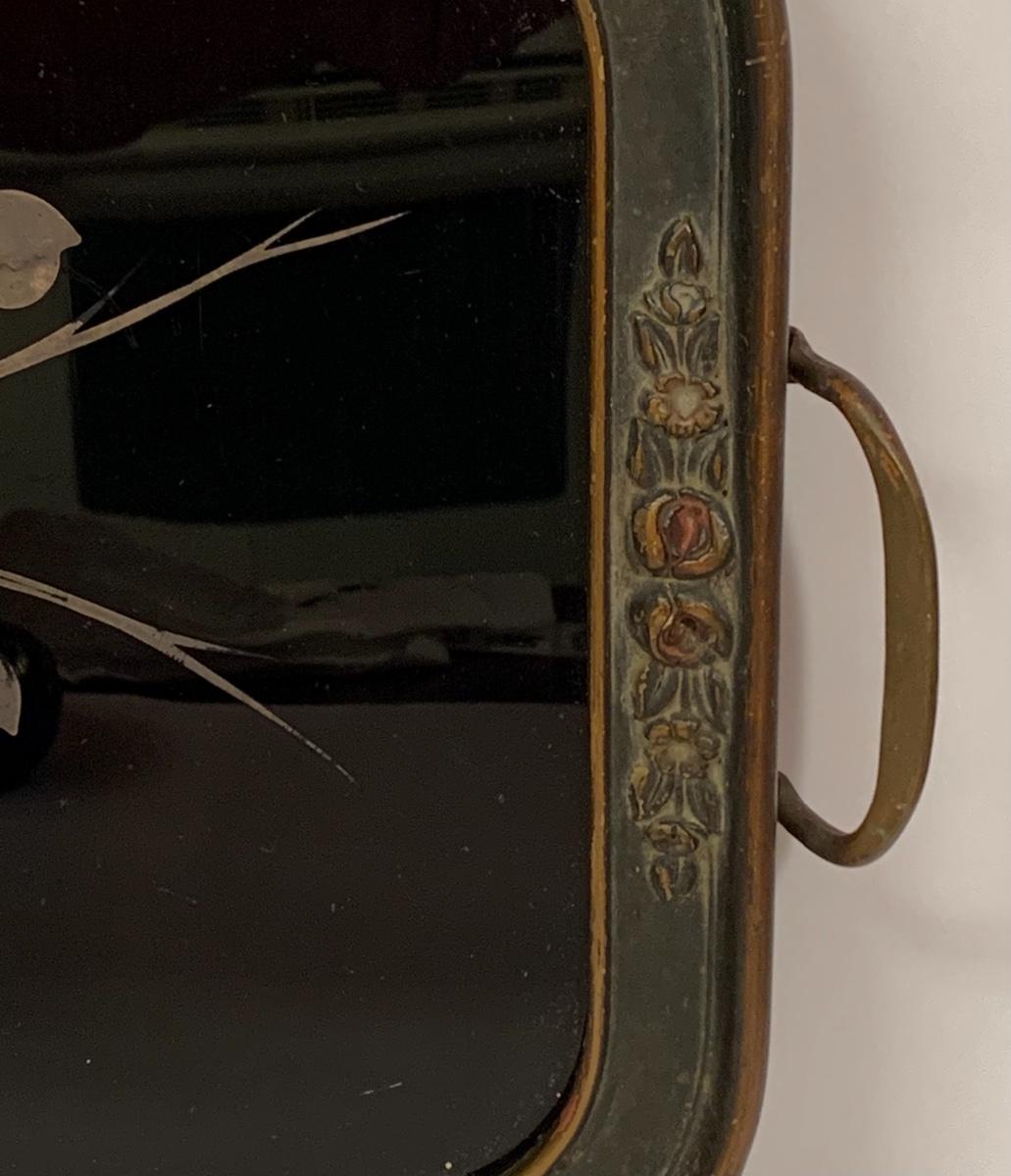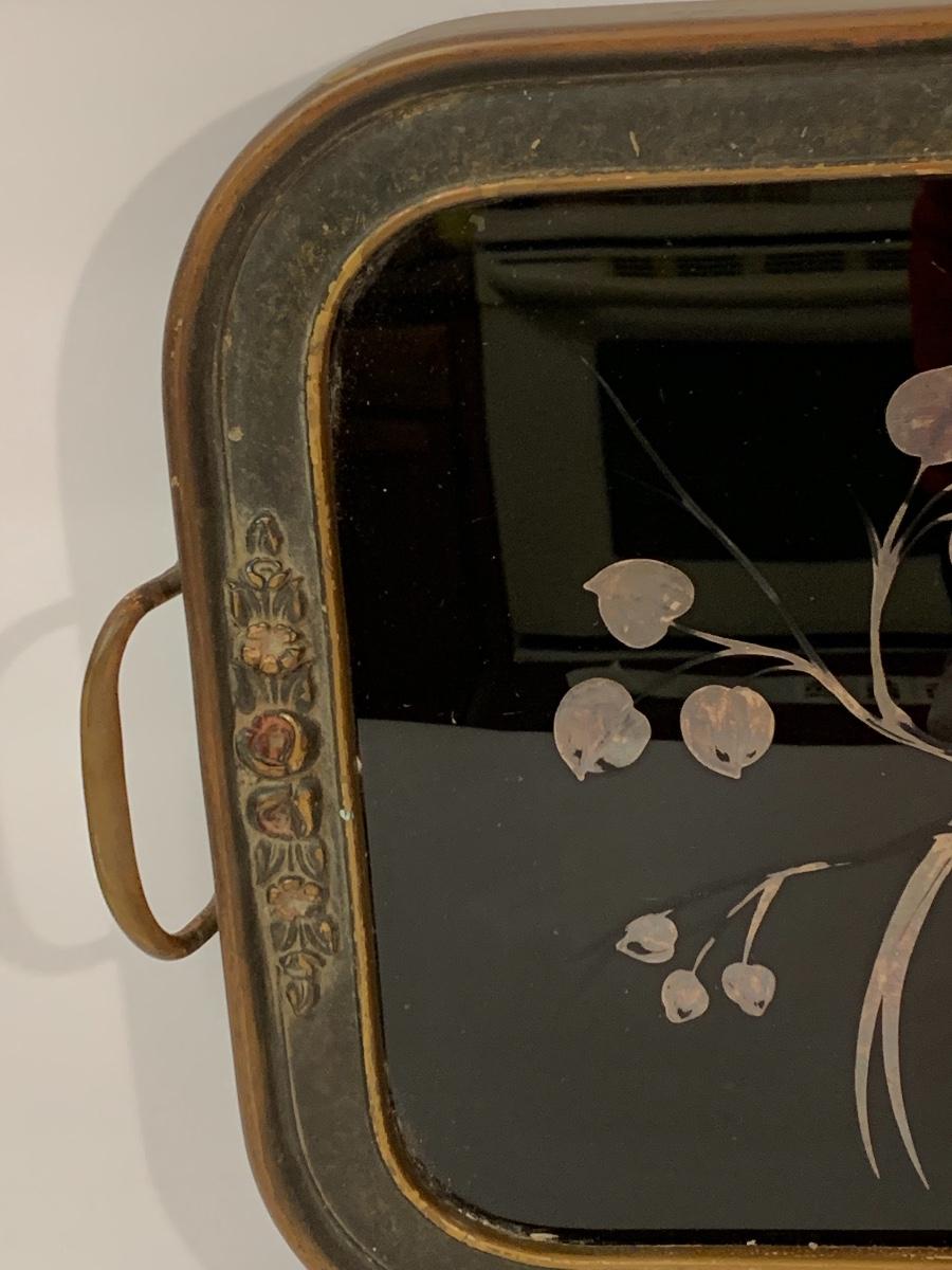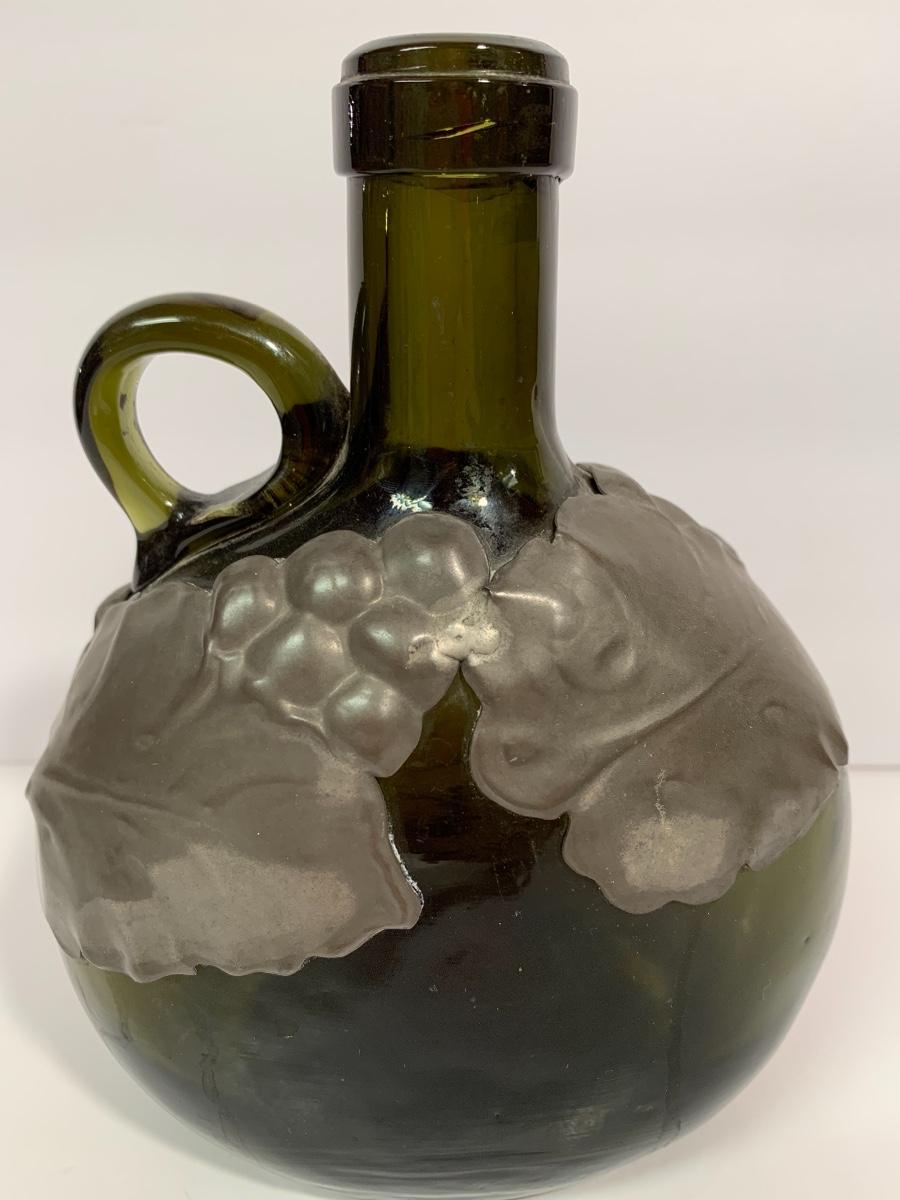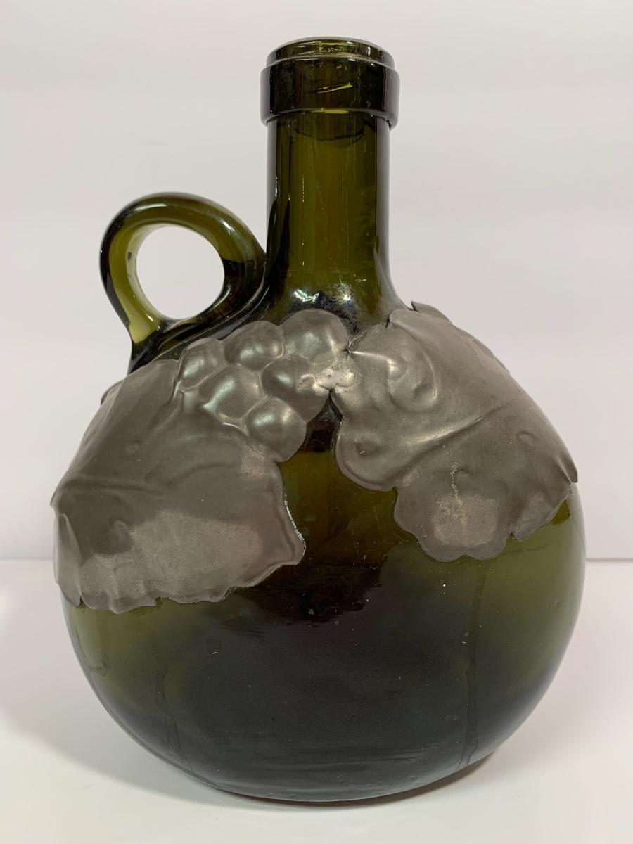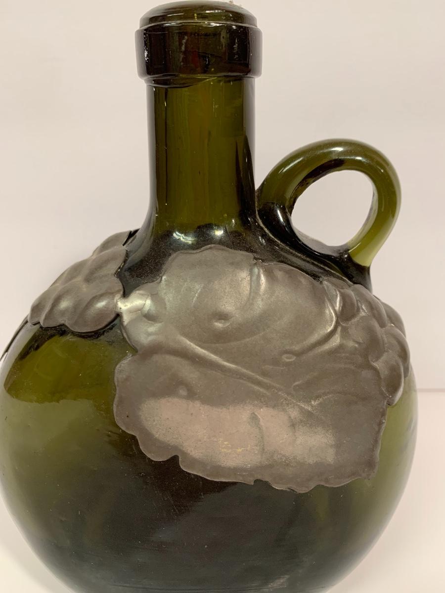 Art Deco bird style serving tray with mirrored look. Red & green wine decanters have patterned overlays. Cobalt blue bottle with overlay - stopper has small chip.