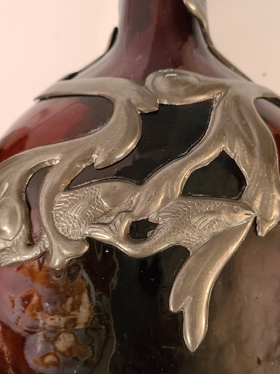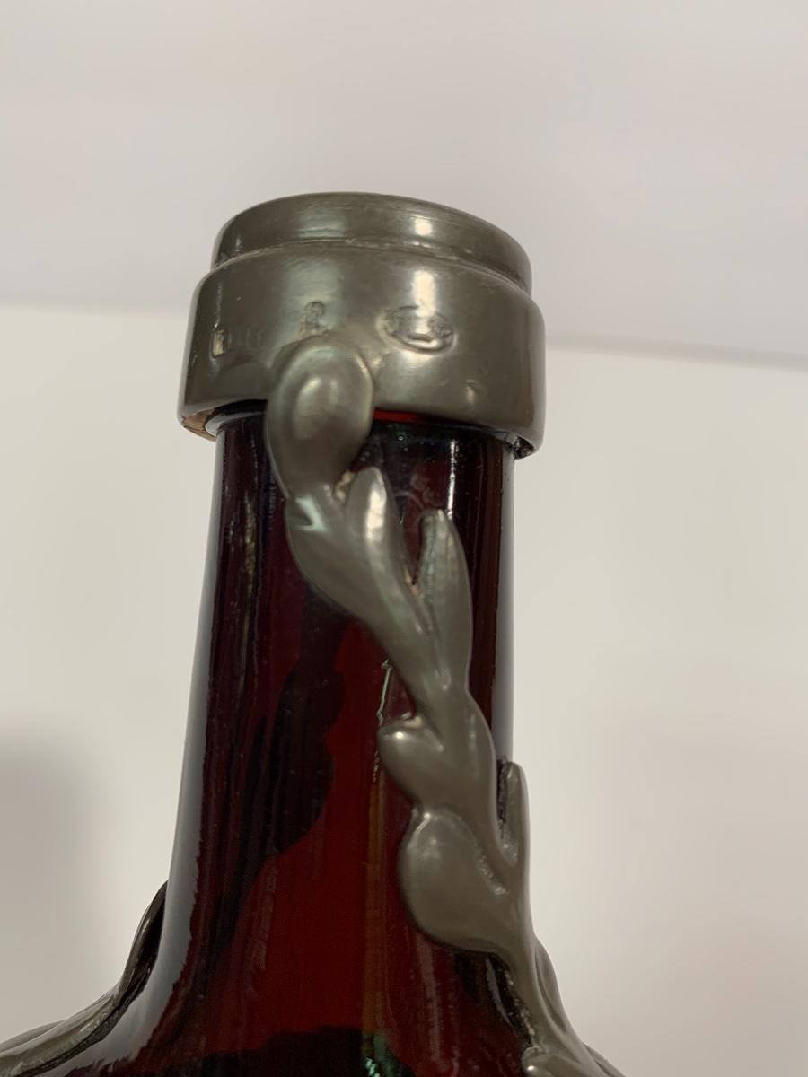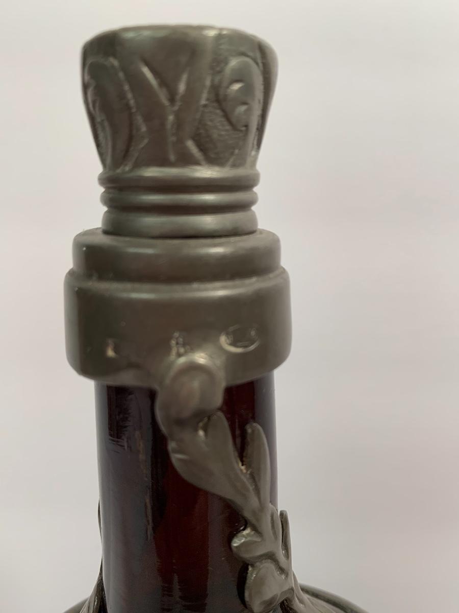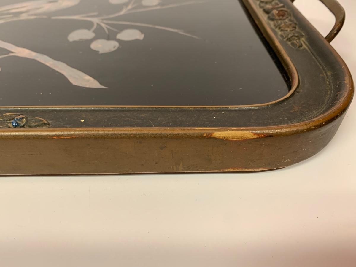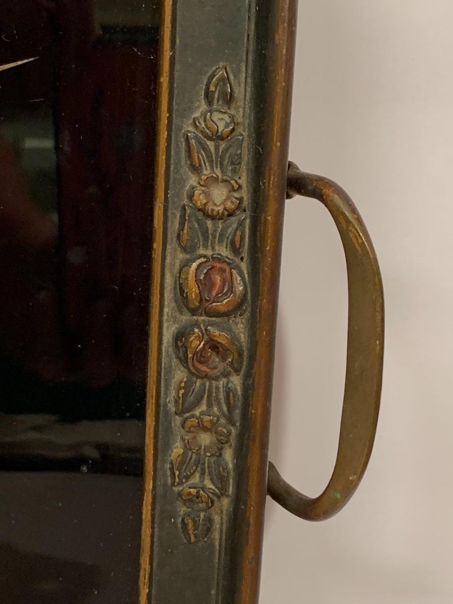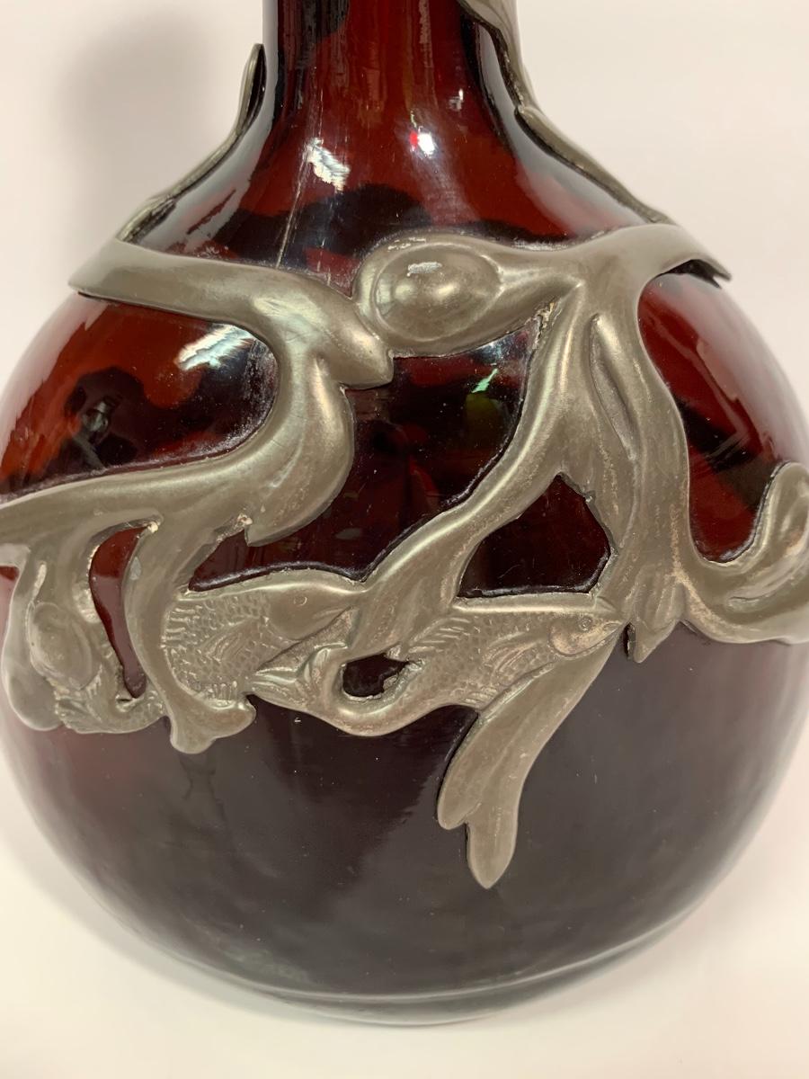Art Deco bird style serving tray with mirrored look. Red & green wine decanters have patterned overlays. Cobalt blue bottle with overlay - stopper has small chip.