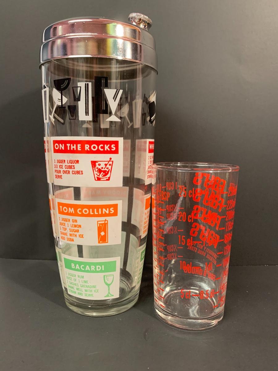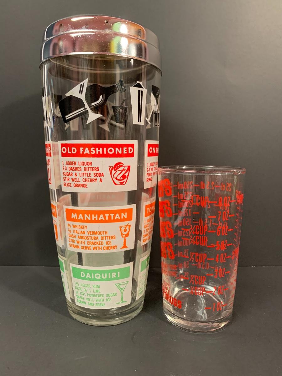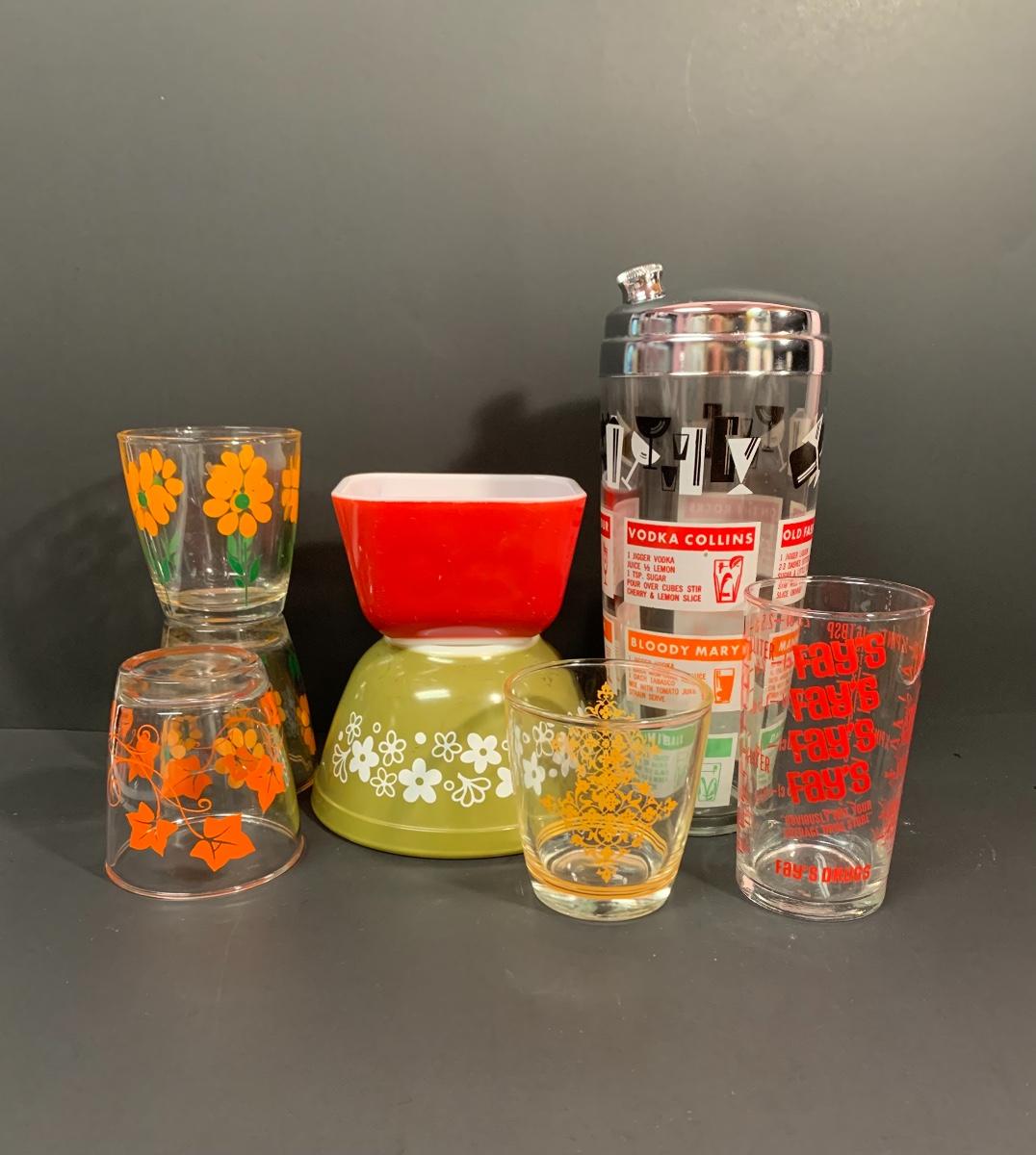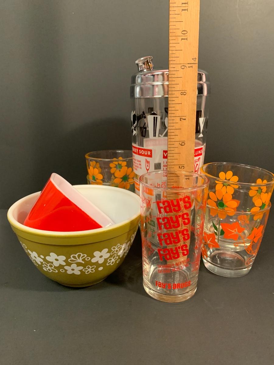 Vintage drink shaker and an advertising measuring glass. A Pyrex refrigerator dish (no lid) ,small Pyrex floral bowl along with vintage juice glasses. Please see all pictures as they are the best representation of the items. The pictures show condition, measurements if taken, and what is included in the lot. Due to the large amount that we photograph and the time frame, we are not always able to take measurements. All items unless noted, are pre-owned and have been used. If you purchased furniture, you must bring help. We do not allow one person to carry large furniture out on their own. Bring help, tools and a truck for the safety of our client’s homes, and your personal safety. Company policy. Thank you.