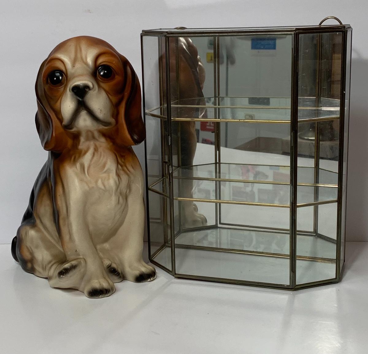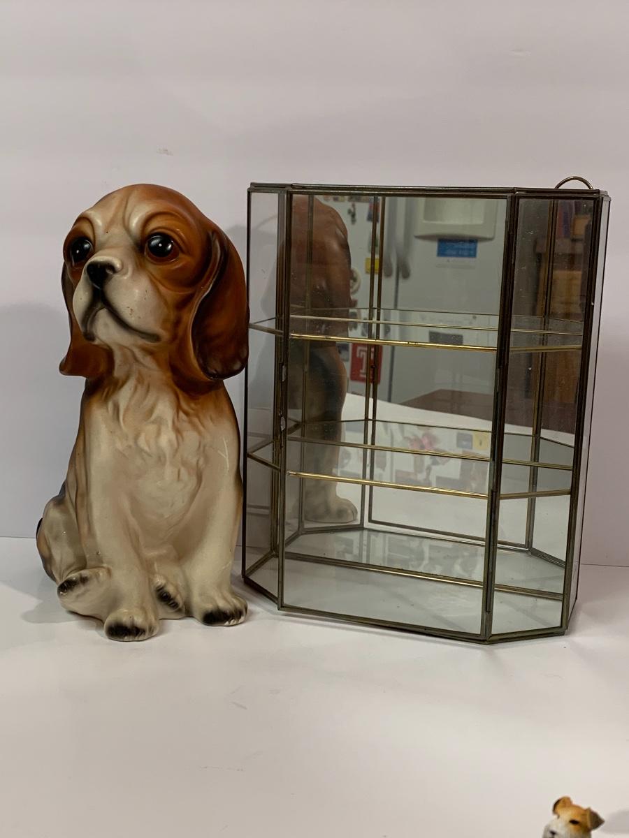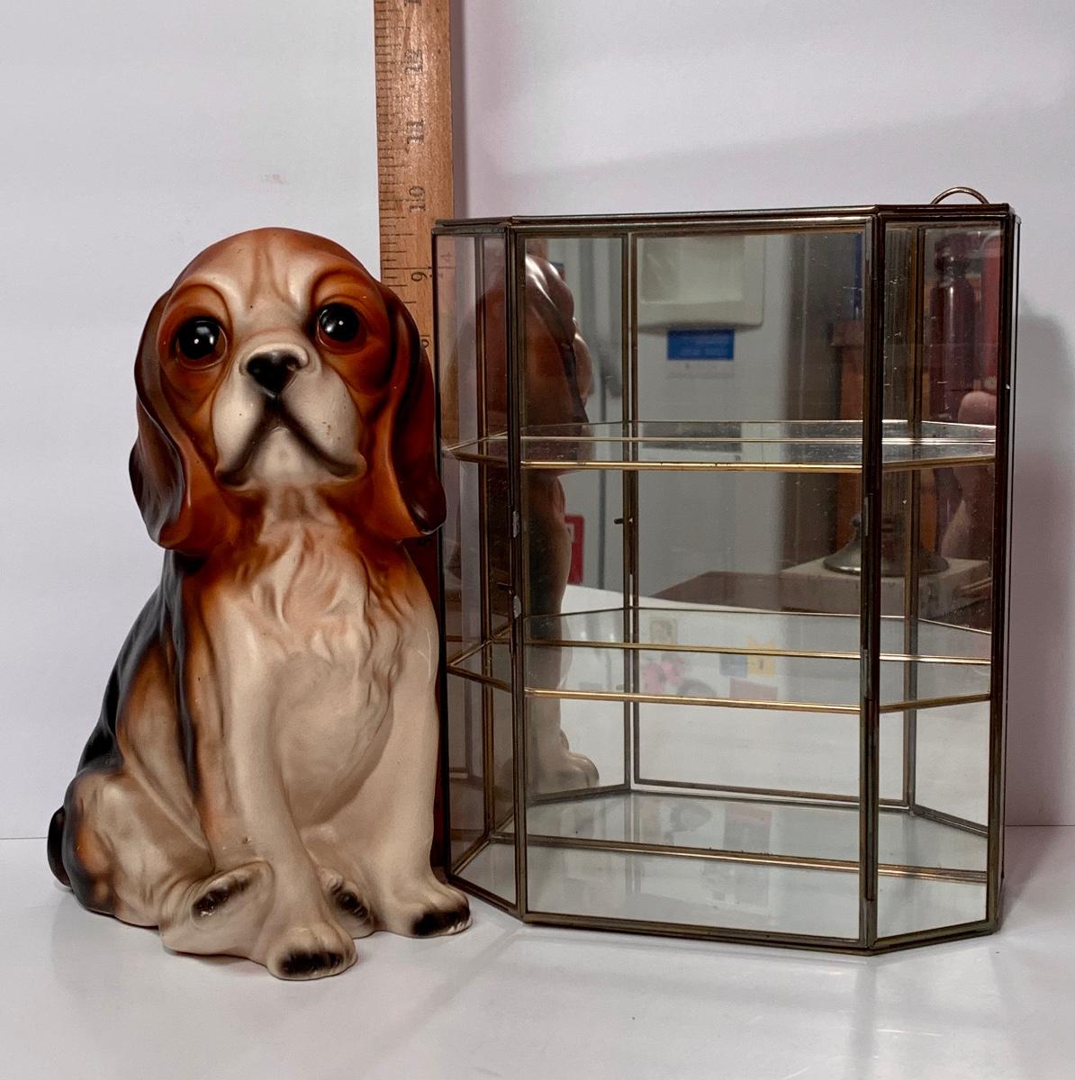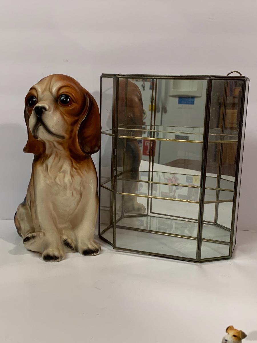 Lot 463: Mirrored Curio Cabinet, Figurines, & Vintage Ceramic Dog