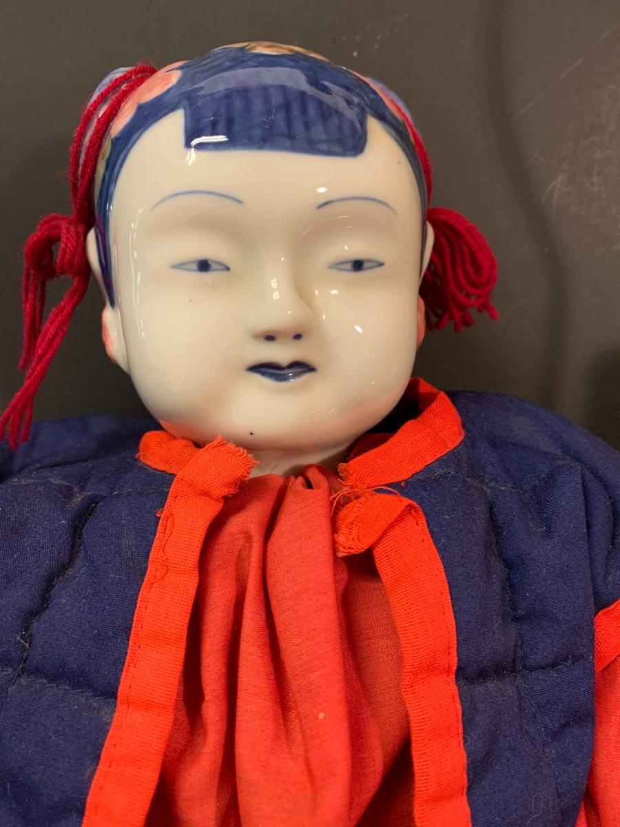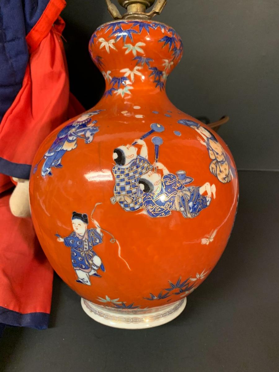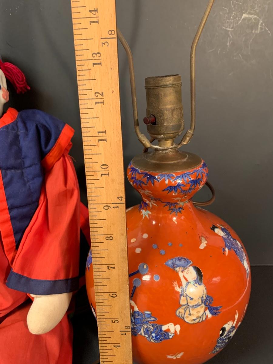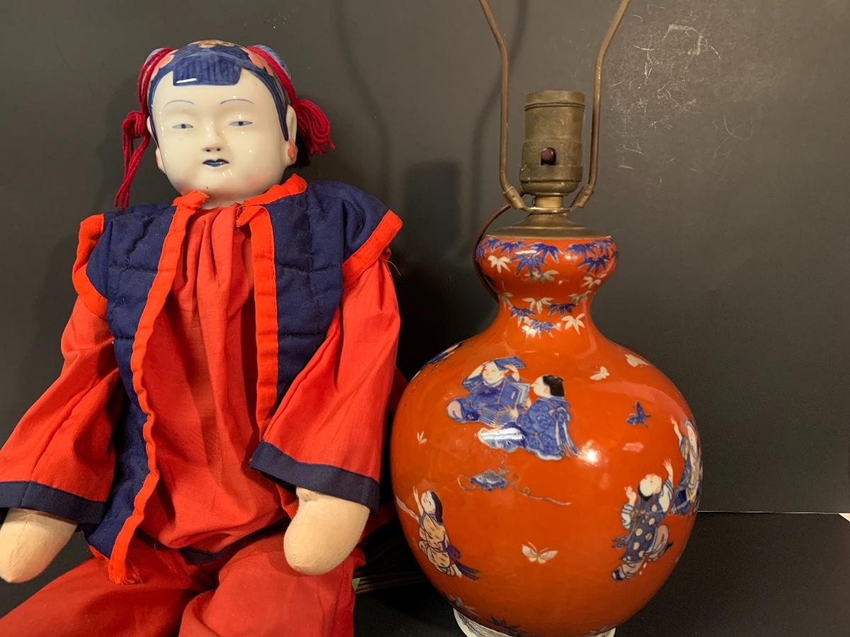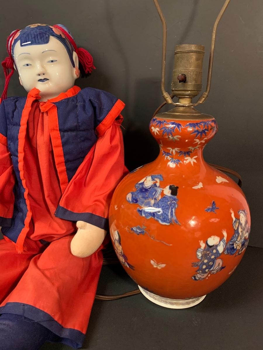Lot 497: Antique Porcelain Asian Inspired Lamp & Blue/White Face Ceremonial Cloth Body Doll