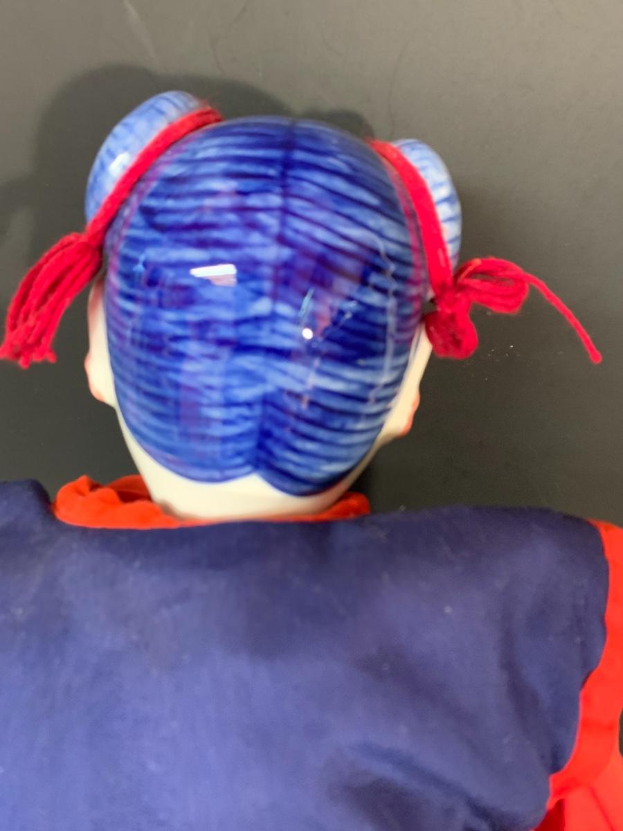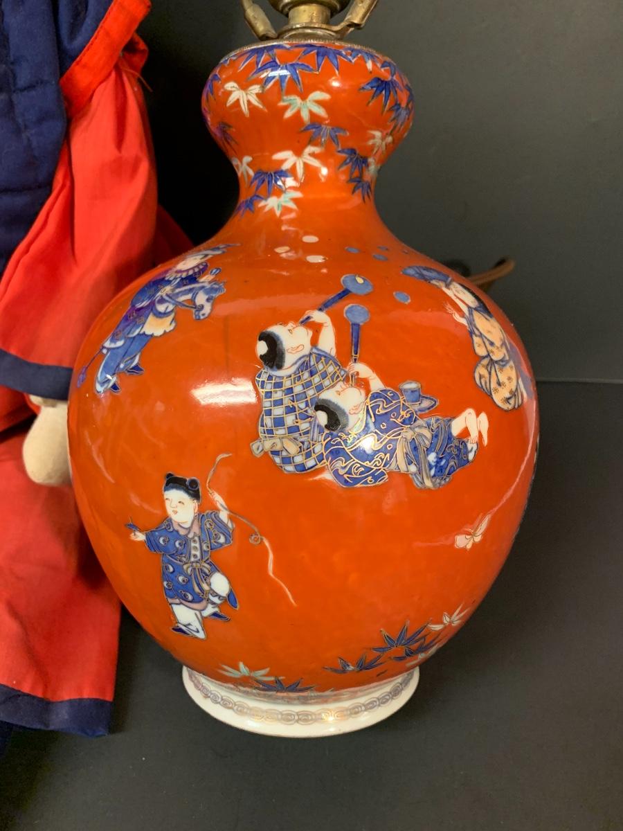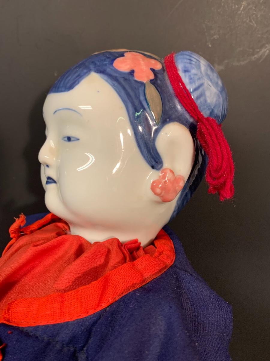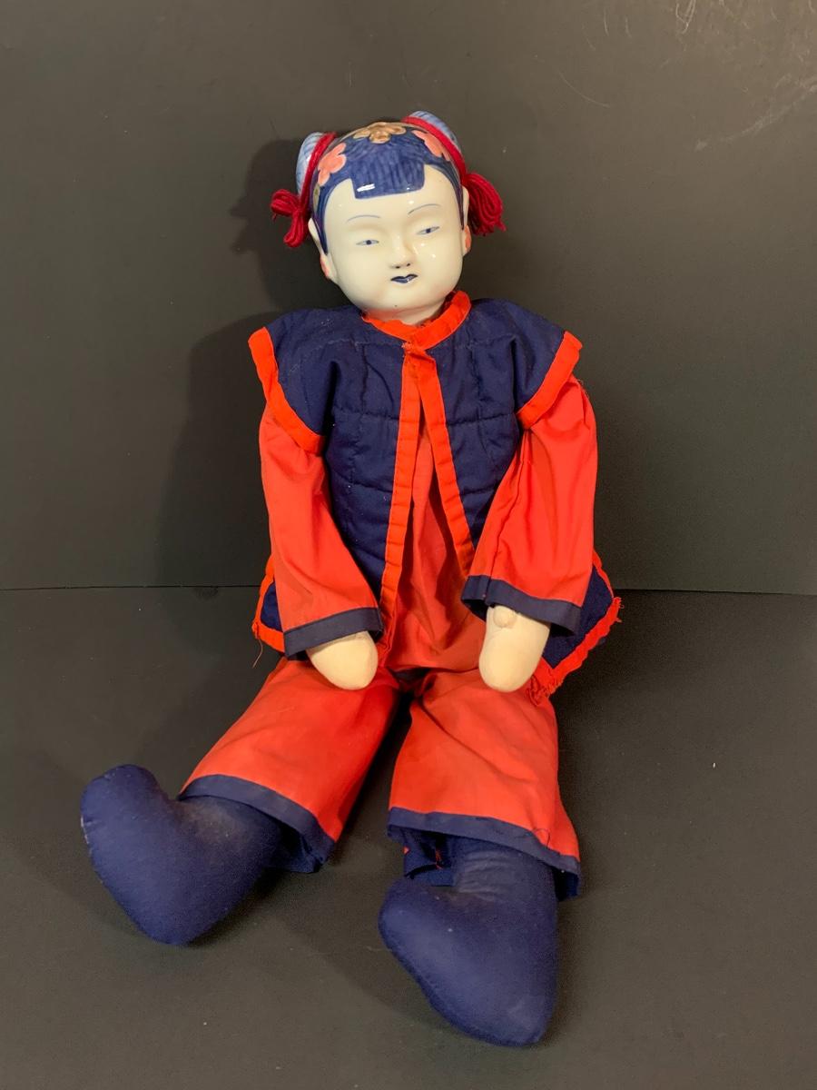 Lot 497: Antique Porcelain Asian Inspired Lamp & Blue/White Face Ceremonial Cloth Body Doll