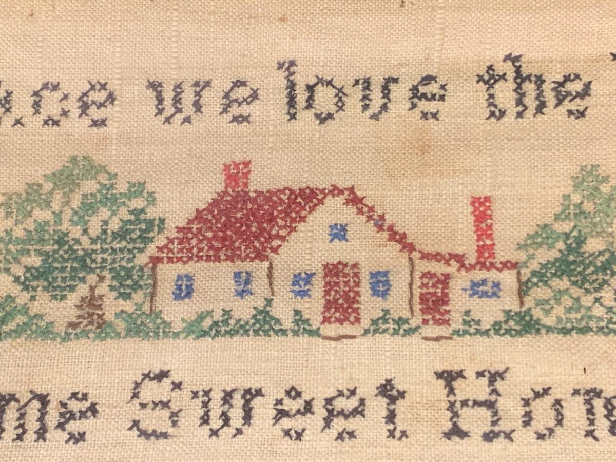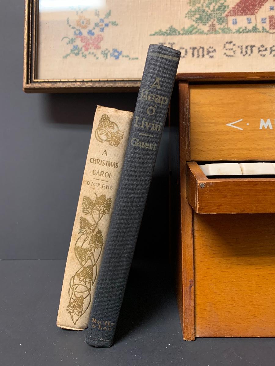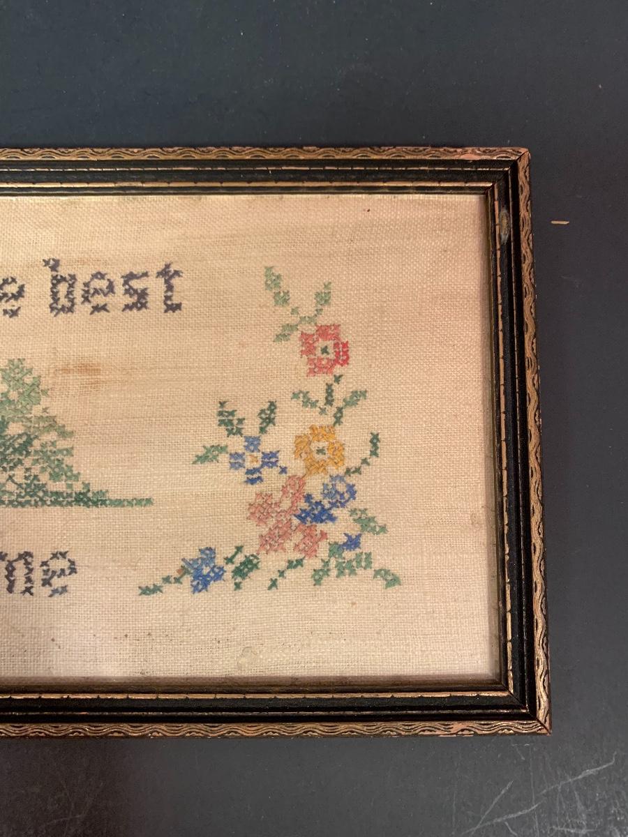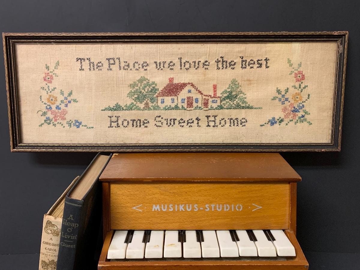 Nicely made display piano, vintage books and cross stitch for you home decor accents.