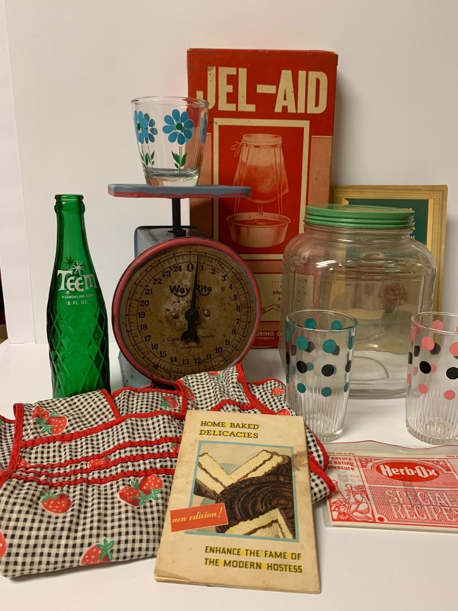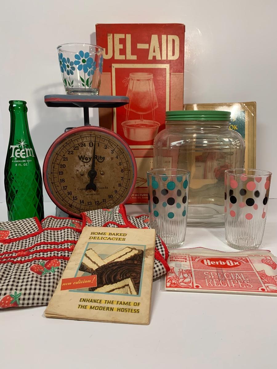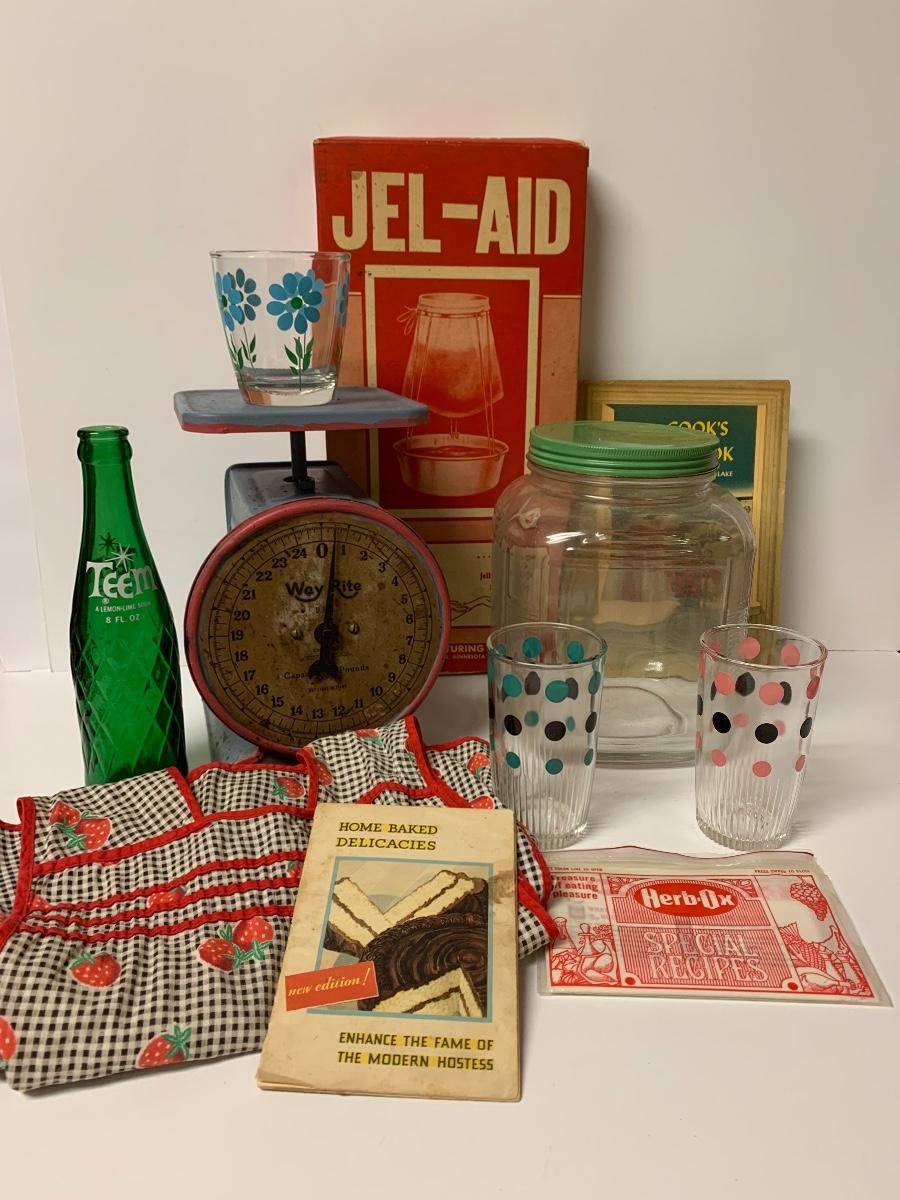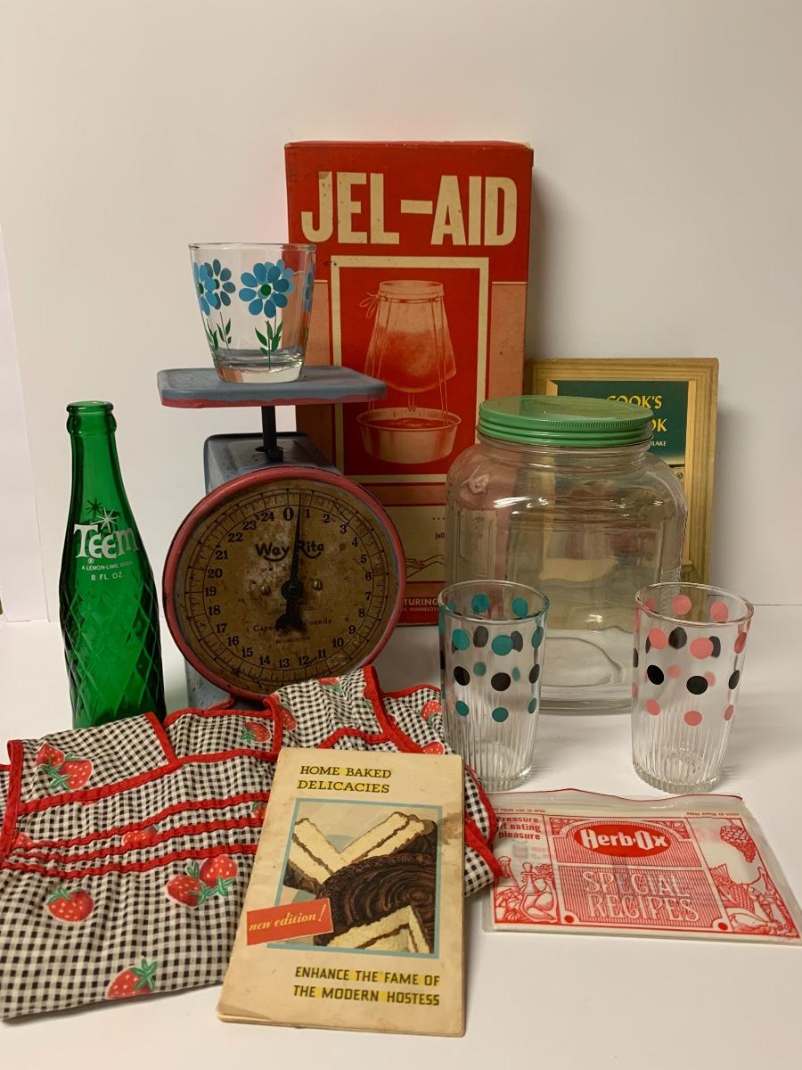 Vintage Kitchen including sour cream glass, jar, Jel-Aid for jelly making, cookbooks, apron and more