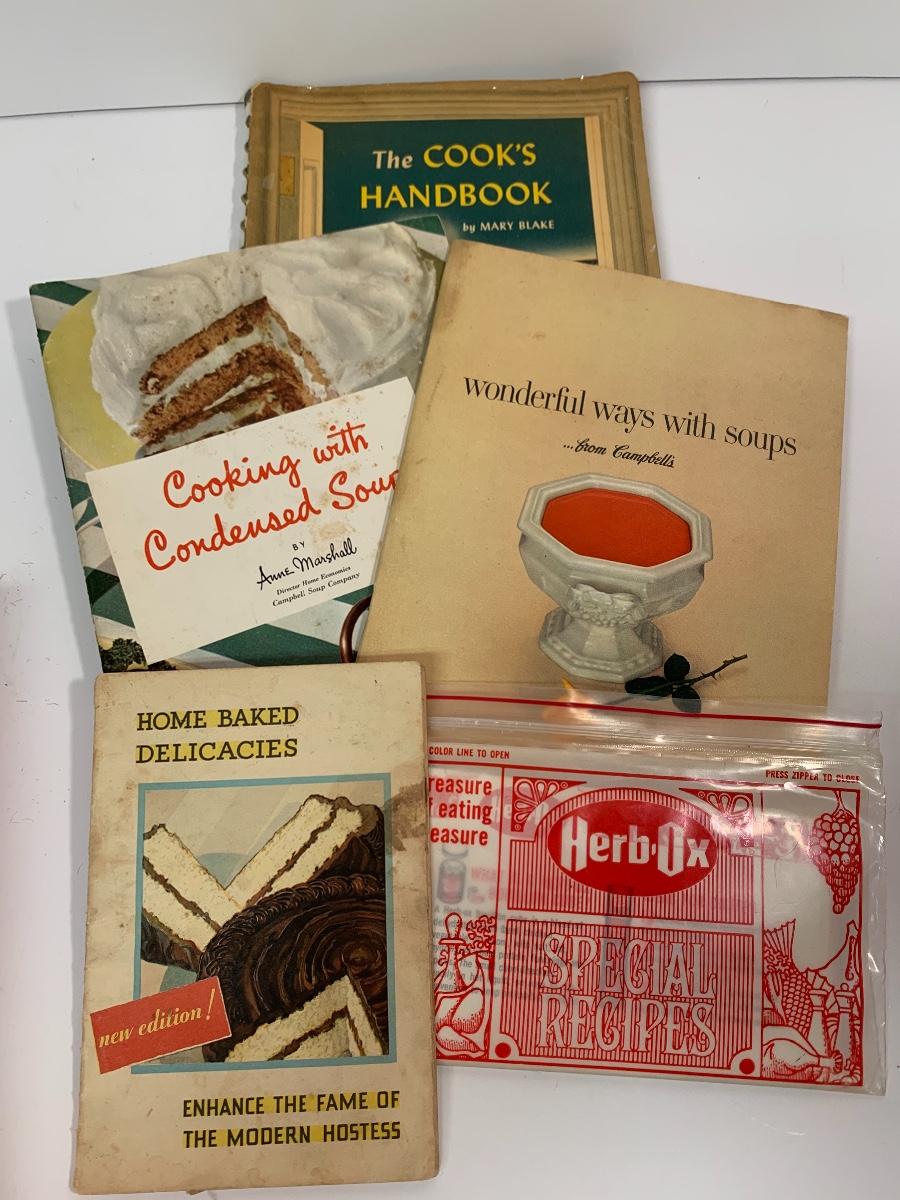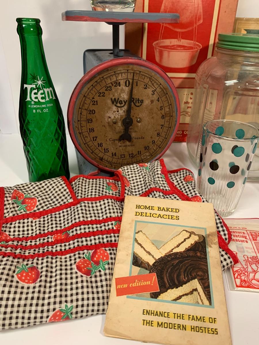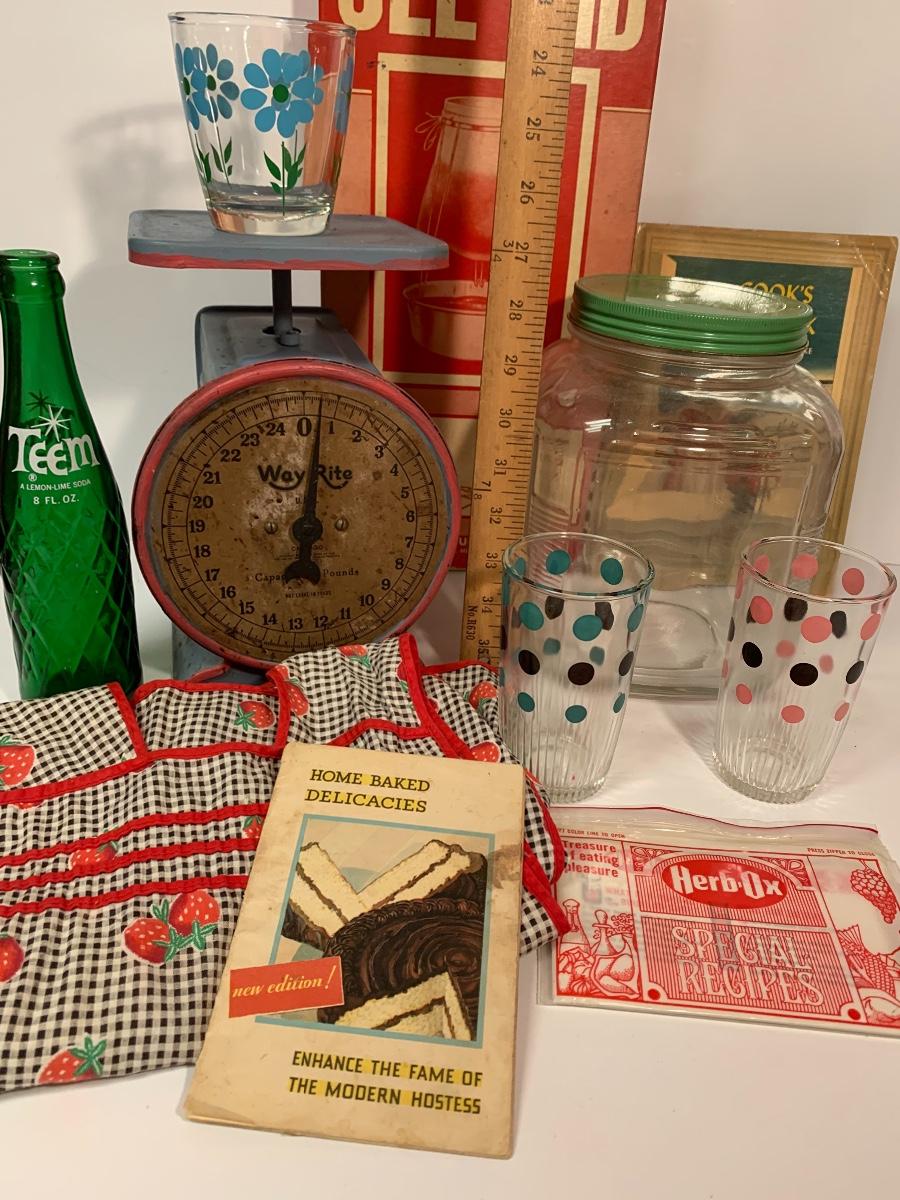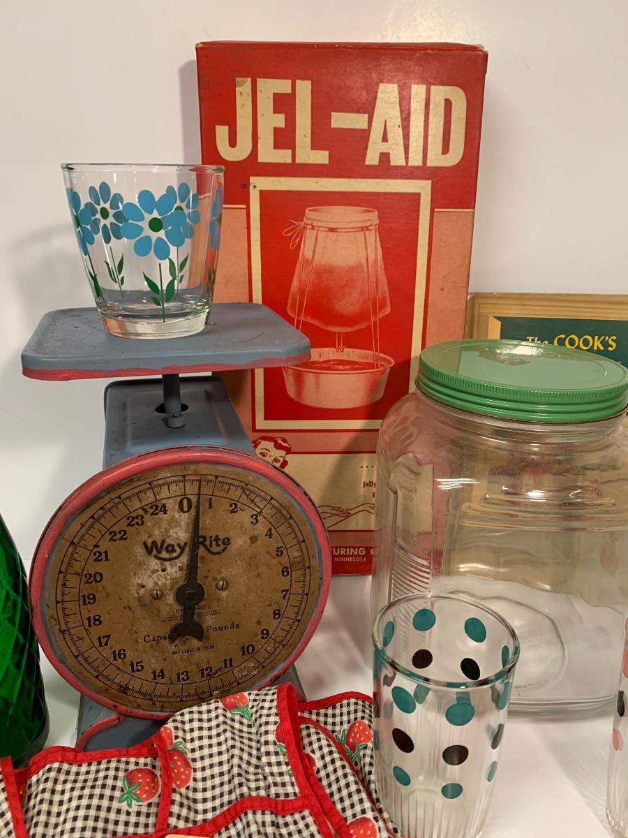 Vintage Kitchen including sour cream glass, jar, Jel-Aid for jelly making, cookbooks, apron and more
