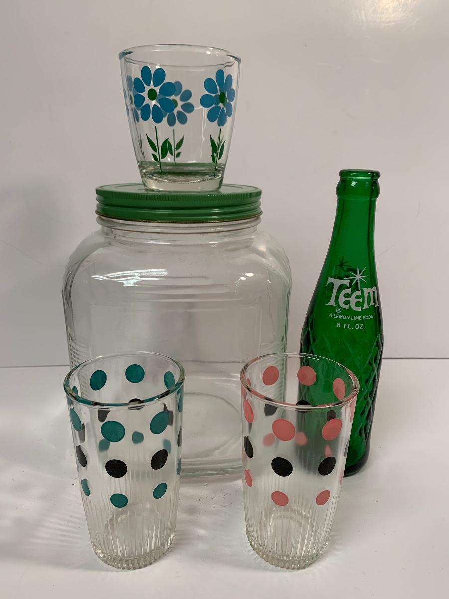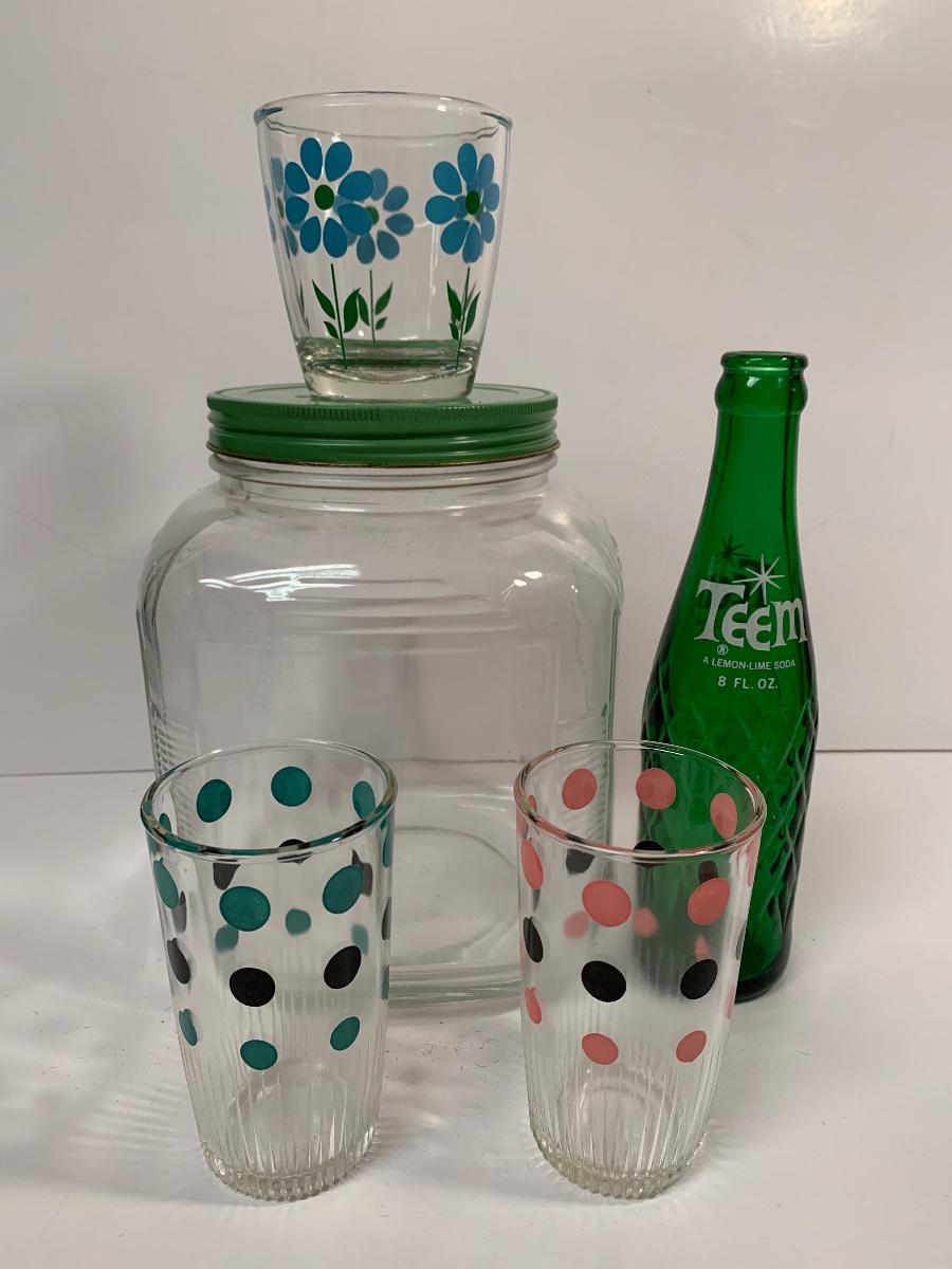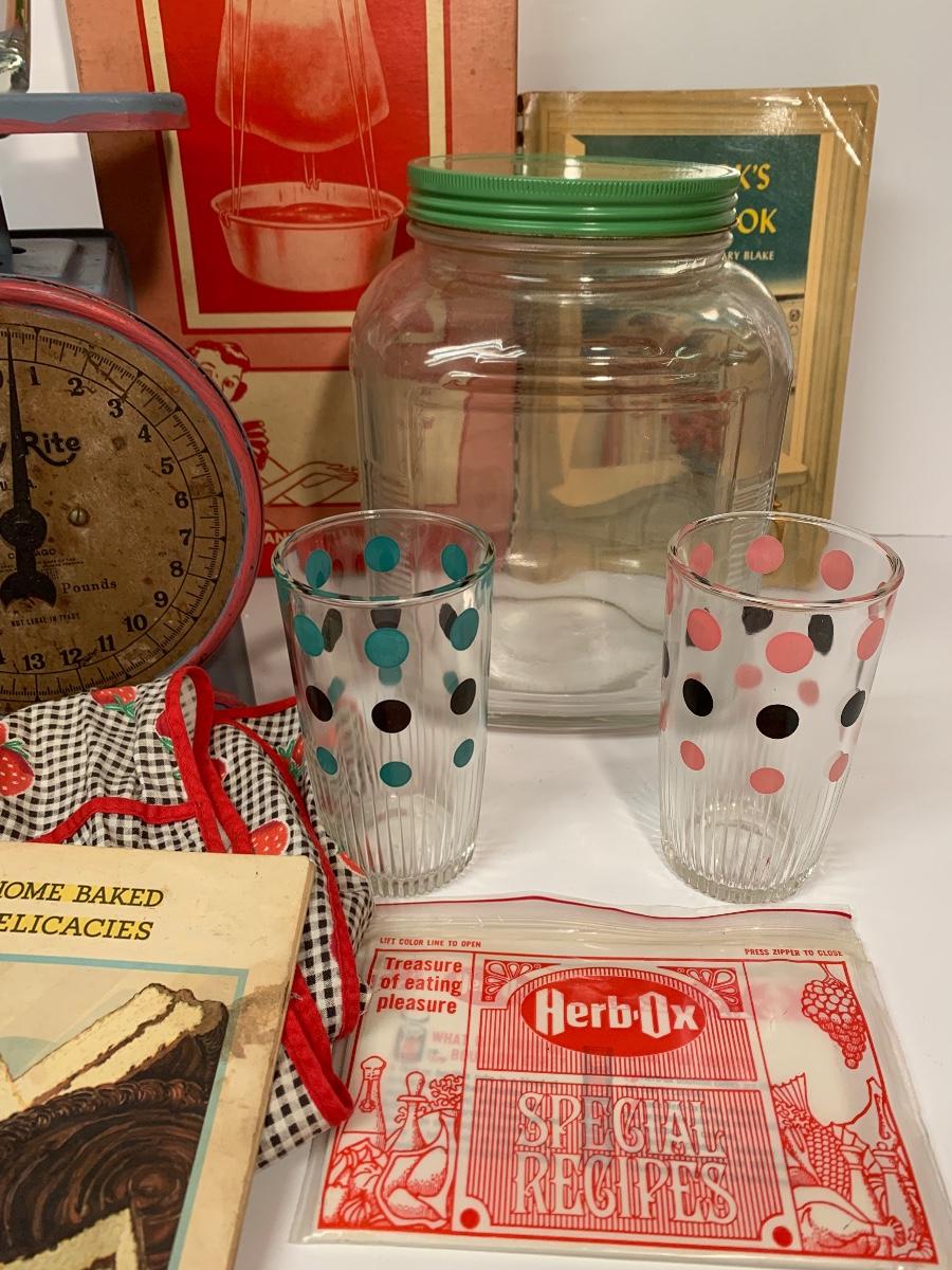Lot 79: Vintage  Polka Dot Glasses, Teem Soda Bottle Kitchen Scale, Jar & More