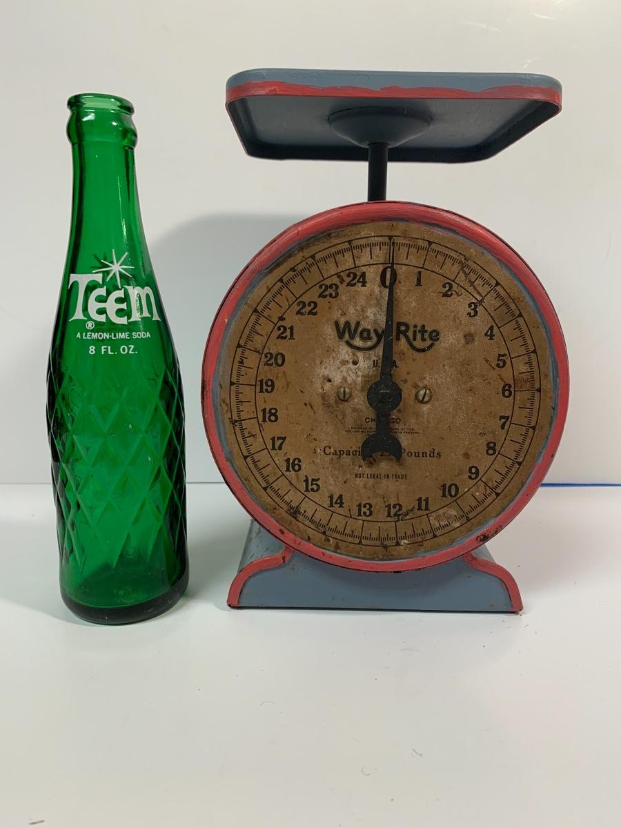 Lot 79: Vintage Polka Dot Glasses, Teem Soda Bottle Kitchen Scale, Jar & More