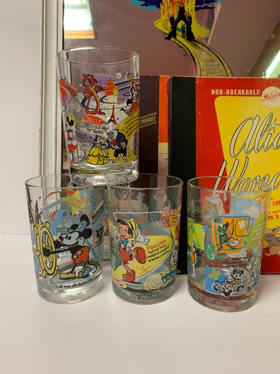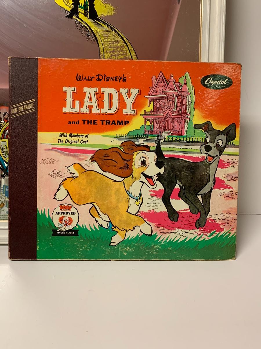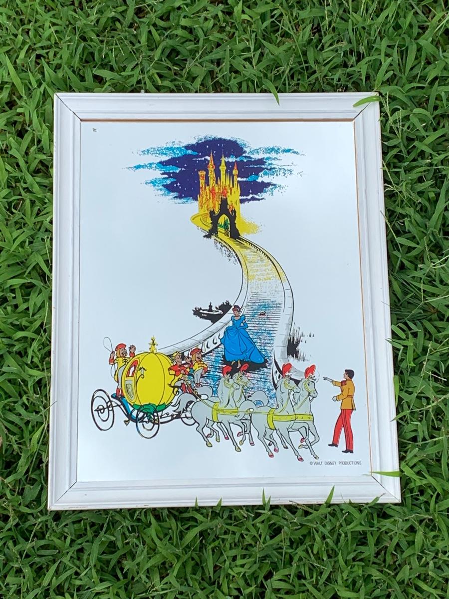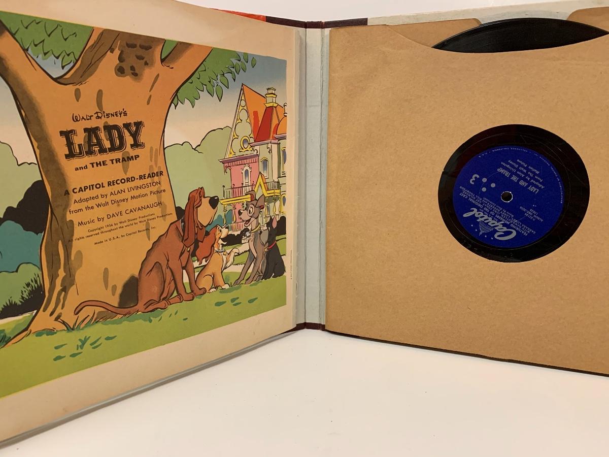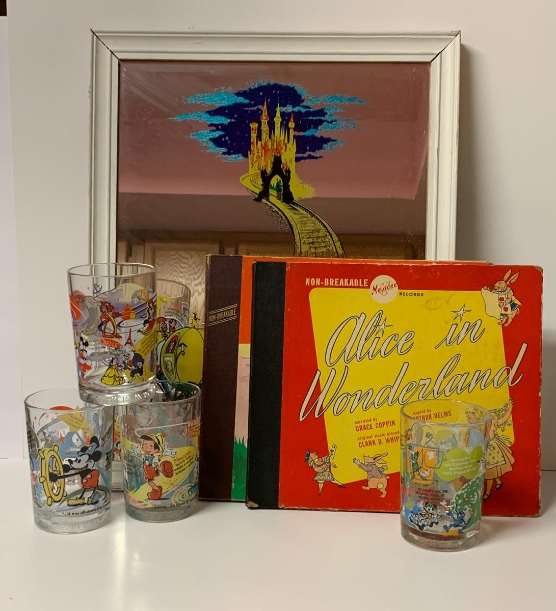 This Disney lot includes 2 vintage LP's: Alice in Wonderland and The Lady & The Tramp. The Lady & The Tramp is a read along book & record. 100th anniversary Disney glasses, Framed Cinderella mirror (16 x 20).