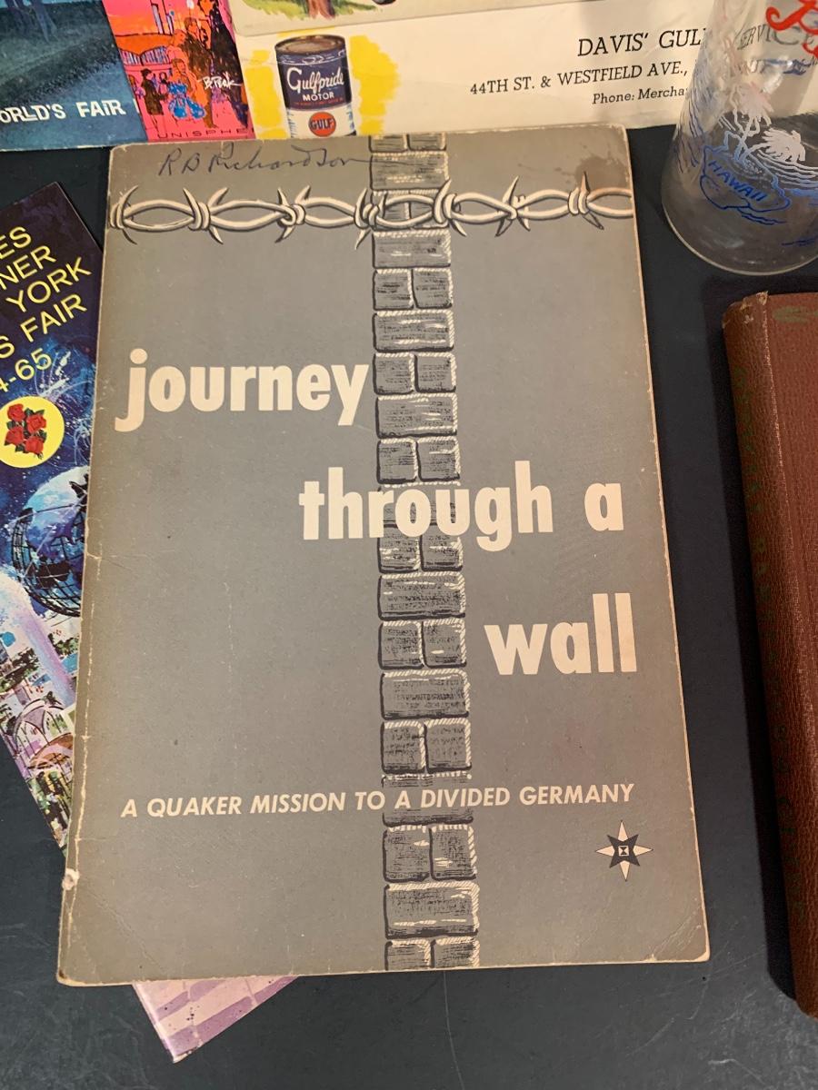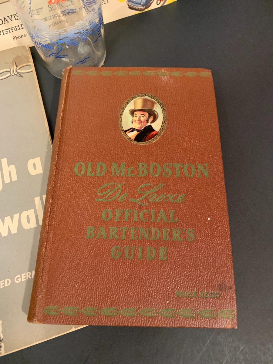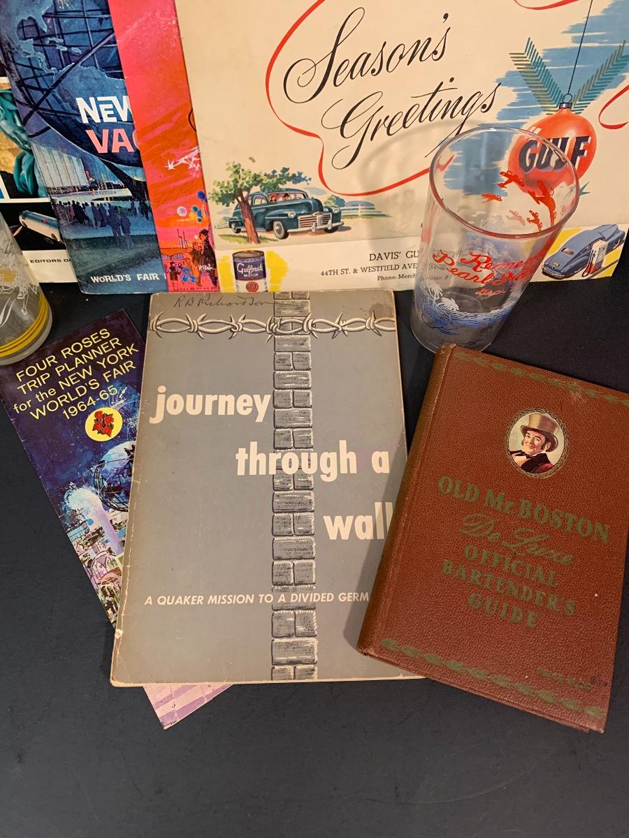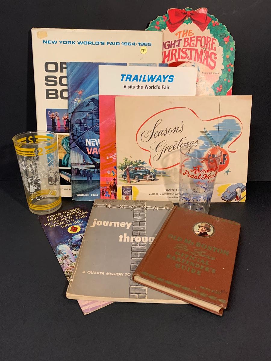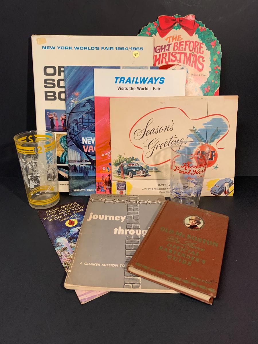 Vintage Bartenders Guide, Gulf 1950 calendar, vintage paper Christmas book, along with vintage commemorative drinking glasses.