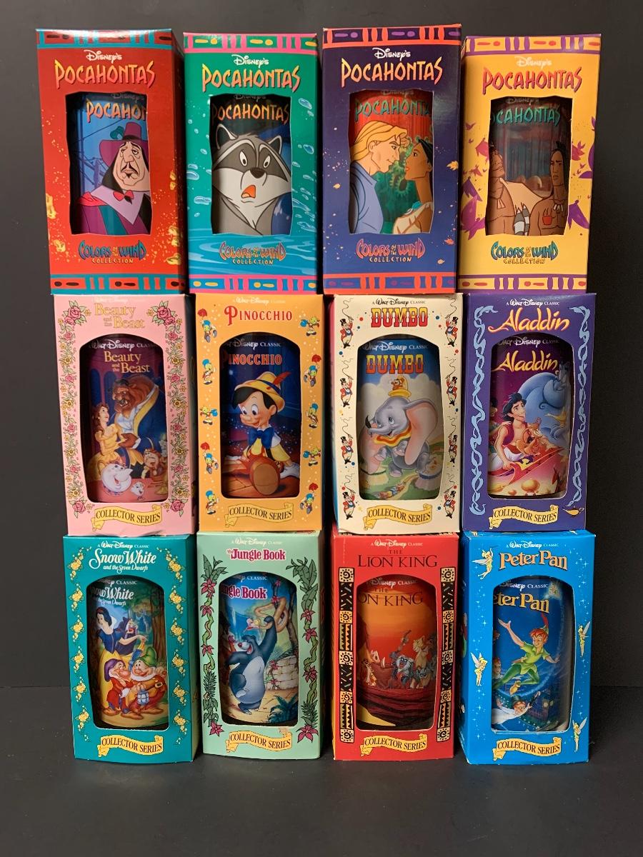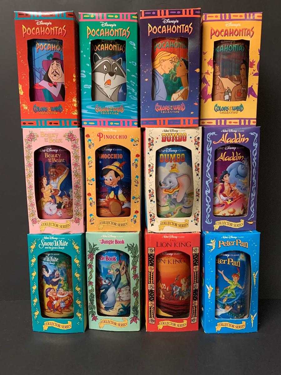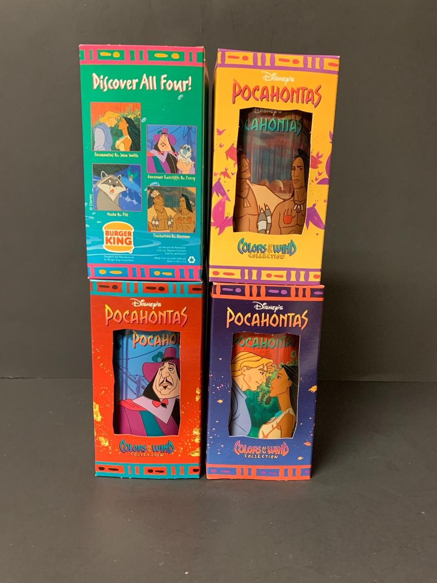 Plastic collector cups/glasses from Burger King sponsored by Coke a Cola. Complete set of 4 Pocahontas & Complete set of 8 Disney Series.
